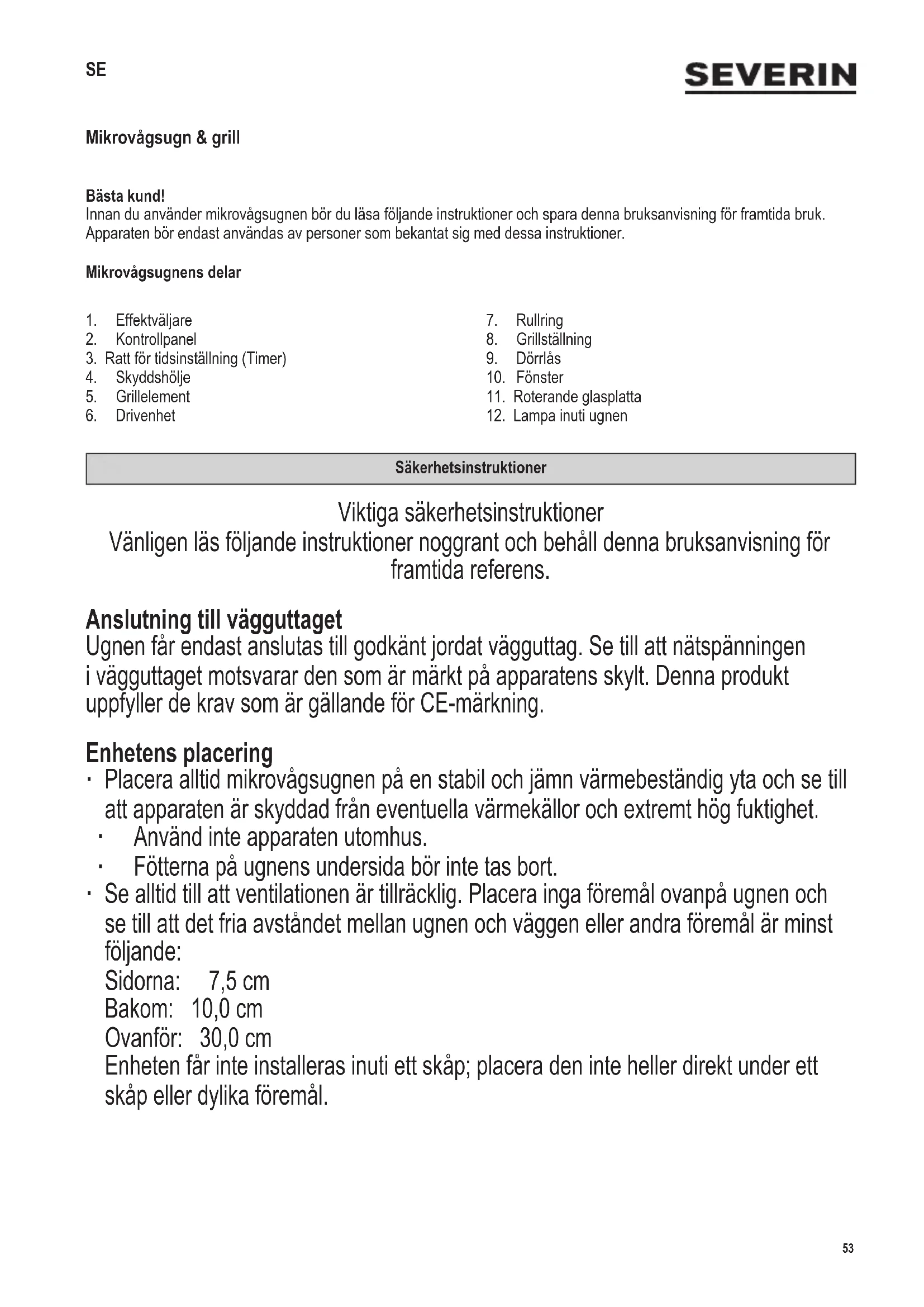 Säkerhetsinstruktioner Viktiga säkerhetsinstruktioner Vänligen läs följande instruktioner noggrant och behåll denna bruksanvisning för framtida referens. Anslutning till vägguttaget Ugnen får endast anslutas till godkänt jordat vägguttag. Se till att nätspänningen i vägguttaget motsvarar den som är märkt på apparatens skylt. Denna produkt uppfyller de krav som är gällande för CE-märkning. Enhetens placering ∙ Placera alltid mikrovågsugnen på en stabil och jämn värmebeständig yta och se till att apparaten är skyddad från eventuella värmekällor och extremt hög fuktighet. ∙ Använd inte apparaten utomhus. ∙ Fötterna på ugnens undersida bör inte tas bort. ∙ Se alltid till att ventilationen är tillräcklig. Placera inga föremål ovanpå ugnen och se till att det fria avståndet mellan ugnen och väggen eller andra föremål är minst följande: Sidorna: 7,5 cm Bakom: 10,0 cm Ovanför: 30,0 cm Enheten får inte installeras inuti ett skåp; placera den inte heller direkt under ett skåp eller dylika föremål.54 142 x 208 mm Viktigt att veta ∙ Varning: Vissa typer av matprodukter kan fatta eld. Lämna under inga omständigheter apparaten utan tillsyn när någon av mikrovågs-, grill- eller kombinationsfunktionerna är i användning. ∙ Denna mikrovågsugn är endast ämnad för upptining, värmning och tillagning av mat. Varning: Försök att värma upp torra matprodukter eller kläder, värmedynor, tofor, tvättsvampar, våta rengöringsdukar etc. kan leda till förbränningsskador eller eldsvåda. ∙ Inget ansvar accepteras för skada som uppstått genom otillbörlig användning eller om dessa instruktioner inte åtföljts. ∙ Använd endast kärl lämpliga för användning i mikrovågsugn. Använd inte behållare av metall när du värmer upp mat eller dryck med mikrovågsfunktionen. För mer information, se avsnittet Använd alltid lämpliga kokkärl. ∙ Apparaten bör inte användas med hjälp av en extern timer eller separat fjärrkontroll. ∙ Denna apparat kan användas av barn (minst 8 år gamla) och av personer som har minskad fysisk rörelseförmåga, reducerat sinnes- eller mentaltillstånd, eller som har bristfällig erfarenhet och kunskap, förutsatt att dessa personer är under uppsyn eller har fått tillräckliga instruktioner beträffande apparatens användning och vet vilka risker och säkerhetsåtgärder som användningen innefattar. ∙ Barn bör inte tillåtas leka med apparaten. ∙ Barn får inte tillåtas utföra rengöring eller underhåll utan övervakning. ∙ Apparaten och dess elsladd bör hållas utom räckhåll för barn under 8 år. ∙ På grund av risken för elektrisk stöt bör apparaten inte rengöras eller doppas i vatten. ∙ Varning: På grund av de höga temperaturerna som uppstår vid användning av kombinationsfunktionerna bör barn inte använda apparaten ifall de inte är övervakade av en vuxen. ∙ Under användning av kombinations- eller grillfunktionerna bör du vara extremt noga med att inte röra de inre värmeelementen. ∙ Använd inga ångapparater för att rengöra ugnen. ∙ Stäng alltid av apparaten och dra stickproppen ur vägguttaget: - innan rengöring påbörjas, - om apparaten skulle upphöra att fungera. - efter varje användning. ∙ Ta stickproppen ur vägguttaget genom att dra i stickproppen, aldrig i sladden.55 142 x 208 mm ∙ Varning: Apparatens yttre ytor kan bli heta under användningen. Det nns också en risk för att ånga kommer ut genom ventilationsöppningarna vilket leder till risk för skållning. ∙ Låt inte mikrovågsugnen eller dess elsladd komma i beröring med heta ytor eller i kontakt med andra heta källor. Låt inte sladden hänga fritt och se till att den inte kommer i beröring med heta föremål. ∙ Om enheten inte hålls ren kan en försämring av ytornas kvalitet uppstå vilket kan leda till att apparatens livslängd förkortas och att användarens säkerhet utsätts för potentiell risk. Eventuella matrester bör därför avlägsnas omedelbart. Se avsnittet Rengöring för detaljerad information om hur apparaten bör rengöras. ∙ Apparaten är avsedd för hemmabruk eller liknande användning, såsom - i personalkök, kontor och andra kommersiella miljöer, - i företag inom jordbrukssektorn, - för gäster i hotell, motell och liknande inkvarteringsställen, - för kunder i bed-and-breakfast hus. ∙ Varning: Underhåll eller reparation som fordrar att mikrovågsugnens strålningsskydd tas bort är en allvarlig fara för personer som inte är fackmän inom området. Detta gäller också byte av elsladden och mikrovågsugnens lampa. Enheten bör endast öppnas av behörig personal. Om reparation behövs bör mikrovågsugnen sändas till vår kundservice. Adressen nner du i bilagan till denna bruksanvisning. ∙ När du värmer vätskor i din mikrovågsugn, kan vätskan hettas över kokpunkten utan att vätskan börjar bubbla. Därför är det viktigt att du är ytterst försiktig när du handskas med olika kärl, t.ex. när du tar dem ur ugnen. Risken för sådan överhettning kan minskas genom att man placerar en värmebeständig glasstav i kärlet under värmningsprocessen. ∙ Hela råa ägg eller hela hårdkokta ägg får inte värmas i mikrovågsugn eftersom de kan explodera t.o.m. efter det att mikrovågsugnen stängts av. ∙ Varning: Det är även mycket farligt att värma upp vätskor eller fasta matprodukter i stängda behållare i mikrovågsugnen p g a hög risk för explosion. ∙ Innehållet i nappaskor eller glasburkar med babymat måste omröras eller skakas noggrant så att temperaturen fördelas jämnt. Kontrollera alltid matens temperatur innan du matar barnet så att brännskador kan undvikas. ∙ När du värmer eller tillagar mat i kärl som är gjorda av brännbart material såsom plast eller papper, eller om maten är förpackad i dessa material, nns det en risk att materialen antänds. Det är även möjligt att maten blir ut