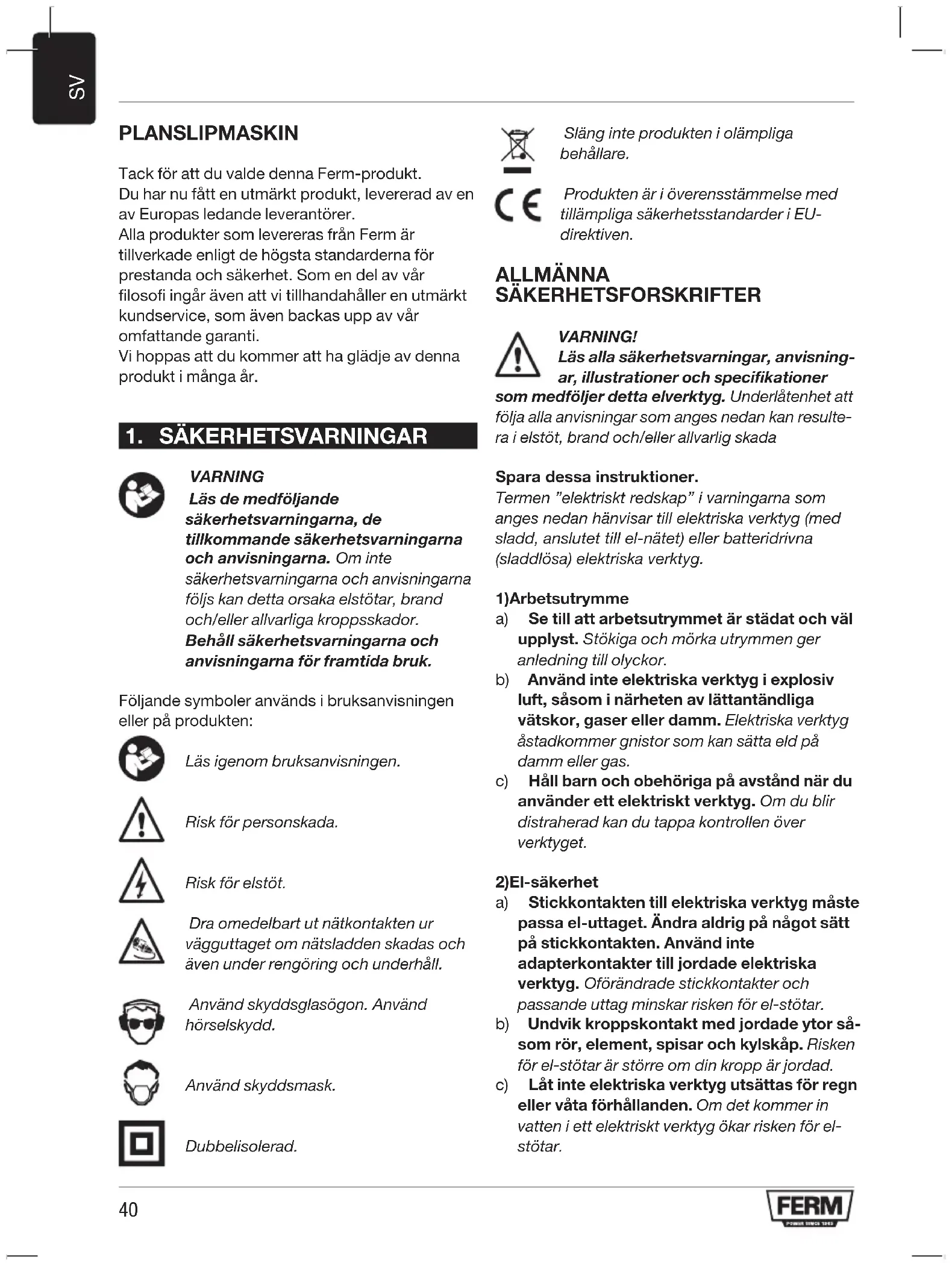 PLANSLIPMASKIN Tack för att du valde denna Ferm-produkt. Du har nu fått en utmärkt produkt, levererad av en av Europas ledande leverantörer. Alla produkter som levereras från Ferm är tillverkade enligt de högsta standarderna för prestanda och säkerhet. Som en del av vår filosofi ingår även att vi tillhandahåller en utmärkt kundservice, som även backas upp av vår omfattande garanti. Vi hoppas att du kommer att ha glädje av denna produkt i många år.