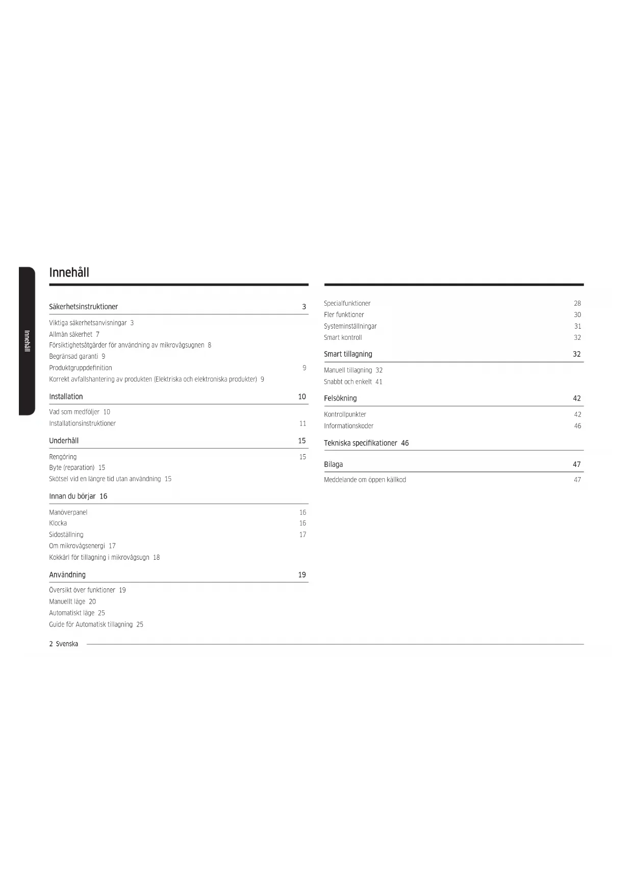 - (opłata według taryfy operatora) http://www.samsung.com/pl/support/ ROMANIA 0800872678 - Apel gratuit *8000 - Apel tarifat în reţea www.samsung.com/ro/support SERBIA 011 321 6899 www.samsung.com/rs/support SLOVAKIA 0800 - SAMSUNG (0800-726 786) www.samsung.com/sk/support LITHUANIA 8-800-77777 www.samsung.com/lt/support LATVIA 8000-7267 www.samsung.com/lv/support ESTONIA 800-7267 www.samsung.com/ee/support SLOVENIA 080 697 267 (brezplačna številka) www.samsung.com/si/support KOSOVO 038 40 30 90 www.samsung.com/support DG68-01402A-03Mikrovågsugn Bruksanvisning NQ5B5763D**2 Svenska Innehåll Innehåll Säkerhetsinstruktioner 3 Viktiga säkerhetsanvisningar 3 Allmän säkerhet 7 Försiktighetsåtgärder för användning av mikrovågsugnen 8 Begränsad garanti 9 Produktgruppdenition 9 Korrekt avfallshantering av produkten (Elektriska och elektroniska produkter) 9 Installation 10 Vad som medföljer 10 Installationsinstruktioner 11 Underhåll 15 Rengöring 15 Byte (reparation) 15 Skötsel vid en längre tid utan användning 15 Innan du börjar 16 Manöverpanel 16 Klocka 16 Sidoställning 17 Om mikrovågsenergi 17 Kokkärl för tillagning i mikrovågsugn 18 Användning 19 Översikt över funktioner 19 Manuellt läge 20 Automatiskt läge 25 Guide för Automatisk tillagning 25 Specialfunktioner 28 Fler funktioner 30 Systeminställningar 31 Smart kontroll 32 Smart tillagning 32 Manuell tillagning 32 Snabbt och enkelt 41 Felsökning 42 Kontrollpunkter 42 Informationskoder 46 Tekniska specikationer 46 Bilaga 47 Meddelande om öppen källkod 47Svenska 3 Säkerhetsinstruktioner Säkerhetsinstruktioner