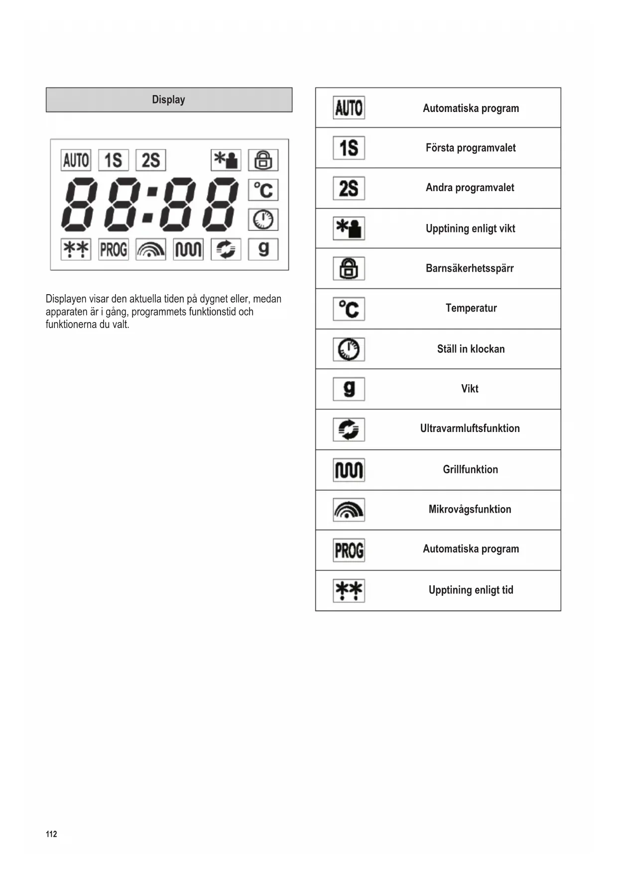 SE111 142 x 208 mm Kontrollpanelens detaljer Knapp Funktion Knappljud & Barnsäkerhetsspärr Favoriträtt & Klocka Snabbstart / Öka tillagningstiden med 30 sekunder Mikrovågor Grill Ultravarmluft Avbryta / Stanna Vridreglage Funktion Tryck Start Vrid Tid & Automatiska matlagningsprogram112 142 x 208 mm Display Displayen visar den aktuella tiden på dygnet eller, medan apparaten är i gång, programmets funktionstid och funktionerna du valt. Automatiska program Första programvalet Andra programvalet Upptining enligt vikt Barnsäkerhetsspärr Temperatur Ställ in klockan Vikt Ultravarmluftsfunktion Grillfunktion Mikrovågsfunktion Automatiska program Upptining enligt tid113 142 x 208 mm Säkerhetsinstruktioner Viktiga säkerhetsinstruktioner Vänligen läs följande instruktioner noggrant och behåll denna bruksanvisning för framtida referens Anslutning till vägguttaget Ugnen får endast anslutas till godkänt jordat vägguttag. Se till att nätspänningen i vägguttaget motsvarar den som är märkt på apparatens skylt. Denna produkt uppfyller de krav som är gällande för CE-märkning. Enhetens placering ∙ Placera alltid mikrovågsugnen på en stabil och jämn värmebeständig yta och se till att apparaten är skyddad från eventuella värmekällor och extremt hög fuktighet. ∙ Använd inte apparaten utomhus. ∙ Fötterna på ugnens undersida bör inte tas bort. ∙ Se alltid till att ventilationen är tillräcklig. Placera inga föremål ovanpå ugnen och se till att det fria avståndet mellan ugnen och väggen eller andra föremål är minst följande: Sidorna: 7,5 cm Bakom: 7,5 cm Ovanför: 30,0 cm Enheten får inte installeras inuti ett skåp; placera den inte heller direkt under ett skåp eller dylika föremål. Viktigt att veta ∙ Varning: Vissa typer av matprodukter kan fatta eld. Lämna under inga omständigheter apparaten utan tillsyn när någon av mikrovågs-, grill-, varmlufts- eller kombinationsfunktionerna är i användning. ∙ Denna mikrovågsugn är endast ämnad för upptining, värmning och tillagning av mat. Varning: Försök att värma upp torra matprodukter eller kläder, värmedynor, tofor, tvättsvampar, våta rengöringsdukar etc. kan leda till förbränningsskador eller eldsvåda. ∙ Inget ansvar accepteras för skada som uppstått genom otillbörlig användning eller om dessa instruktioner inte åtföljts. ∙ Använd endast kärl lämpliga för användning i mikrovågsugn. Använd inte behållare av metall när du värmer upp mat eller dryck med mikrovågsfunktionen. För mer information, se avsnittet ’Använd alltid lämpliga kokkärl’.114 142 x 208 mm ∙ Apparaten bör inte användas med hjälp av en extern timer eller separat fjärrkontroll. ∙ Denna apparat kan användas av barn (minst 8 år gamla) och av personer som har minskad fysisk rörelseförmåga, reducerat sinnes- eller mentaltillstånd, eller som har bristfällig erfarenhet och kunskap, förutsatt att dessa personer är under uppsyn eller har fått tillräckliga instruktioner beträffande apparatens användning och vet vilka risker och säkerhetsåtgärder som användningen innefattar. ∙ Barn bör inte tillåtas leka med apparaten. ∙ Barn bör inte tillåtas rengöra eller göra service på apparaten ifall de inte är övervakade och minst 8 år gamla. ∙ Apparaten och dess elsladd bör hållas utom räckhåll för barn under 8 år. ∙ På grund av risken för elektrisk stöt bör apparaten inte rengöras eller doppas i vatten. ∙ Varning: På grund av de höga temperaturerna som uppstår vid användning av grill- och/eller varmluftsfunktionerna bör barn inte använda apparaten ifall de inte är övervakade av en vuxen. ∙ Under användning av kombinations-, grill-och/eller varmluftsfunktionerna bör du vara extremt noga med att inte röra de inre värmeelementen. ∙ Använd inga ångapparater för att rengöra ugnen. ∙ Stäng alltid av apparaten och dra stickproppen ur vägguttaget: - innan rengöring påbörjas, - om apparaten skulle upphöra att fungera. - efter varje användning. ∙ Ta stickproppen ur vägguttaget genom att dra i stickproppen, aldrig i sladden.