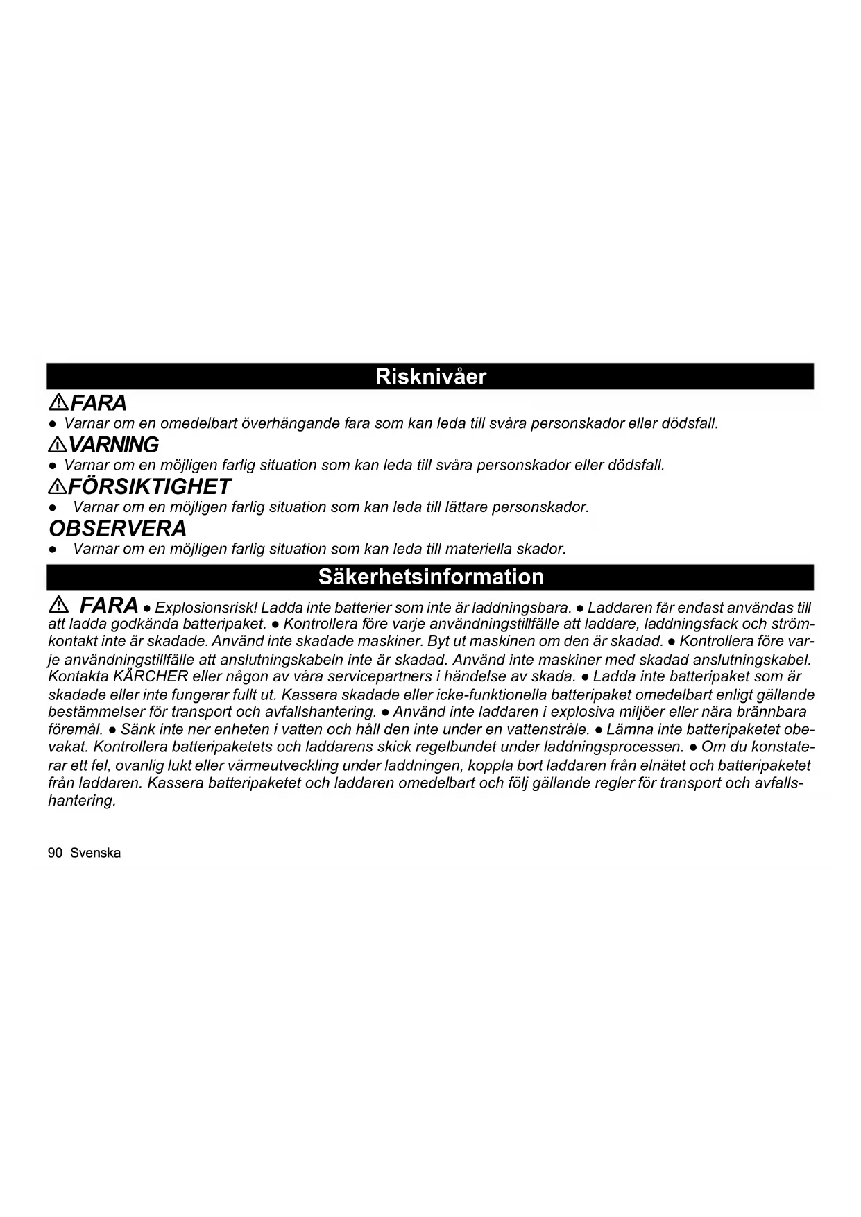 - Tekniska data Svenska Risknivåer FARA ● Varnar om en omedelbart överhängande fara som kan leda till svåra personskador eller dödsfall. 몇 VARNING ● Varnar om en möjligen farlig situation som kan leda till svåra personskador eller dödsfall. 몇 FÖRSIKTIGHET ● Varnar om en möjligen farlig situation som kan leda till lättare personskador. OBSERVERA ● Varnar om en möjligen farlig situation som kan leda till materiella skador. Säkerhetsinformation FARA ● Explosionsrisk! Ladda inte batterier som inte är laddningsbara. ● Laddaren får endast användas till att ladda godkända batteripaket. ● Kontrollera före varje användningstillfälle att laddare, laddningsfack och ström- kontakt inte är skadade. Använd inte skadade maskiner. Byt ut maskinen om den är skadad. ● Kontrollera före var- je användningstillfälle att anslutningskabeln inte är skadad. Använd inte maskiner med skadad anslutningskabel. Kontakta KÄRCHER eller någon av våra servicepartners i händelse av skada. ● Ladda inte batteripaket som är skadade eller inte fungerar fullt ut. Kassera skadade eller icke-funktionella batteripaket omedelbart enligt gällande bestämmelser för transport och avfallshantering. ● Använd inte laddaren i explosiva miljöer eller nära brännbara föremål. ● Sänk inte ner enheten i vatten och håll den inte under en vattenstråle. ● Lämna inte batteripaketet obe- vakat. Kontrollera batteripaketets och laddarens skick regelbundet under laddningsprocessen. ● Om du konstate- rar ett fel, ovanlig lukt eller värmeutveckling under laddningen, koppla bort laddaren från elnätet och batteripaketet från laddaren. Kassera batteripaketet och laddaren omedelbart och följ gällande regler för transport och avfalls- hantering.Svenska 91 몇 VARNING ● Kontrollera att nätspänningen stämmer överens med den spänning som anges på laddarens typskylt. ● Skydda anslutningskabeln och strömkontakten mot värme, vassa kanter, olja och rörliga maskindelar. ● Öppna inte laddaren. Låt endast yrkespersonal utföra reparationer. ● Dra ut strömkontakten ur eluttaget innan du rengör laddaren eller utför underhållsarbete. ● Personer med nedsatta fysiska, sensoriska eller mentala förmå- gor eller med bristande erfarenhet och kunskap får endast använda maskinen om de befinner sig under kompetent uppsikt eller har instruerats av en person som ansvarar för deras säkerhet om hur maskinen används på ett säkert sätt, och om de har förstått de risker som är förknippade med användningen av maskinen. ● Barn får inte leka med den här maskinen. ● Håll uppsikt över barn för att vara säker på att de inte leker med apparaten. ● Barn över 8 år får använda maskinen om en person som ansvarar för deras säkerhet håller dem under uppsikt, instruerar dem i hur maskinen används och förklarar vilka risker som är förknippade med användningen av maskinen. ● Barn får rengöra och underhålla maskinen om de hålls under uppsikt. 몇 FÖRSIKTIGHET ● Använd inte enheten tillsammans med andra enheter i förlängningskablar med gre- nuttag. ● Dra inte i anslutningskabeln när strömkontakten ska dras ut ur vägguttaget. ● Använd inte laddaren om den är våt eller smutsig. ● Sätt inte in våta eller smutsiga batteripaket i laddarens laddningsfack. ● Använd inte lad- daren i dammiga miljöer. OBSERVERA ● Kortslutningsrisk. Skydda laddningskontakterna mot metalldelar. ● Täck inte över laddaren under drift. ● Bär inte laddaren i anslutningskabeln. ● Använd endast laddaren i torra utrymmen med låg luftfuktig- het. Avsedd användning 몇 FÖRSIKTIGHET Explosionsrisk! Risk för person- och materialskador om batteripaketet exploderar. Ladda inte batteripaket som är defekta eller inte fungerar fullt ut. Gör inga ändringar som inte är godkända av tillverkaren.92 Svenska All annan användning är förbjuden. Användaren ansvarar för faror som uppstår på grund av otillåten användning. Ladda endast batteripaket från KÄRCHER Battery Power 4 V-systemet. Hänvisning Lämpliga batteripaket är märkta med BP 4 V-symbolen. Uppgifter om spänningen finns på enheten, på batteripaketet och deras typskylt. Miljöskydd Förpackningsmaterialen kan återvinnas. Avfallshantera förpackningar på ett miljövänligt sätt. Elektriska och elektroniska maskiner innehåller ofta värdefulla återvinningsbara material och komponenter såsom engångsbatterier, uppladdningsbara batterier och olja, som vid felaktig användning eller felaktig av- fallshantering kan utgöra en potentiell risk för människors hälsa och för miljön. Dessa komponenter är dock nödvändiga för att maskinen ska kunna arbeta korrekt. Maskiner som märkts med denna symbol får inte kas- tas i hushållssoporna. Information om ämnen (REACH) Aktuell information om ämnen finns på: www.kaercher.com/REACH Tillbehör och reservdelar Använd endast originaltillbehör och originalreservdelar, så att en säker och störningsfri drift av maskinen är garan- terad. Information om tillbehör och reservdelar finns på www.kaercher.com.Svenska 93 Garanti I respektive land gäller de garantivillkor som publicerats av våra auktoriserade distributörer. Eventuella fel på ma- skinen repareras utan kostnad inom garantifristen, under förutsättning att det orsakats av ett material- eller tillverk- ningsfel. I frågor som gäller garantin ska du vända dig med kvitto till inköpsstället eller närmaste, auktoriserad kundtjänst. (Se baksidan för adress) Symboler på maskinen Symboler på laddaren Beskrivning av maskinen Bild A 1 Strömkontakt 2 Anslutningskabel 3 Laddare Skydda enheten mot väta. Förvara enheten torrt. Utsätt inte enheten för regn. Enheten läm- par sig endast för användning inomhus. Enheten uppfyller kraven för skyddsklass II.94 Svenska 4 Laddningsfack 5 Laddkontakter 6 Laddningsnivåindikator (LED-display) Hänvisning Laddaren har ett laddning