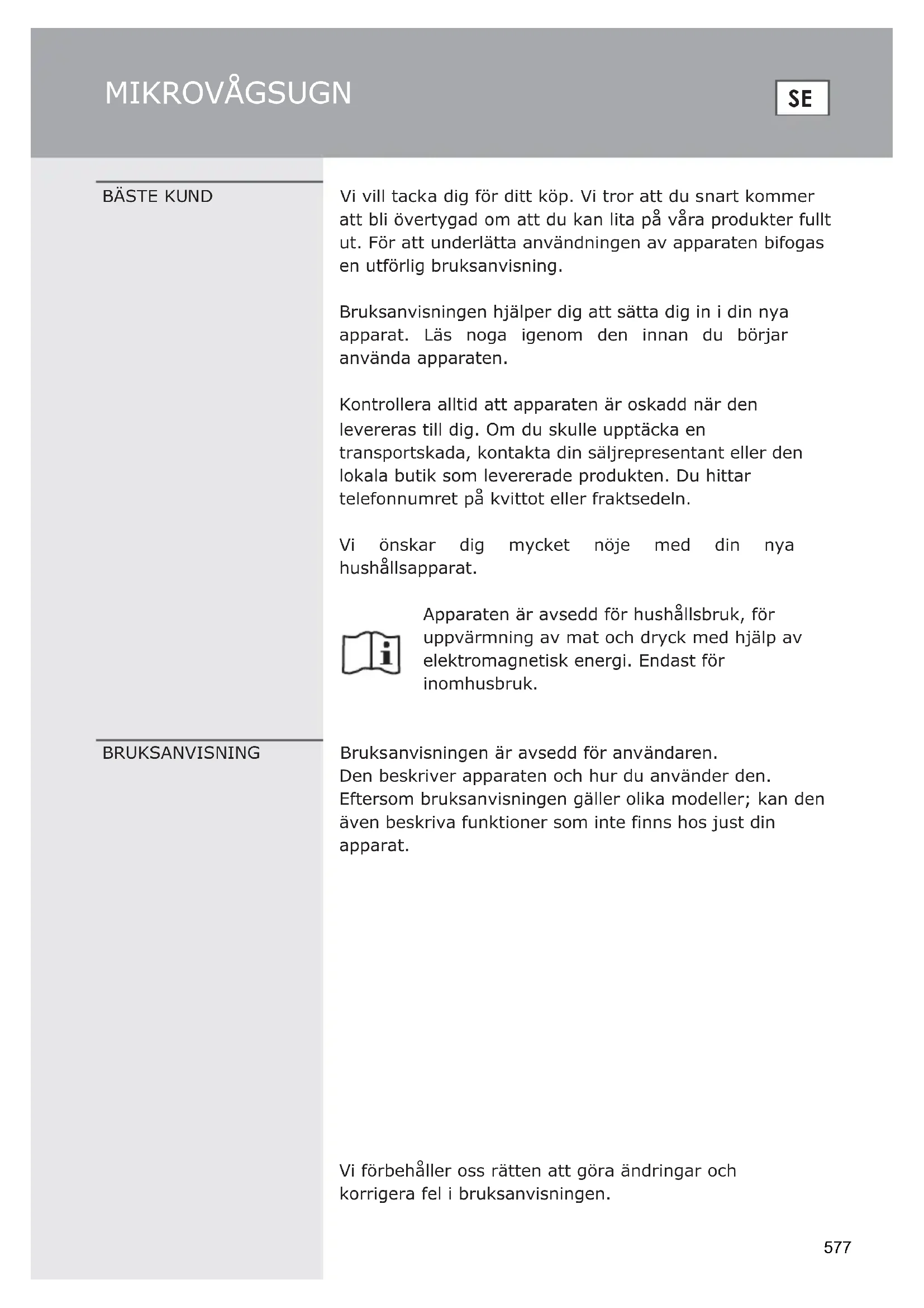 Kontrollera att luckan är helt stängd. I annat fall kommer mikrovågorna inte att stråla i ugnen. Om inget av ovanstående hjälper, kontakta närmaste auktoriserade service. Apparaten är avsedd för hushållsbruk, för uppvärmning av mat och dryck med hjälp av elektromagnetisk energi. Endast för inomhusbruk.