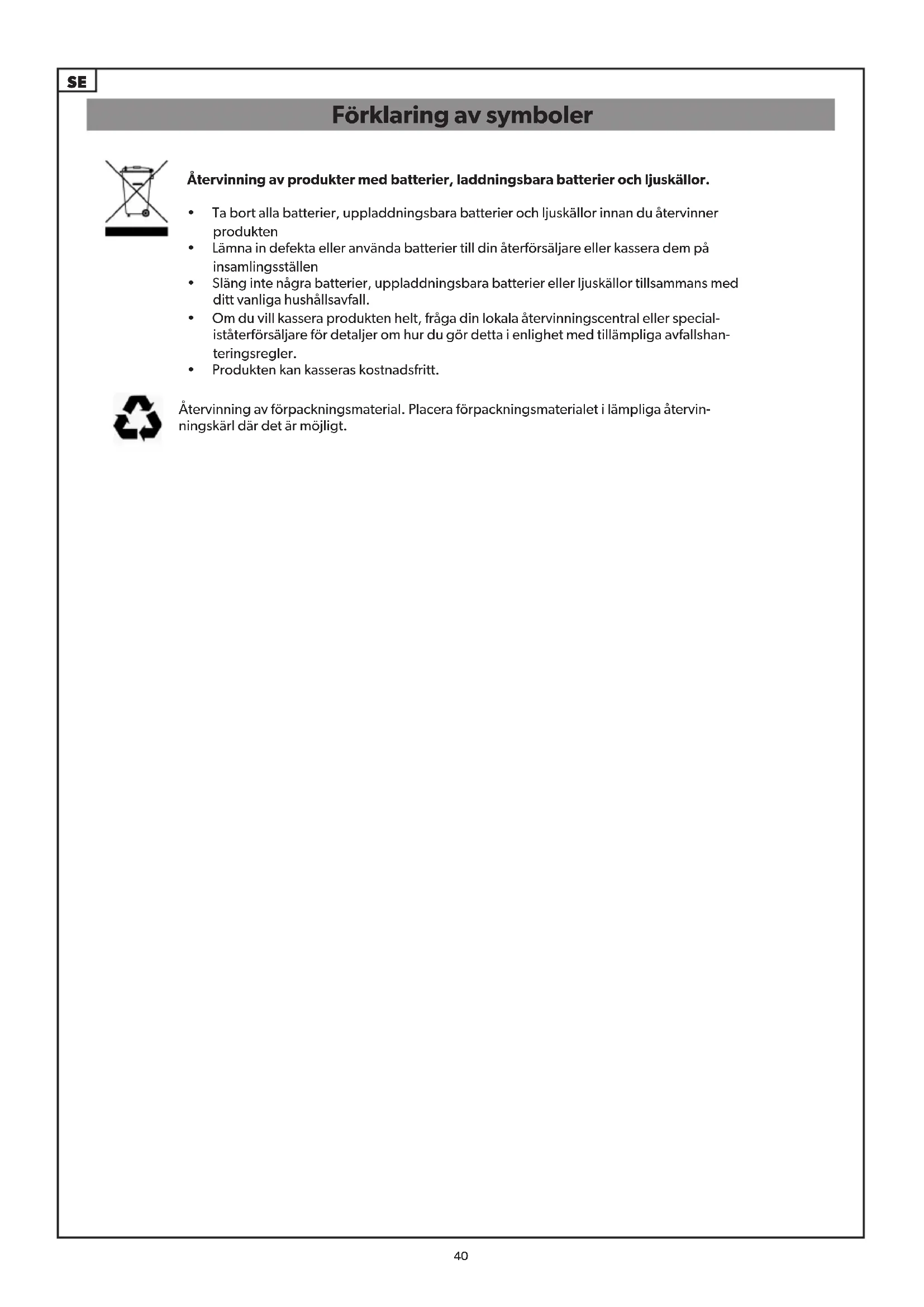 - Ta bort alla batterier, uppladdningsbara batterier och ljuskällor innan du återvinner produkten