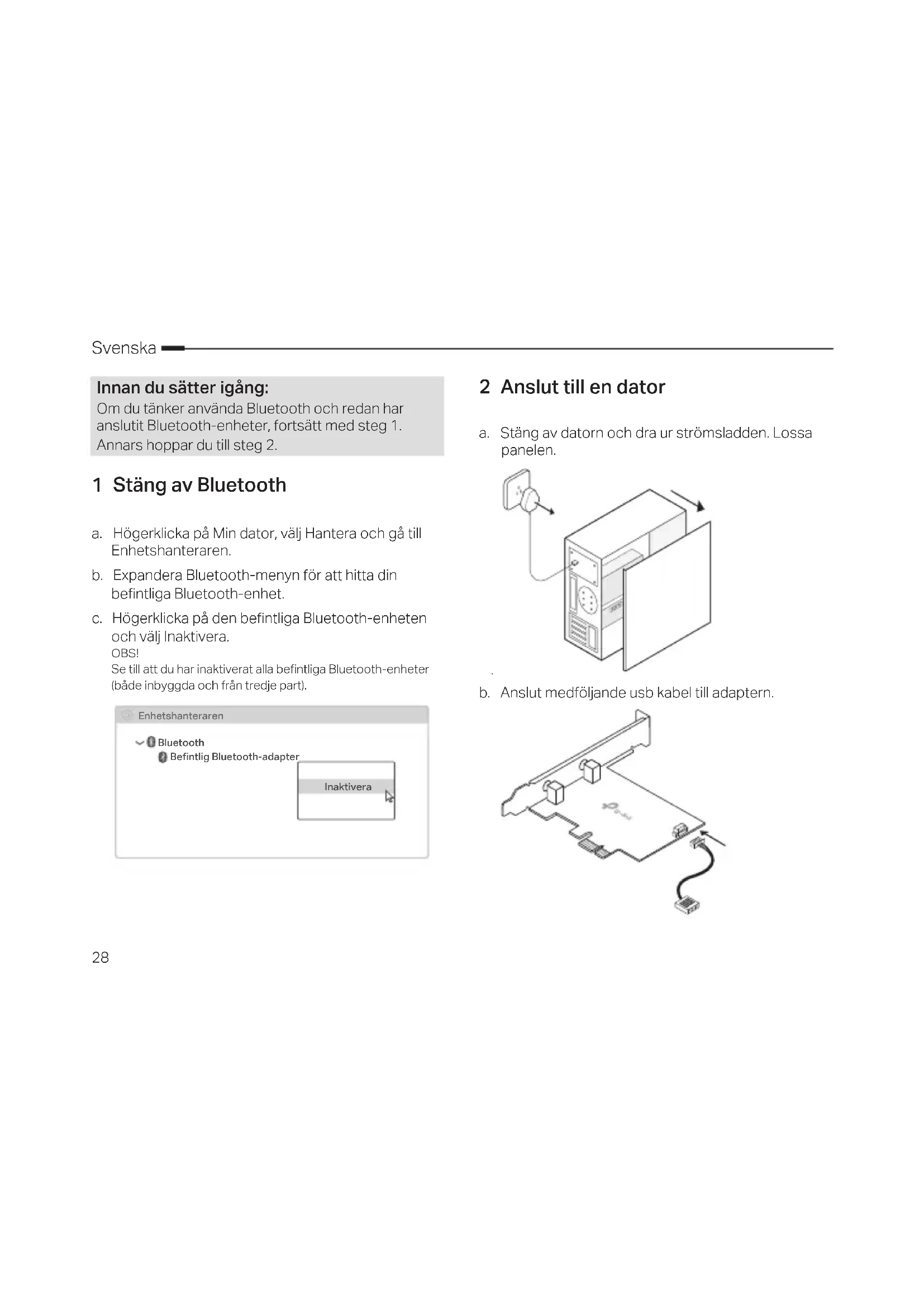b. Anslut medföljande usb kabel till adaptern. 1 Stäng av Bluetooth a. Högerklicka på Min dator, välj Hantera och gå till Enhetshanteraren. b. Expandera Bluetooth-menyn för att hitta din bentliga Bluetooth-enhet. c. Högerklicka på den bentliga Bluetooth-enheten och välj Inaktivera. OBS! Se till att du har inaktiverat alla bentliga Bluetooth-enheter (både inbyggda och från tredje part). BluetoothEnhetshanterarenInaktiveraBentlig Bluetooth-adapter Innan du sätter igång: Om du tänker använda Bluetooth och redan har anslutit Bluetooth-enheter, fortsätt med steg 1. Annars hoppar du till steg 2.29 Svenska c. Hitta en ledig PCIE X1-kortplats och sätt försiktigt i adaptern. OBS: Om fästet inte passar datorn, lossa det från adapterplattan och ersätt det med lågprolsfästet d. Hitta en ledig F_USB-ingång och anslut USB- kabeln till den. USB e. Anslut antennen/antennerna till adaptern. OBS: Se till att det inte nns några hinder mellan antennen/ antennerna och routern. f. Sätt tillbaka panelen. Anslut strömsladden och slå på datorn. 3 Installera drivrutinerna a. Sätt i CD skivan och dubbelklicka på Autorun.exe. OBS: Du kan också se den nya versionen och ladda ner drivrutinen på https://www.tp-link.com/support/download/ b. Installera drivrutinerna för Wi-Fi och Bluetooth.