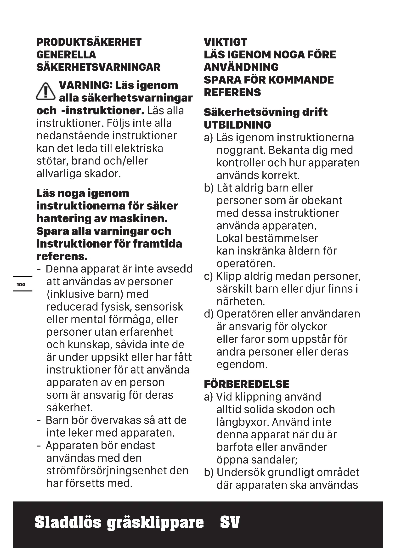 REFERENS Säkerhetsövning drift UTBILDNING a) Läs igenom instruktionerna noggrant. Bekanta dig med kontroller och hur apparaten används korrekt. b) Låt aldrig barn eller personer som är obekant med dessa instruktioner använda apparaten. Lokal bestämmelser kan inskränka åldern för operatören. c) Klipp aldrig medan personer, särskilt barn eller djur finns i närheten. d) Operatören eller användaren är ansvarig för olyckor eller faror som uppstår för andra personer eller deras egendom. FÖRBEREDELSE a) Vid klippning använd alltid solida skodon och långbyxor. Använd inte denna apparat när du är barfota eller använder öppna sandaler; b) Undersök grundligt området där apparaten ska användas101 Sladdlös gräsklippare SV och ta bort alla stenar, pinnar, trådar, ben och andra främmande föremål; c) Före användning kontrollera alltid visuellt så att blad, bladbultar och klippmontage inte är slitna eller skadade. Byt ut slitna eller skadade blad och bultar i set för att bibehålla balansen; Byt ut skadade och oläsliga etiketter. ANVÄNDNING a) Arbeta endast i dagsljus eller i bra artificiellt ljus; b) Undvik att använda apparaten i vått gräs då det är möjligt; c) Se alltid till att du är stadig på foten i slänter; d) Gå spring aldrig; e) För roterande maskiner försedda med hjul, rör dig alltid längs med lutningar aldrig uppåt och nedåt; f) Var extra försiktig när du byter riktning i slänter; g) Kör inte i mycket branta slänter; h) Var extra försiktig när du backar eller drar apparaten mot dig;