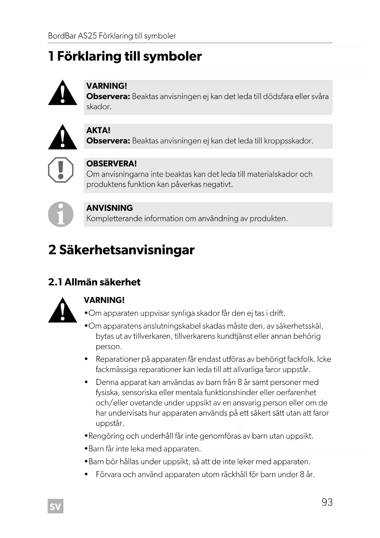 - Förvara och använd apparaten utom räckhåll för barn under 8 år. VARNING! Observera: Beaktas anvisningen ej kan det leda till dödsfara eller svåra skador. AKTA! Observera: Beaktas anvisningen ej kan det leda till kroppsskador. OBSERVERA! Om anvisningarna inte beaktas kan det leda till materialskador och produktens funktion kan påverkas negativt. ANVISNING Kompletterande information om användning av produkten. AS25-O-16s.book Seite 93 Montag, 7. November 2016 11:47 11SV Säkerhetsanvisningar BordBar AS25