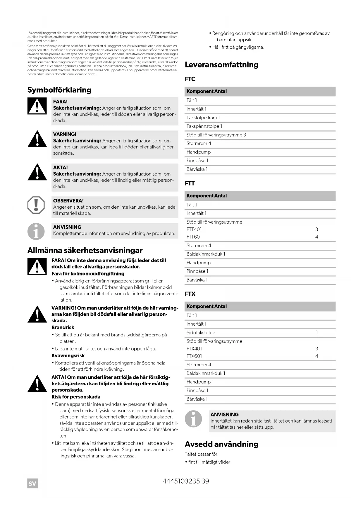 - fint till måttligt väder FARA! Säkerhetsanvisning: Anger en farlig situation som, om den inte kan undvikas, leder till döden eller allvarlig person- skada. VARNING! Säkerhetsanvisning: Anger en farlig situation som, om den inte kan undvikas, kan leda till döden eller allvarlig per- sonskada. AKTA! Säkerhetsanvisning: Anger en farlig situation som, om den inte kan undvikas, leder till lindrig eller måttlig person- skada. OBSERVERA! Anger en situation som, om den inte kan undvikas, kan leda till materiell skada. ANVISNING Kompletterande information om användning av produkten. Komponent Antal Tält 1 Innertält 1 Takstolpe fram 1 Takspännstolpe 1 Stöd till förvaringsutrymme 3 Stormrem 4 Handpump 1 Pinnpåse 1 Bärväska 1 Komponent Antal Tält 1 Innertält 1 Stöd till förvaringsutrymme FTT401 FTT601