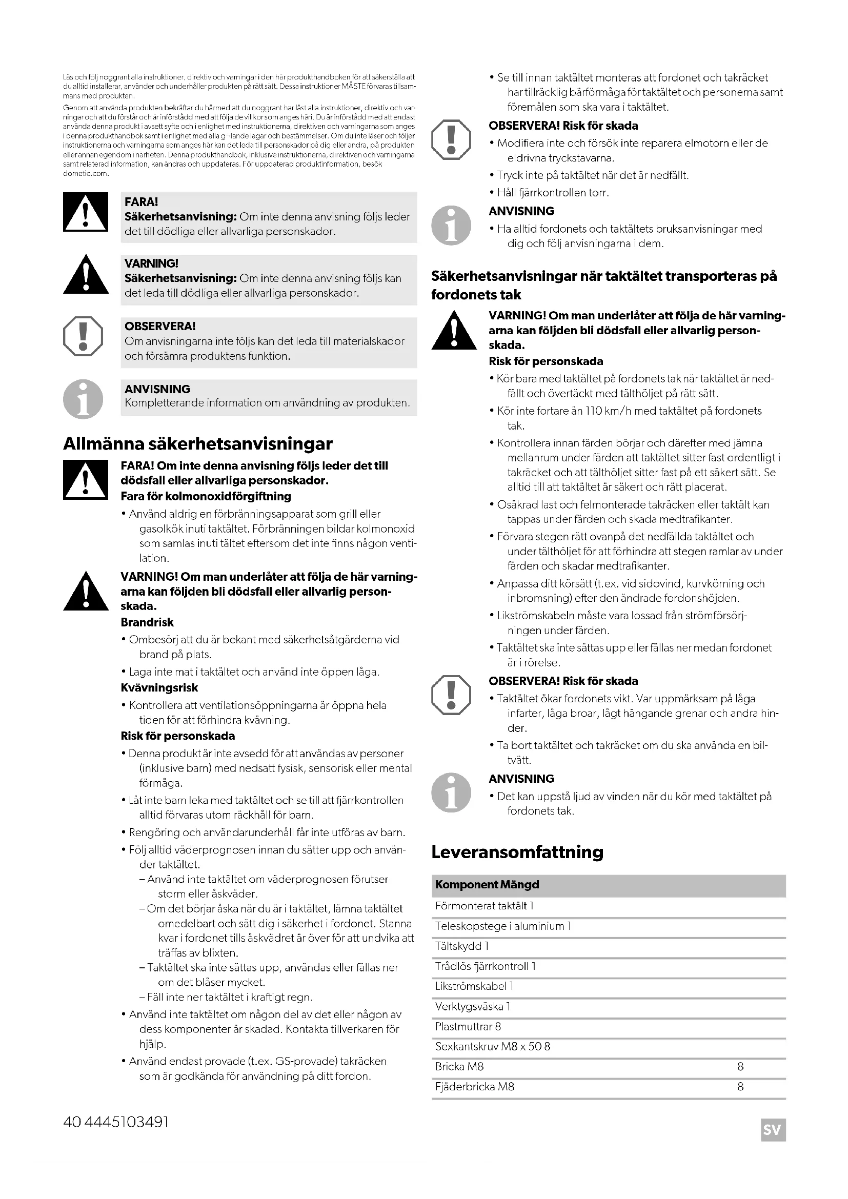 - Det kan uppstå ljud av vinden när du kör med taktältet på fordonets tak. Leveransomfattning FARA! Säkerhetsanvisning: Om inte denna anvisning följs leder det till dödliga eller allvarliga personskador. VARNING! Säkerhetsanvisning: Om inte denna anvisning följs kan det leda till dödliga eller allvarliga personskador. OBSERVERA! Om anvisningarna inte följs kan det leda till materialskador och försämra produktens funktion. ANVISNING Kompletterande information om användning av produkten. Komponent Mängd Förmonterat taktält 1 Teleskopstege i aluminium 1 Tältskydd 1 Trådlös fjärrkontroll 1 Likströmskabel 1 Verktygsväska 1 Plastmuttrar 8 Sexkantskruv M8 x 50 8 Bricka M8 8 Fjäderbricka M8 8SV