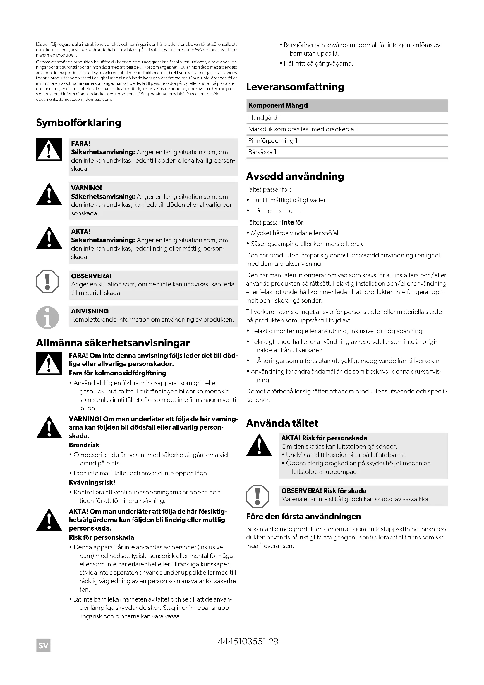 - Användning för andra ändamål än de som beskrivs i denna bruksanvis- ning Dometic förbehåller sig rätten att ändra produktens utseende och specifi- kationer. Använda tältet