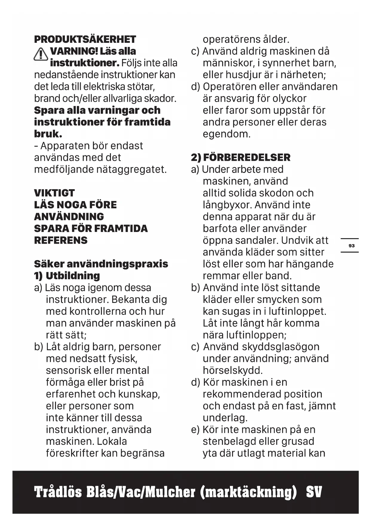 a) Under arbete med maskinen, använd alltid solida skodon och långbyxor. Använd inte denna apparat när du är barfota eller använder öppna sandaler. Undvik att använda kläder som sitter löst eller som har hängande remmar eller band. b) Använd inte löst sittande kläder eller smycken som kan sugas in i luftinloppet. Låt inte långt hår komma nära luftinloppen; c) Använd skyddsglasögon under användning; använd hörselskydd. d) Kör maskinen i en rekommenderad position och endast på en fast, jämnt underlag. e) Kör inte maskinen på en stenbelagd eller grusad yta där utlagt material kan94 Trådlös Blås/Vac/Mulcher (marktäckning) SV orsaka skada. f) Inspektera alltid maskinen visuellt innan användning, för att se till att kvarnen, skruvarna och andra fästanordningar är säkrade, att kåpan är oskadad och att skydd och skärmar sitter på plats. Byt ut slitna eller skadade komponenter i uppsättningarna för att bevara balansen. Byt ut skadade eller oläsliga etiketter.