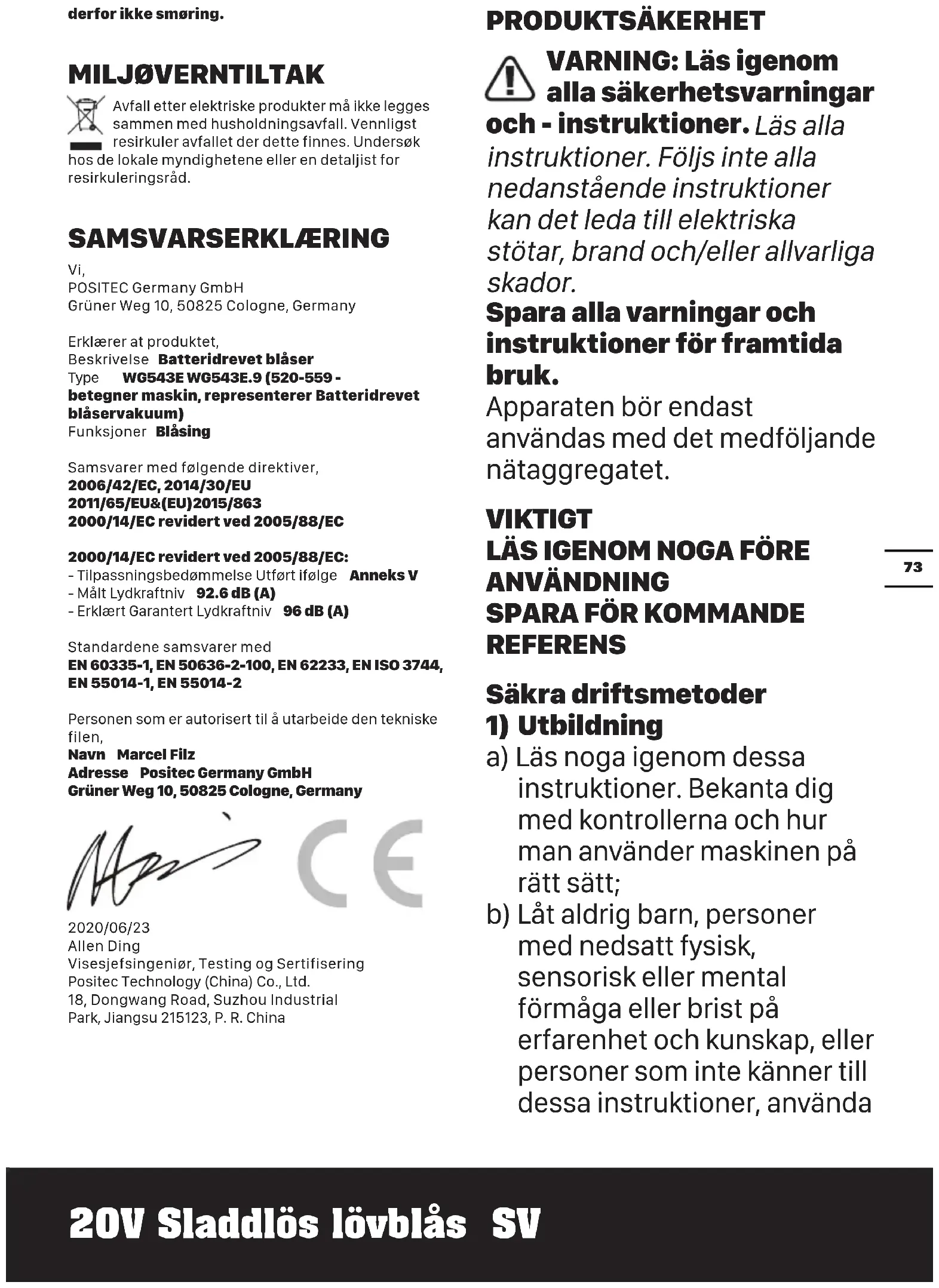 Rengör verktyget regelbundet. Varning! Håll produkten torr. Spruta under inga omständigheter vatten på det. - Rengör endast med mildtvållösning och en fuktig trasa. - Använd inga tvättmedel, rengöringsmedel eller lösningsmedel som kan innehålla kemikalier som kan skada plasten. - Produkten använder självsmörjande lager så ingen smörjning krävs. MILJÖSKYDD Uttjänade elektriska produkter får inte kasseras som hushållsavfall. Återanvänd där det finns anläggningar för det. Kontakta dina lokala myndigheter eller återförsäljare för återvinningsråd.80 20V Dmuchawa bezprzewodowa PL DEKLARATION OM ÖVERENSSTÄMMELSE Vi, POSITEC Germany GmbH Grüner Weg 10, 50825 Cologne, Germany Deklarerar att denna produkt, Beskrivning Sladdlös lövblås Typ WG543E WG543E.9 (520-559 - maskinbeteckning, representativt för den sladdlösa lövblåsaren) Funktion Blåsa Uppfyller följande direktiv, 2006/42/EC, 2014/30/EU 2011/65/EU&(EU)2015/863 2000/14/EC ändrad av 2005/88/EC 2000/14/EC ändrad av 2005/88/EC: - Konformitetsutvärderingsprocedur enligt Bilaga V - Uppmätt bullernivå 92.6 dB (A) - Deklarerad garanterad bullernivå 96 dB (A) Standarder överensstämmer med, EN 60335-1, EN 50636-2-100, EN 62233, EN ISO 3744, EN 55014-1, EN 55014-2 Personen som godkänts att sammanställa den tekniska filen, Namn Marcel Filz Adress Positec Germany GmbH Grüner Weg 10, 50825 Cologne, Germany 2020/06/23 Allen Ding Vice chefsingenjör, tester och certifiering Positec Technology (China) Co., Ltd. 18, Dongwang Road, Suzhou Industrial Park, Jiangsu 215123, P. R. China BEZPIECZEŃSTWO PRODUKTU UWAGA Należy przeczytać wszystkie przepisy. Błędy w przestrzeganiu następujących przepisów mogą spowodować porażenie prądem, pożar i/lub ciężkie obrażenia ciała. Należy dobrze przechowywać te przepisy. Urządzenie może być zastosowane wyłącznie z zespołem zasilania, który był dostarczony z tym urządzeniem. WAŻNE