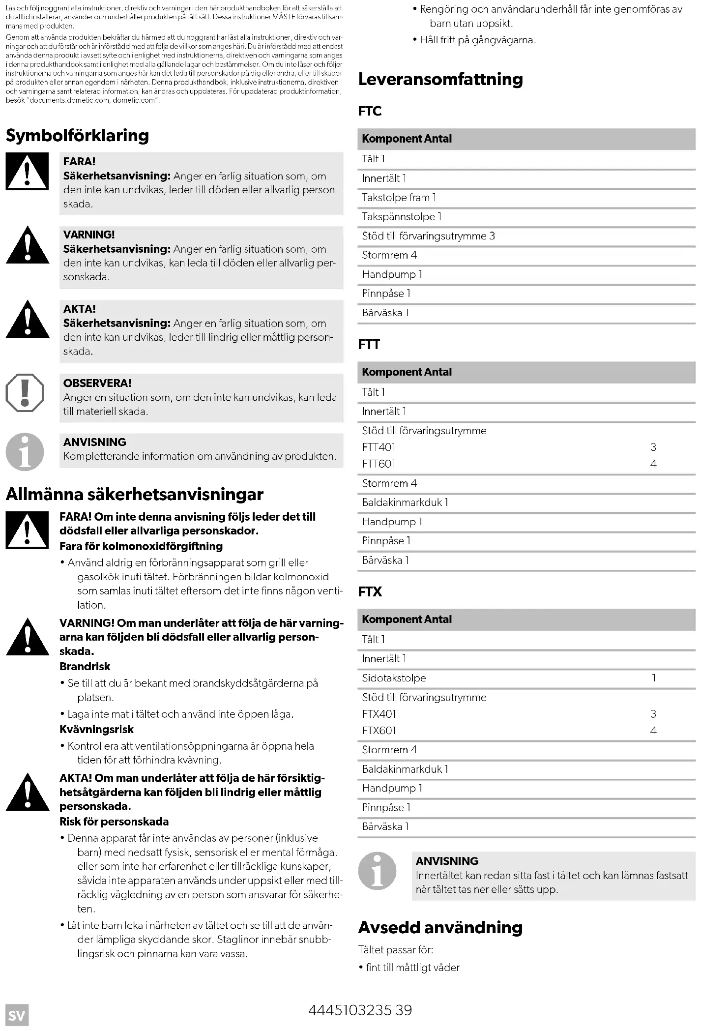 - fint till måttligt väder FARA! Säkerhetsanvisning: Anger en farlig situation som, om den inte kan undvikas, leder till döden eller allvarlig person- skada. VARNING! Säkerhetsanvisning: Anger en farlig situation som, om den inte kan undvikas, kan leda till döden eller allvarlig per- sonskada. AKTA! Säkerhetsanvisning: Anger en farlig situation som, om den inte kan undvikas, leder till lindrig eller måttlig person- skada. OBSERVERA! Anger en situation som, om den inte kan undvikas, kan leda till materiell skada. ANVISNING Kompletterande information om användning av produkten. Komponent Antal Tält 1 Innertält 1 Takstolpe fram 1 Takspännstolpe 1 Stöd till förvaringsutrymme 3 Stormrem 4 Handpump 1 Pinnpåse 1 Bärväska 1 Komponent Antal Tält 1 Innertält 1 Stöd till förvaringsutrymme FTT401 FTT601