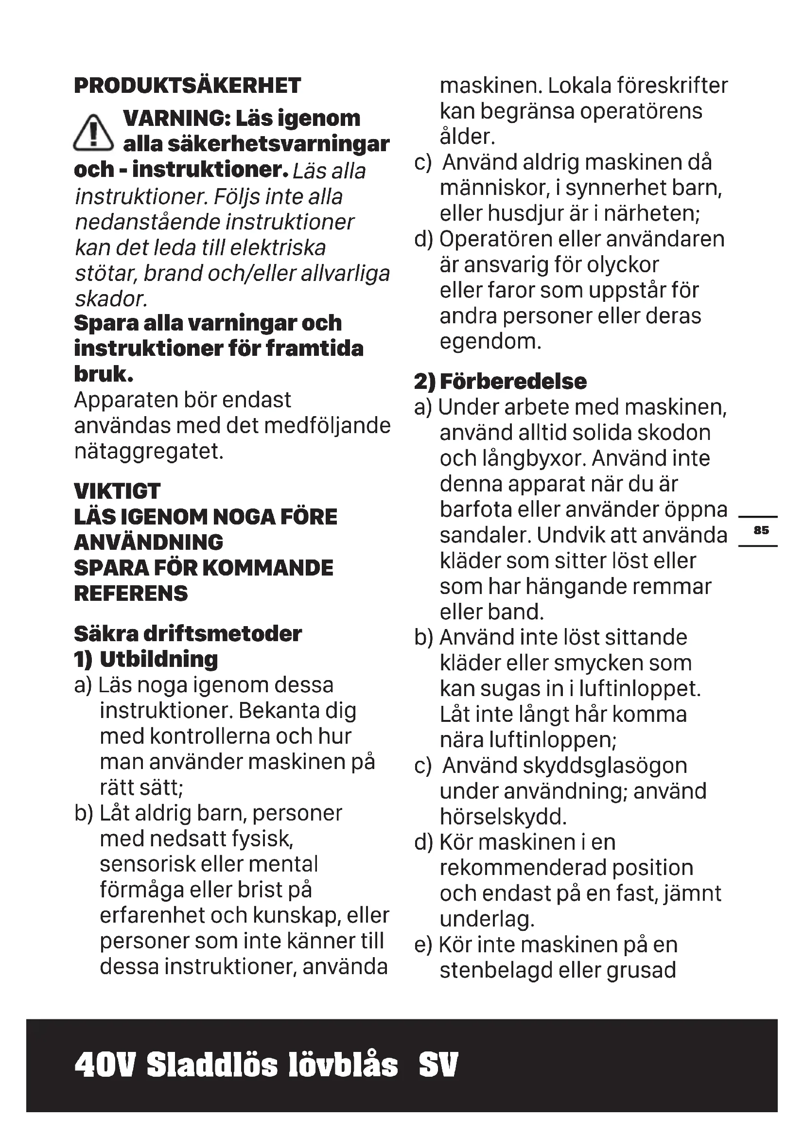 a) Under arbete med maskinen, använd alltid solida skodon och långbyxor. Använd inte denna apparat när du är barfota eller använder öppna sandaler. Undvik att använda kläder som sitter löst eller som har hängande remmar eller band. b) Använd inte löst sittande kläder eller smycken som kan sugas in i luftinloppet. Låt inte långt hår komma nära luftinloppen; c) Använd skyddsglasögon under användning; använd hörselskydd. d) Kör maskinen i en rekommenderad position och endast på en fast, jämnt underlag. e) Kör inte maskinen på en stenbelagd eller grusad86 40V Sladdlös lövblås SV yta där utlagt material kan orsaka skada. f) Inspektera alltid maskinen visuellt innan användning, för att se till att fästanordningar är säkrade, att kåpan är oskadad och att skydd och skärmar sitter på plats. Byt ut slitna eller skadade komponenter i uppsättningarna för att bevara balansen. Byt ut skadade eller oläsliga etiketter.