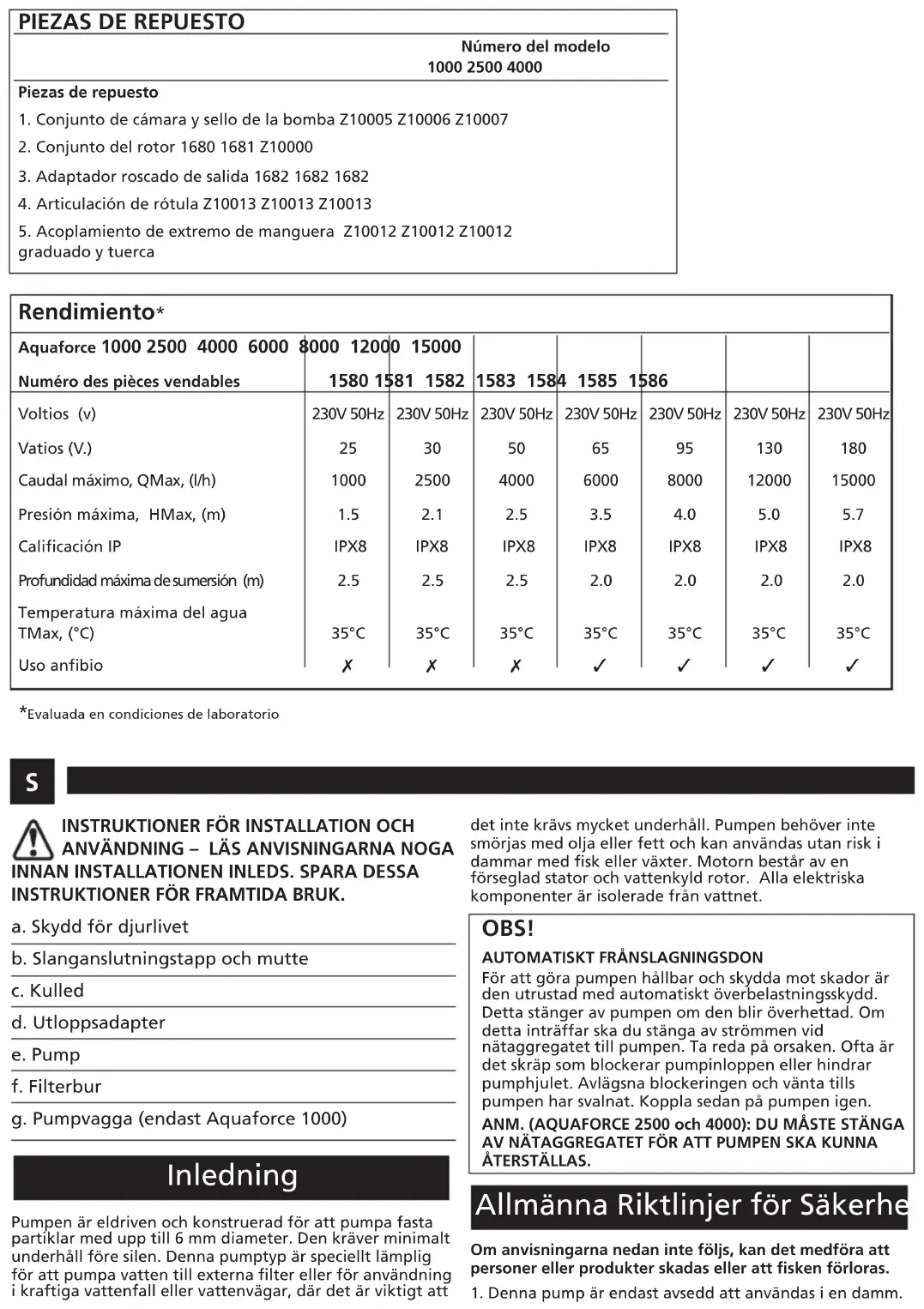 INSTRUKTIONER FÖR FRAMTIDA BRUK. a. Skydd för djurlivet b. Slanganslutningstapp och mutte c. Kulled d. Utloppsadapter e. Pump f. Filterbur g. Pumpvagga (endast Aquaforce 1000) Pumpen är eldriven och konstruerad för att pumpa fasta partiklar med upp till 6 mm diameter. Den kräver minimalt underhåll före silen. Denna pumptyp är speciellt lämplig för att pumpa vatten till externa filter eller för användning i kraftiga vattenfall eller vattenvägar, där det är viktigt att det inte krävs mycket underhåll. Pumpen behöver inte smörjas med olja eller fett och kan användas utan risk i dammar med fisk eller växter. Motorn består av en förseglad stator och vattenkyld rotor. Alla elektriska komponenter är isolerade från vattnet. OBS!