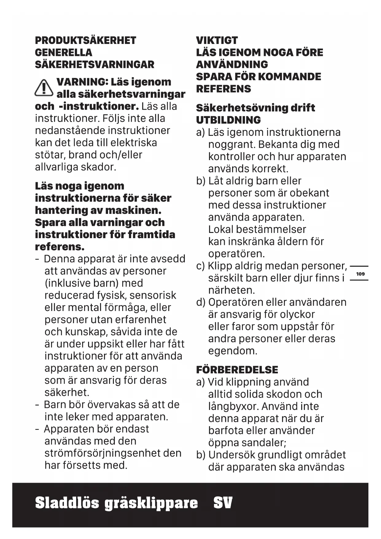REFERENS Säkerhetsövning drift UTBILDNING a) Läs igenom instruktionerna noggrant. Bekanta dig med kontroller och hur apparaten används korrekt. b) Låt aldrig barn eller personer som är obekant med dessa instruktioner använda apparaten. Lokal bestämmelser kan inskränka åldern för operatören. c) Klipp aldrig medan personer, särskilt barn eller djur finns i närheten. d) Operatören eller användaren är ansvarig för olyckor eller faror som uppstår för andra personer eller deras egendom. FÖRBEREDELSE a) Vid klippning använd alltid solida skodon och långbyxor. Använd inte denna apparat när du är barfota eller använder öppna sandaler; b) Undersök grundligt området där apparaten ska användas110 Sladdlös gräsklippare SV och ta bort alla stenar, pinnar, trådar, ben och andra främmande föremål; c) Före användning kontrollera alltid visuellt så att blad, bladbultar och klippmontage inte är slitna eller skadade. Byt ut slitna eller skadade blad och bultar i set för att bibehålla balansen; Byt ut skadade och oläsliga etiketter. ANVÄNDNING a) Arbeta endast i dagsljus eller i bra artificiellt ljus; b) Undvik att använda apparaten i vått gräs då det är möjligt; c) Se alltid till att du är stadig på foten i slänter; d) Gå spring aldrig; e) För roterande maskiner försedda med hjul, rör dig alltid längs med lutningar aldrig uppåt och nedåt; f) Var extra försiktig när du byter riktning i slänter; g) Kör inte i mycket branta slänter; h) Var extra försiktig när du backar eller drar apparaten mot dig;