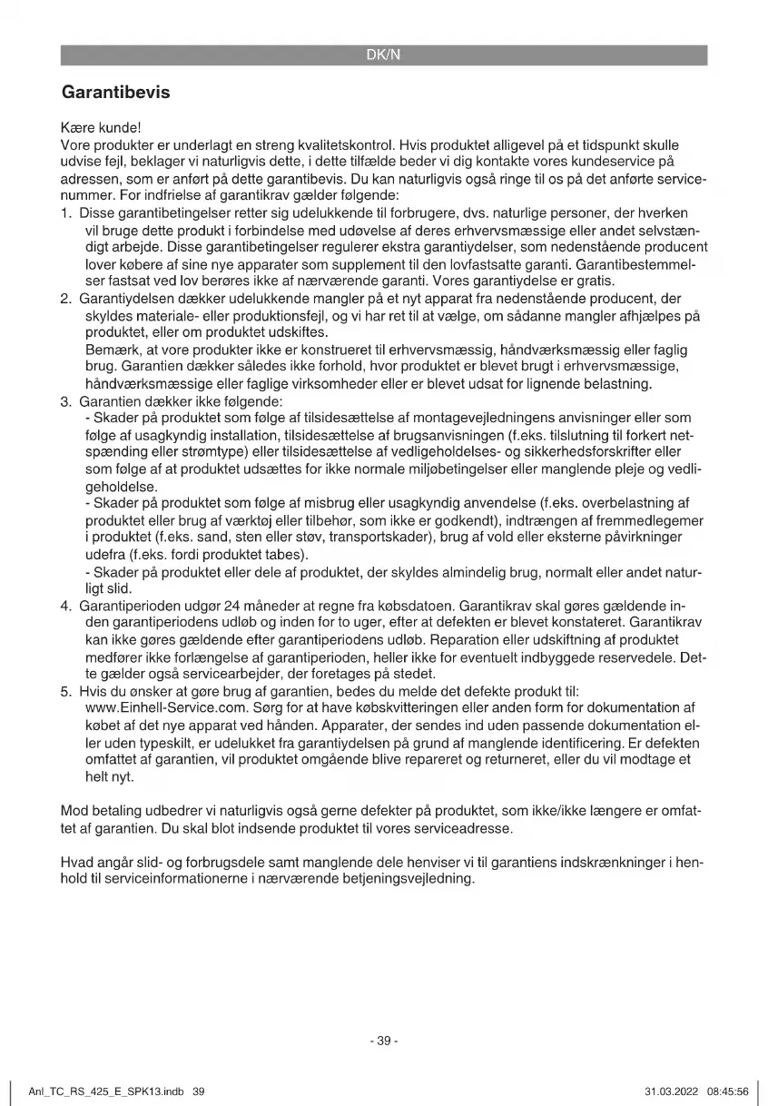 www.Einhell-Service.com. Se till att du har sparat på kvittot eller ett annat köpebevis som påvisar att du har köpt denna produkt i nytt skick. Produkter som sänds in utan köpebevis eller utan märkskylt täcks inte av våra garantitjänster eftersom de inte kan identifi eras. Om defekten i produkten täcks av våra garantitjänster, får du genast en reparerad eller ny produkt av oss. Givetvis kan vi även, mot debitering, åtgärda skador som antingen inte täcks av garantin eller som har uppstått efter garantitidens slut. Skicka in produkten till nedanstående serviceadress. För slitage- och förbrukningsdelar samt för delar som saknas hänvisar vi till begränsningarna i garantin enligt serviceinformationen som anges i denna bruksanvisning. Anl_TC_RS_425_E_SPK13.indb 46Anl_TC_RS_425_E_SPK13.indb 46 31.03.2022 08:45:5931.03.2022 08:45:59CZ