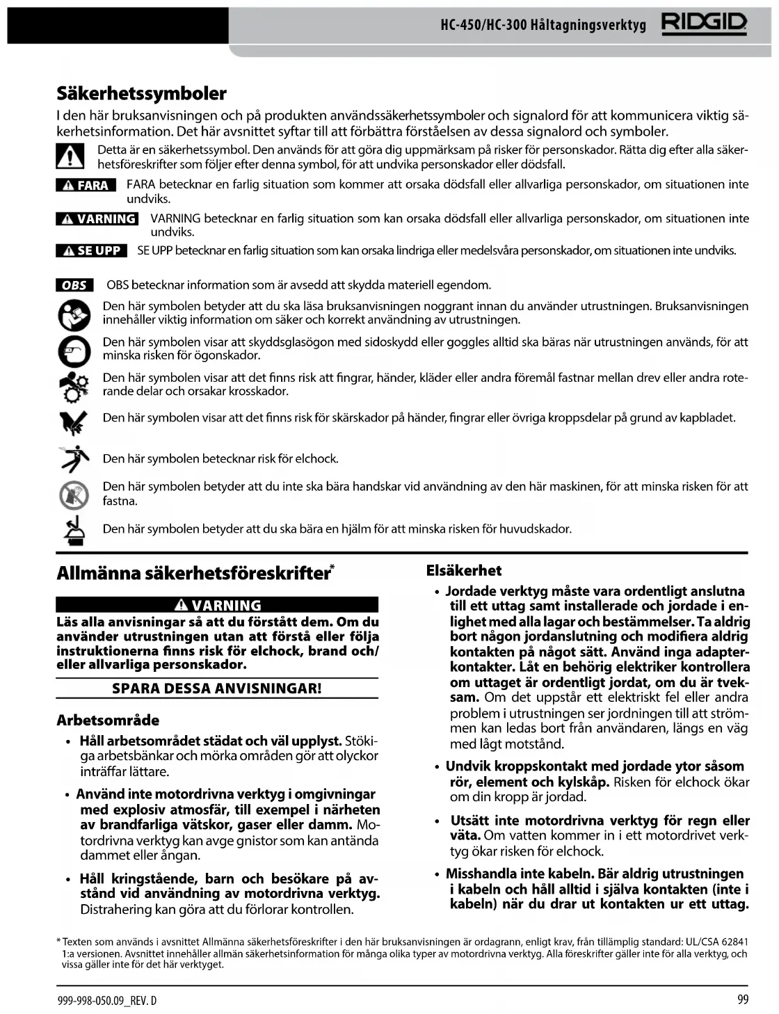 - Texten som används i avsnittet Allmänna säkerhetsföreskrifter i den här bruksanvisningen är ordagrann, enligt krav, från tillämplig standard: UL/CSA 62841 1:a versionen. Avsnittet innehåller allmän säkerhetsinformation för många olika typer av motordrivna verktyg. Alla föreskrifter gäller inte för alla verktyg, och vissa gäller inte för det här verktyget.100 HC-450/HC-300 Håltagningsverktyg 999-998-050.09_REV. DHåll kabeln på behörigt avstånd från värme, olja vassa kanter eller rörliga delar. Byt ut skadade kablar omedelbart. Skadade kablar ökar risken för elchock.