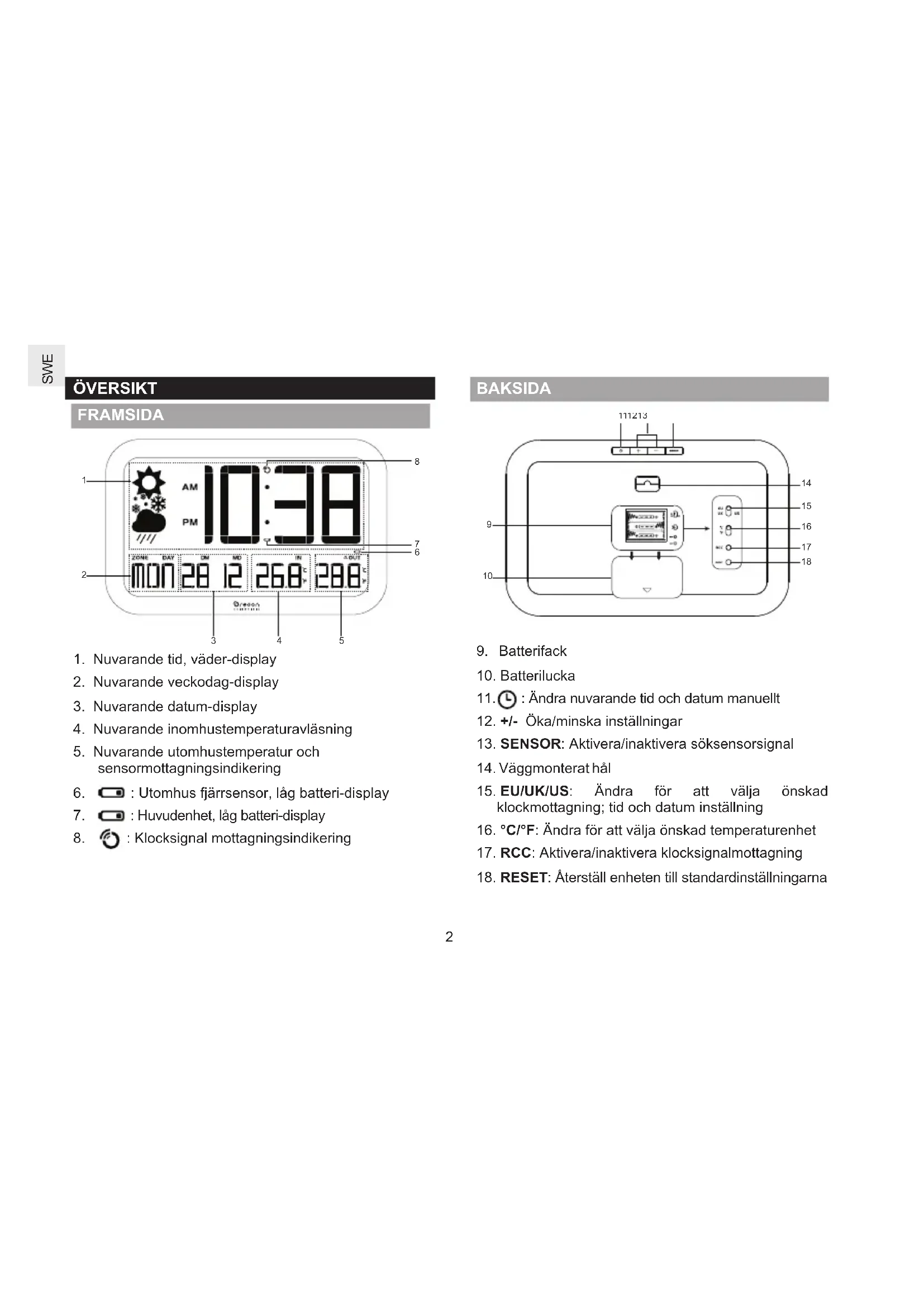 Ikonen för sensormottagningen i fjärrsensorområdet visar statusen: Skärm display Beskrivning Beskrivning Huvudenheten söker efter sensor(er). Kanalen har hittats. Sensorn kan inte hittas. TIPS Transmissionsområdet kan variera beroende på era olika faktorer. Du kan behöva experimentera med olika platser för få det bästa resultatet. KLOCKA KLOCKMOTTAGNING Klockan är konstruerad för att automatiskt synkronisera klockan med klocksignalen. Ändra för att välja önskad region (EU/UK/US). Region Signal EU DCF UK MSF US WWVB 1.5m (5ft) NOTERA Använd alkaliska batterier för längre livslängd och litiumbatterier vid temperaturer under fryspunkten.