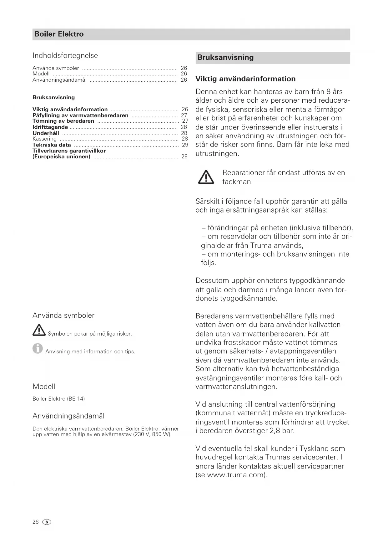 - Garantien gøres gældende hos en autoriseret servicepartner eller i Trumas serviceafdeling. Alle adresser og telefonnumre findes under www.truma.com under faneblandet »Service«. For at sikre et smidigt forløb beder vi om, at man har følgende oplysninger klar ved kontakt: – detaljeret beskrivelse af manglen – anlæggets serienummer – købsdato Den autoriserede servicepartner eller Trumas serviceafdeling fastsætter i det enkelte tilfælde, hvad der skal ske i det videre forløb. For at undgå eventuelle transportskader må det pågæl- dende anlæg kun afsendes efter forudgående aftale med den autoriserede servicepartner eller Trumas serviceafdeling. Hvis garantisagen anerkendes af producenten, påtager produ- centen sig transportomkostningerne. Såfremt der ikke forelig- ger en garantisag, informeres forbrugeren, og reparations- og transportomkostningerne afholdes af denne. Vi anmoder om, at der ikke indsendes anlæg uden forudgående aftale.26 Viktig användarinformation Denna enhet kan hanteras av barn från 8 års ålder och äldre och av personer med reducera- de fysiska, sensoriska eller mentala förmågor eller brist på erfarenheter och kunskaper om de står under överinseende eller instruerats i en säker användning av utrustningen och för- står de risker som finns. Barn får inte leka med utrustningen. Reparationer får endast utföras av en fackman. Särskilt i följande fall upphör garantin att gälla och inga ersättningsanspråk kan ställas: – förändringar på enheten (inklusive tillbehör), – om reservdelar och tillbehör som inte är ori- ginaldelar från Truma används, – om monterings- och bruksanvisningen inte följs. Dessutom upphör enhetens typgodkännande att gälla och därmed i många länder även for- donets typgodkännande. Beredarens varmvattenbehållare fylls med vatten även om du bara använder kallvatten- delen utan varmvattenberedaren. För att undvika frostskador måste vattnet tömmas ut genom säkerhets- / avtappningsventilen även då varmvattenberedaren inte används. Som alternativ kan två hetvattenbeständiga avstängningsventiler monteras före kall- och varmvattenanslutningen. Vid anslutning till central vattenförsörjning (kommunalt vattennät) måste en tryckreduce- ringsventil monteras som förhindrar att trycket i beredaren överstiger 2,8 bar. Vid eventuella fel skall kunder i Tyskland som huvudregel kontakta Trumas servicecenter. I andra länder kontaktas aktuell servicepartner (se www.truma.com). Boiler Elektro Bruksanvisning Indholdsfortegnelse Använda symboler p. 26
