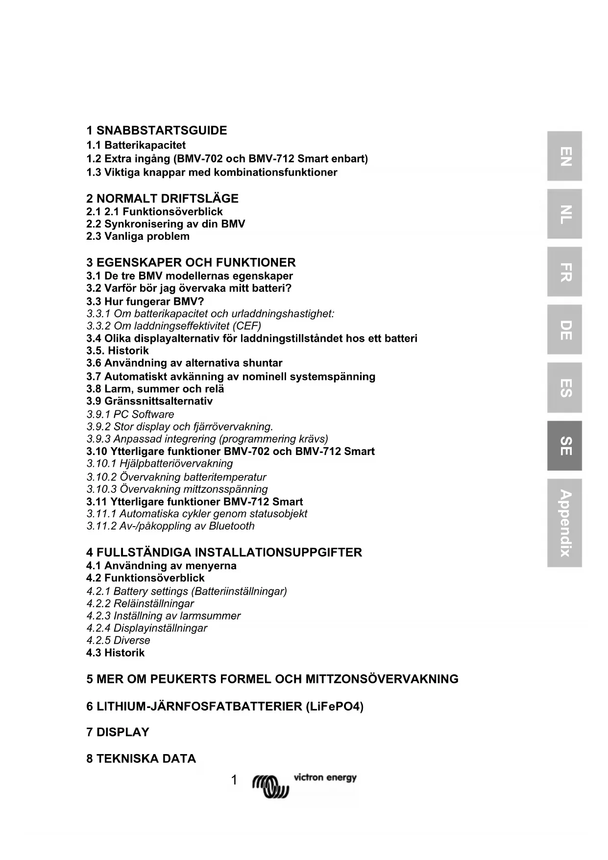 Med VE.Direct Bluetooth Smart dongle kan realtidsdata och larm visas på Apple och Android smartphones, surfplattor och andra enheter. Obs: En VE.Direct Bluetooth Smart-dongle krävs inte för BMV-712 eftersom den har Bluettooth inbyggt.7 NL FR DE ES SE IT PT EN NL FR DE ES SE Appendix