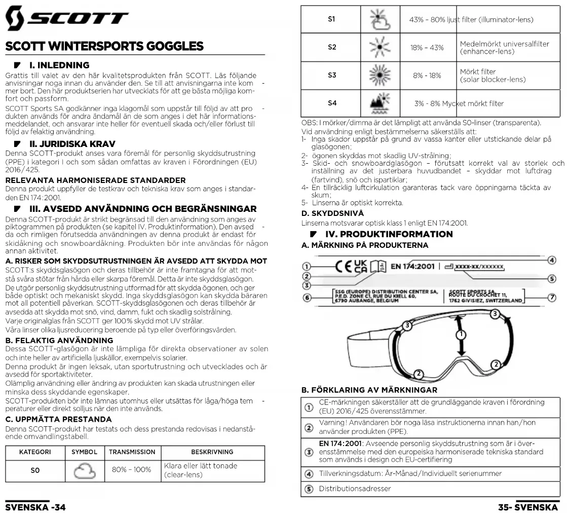 da och rimligen förutsedda användningen av denna produkt är endast för skidåkning och snowboardåkning. Produkten bör inte användas för någon annan aktivitet. A. RISKER SOM SKYDDSUTRUSTNINGEN ÄR AVSEDD ATT SKYDDA MOT SCOTT:s skyddsglasögon och deras tillbehör är inte framtagna för att mot- stå svåra stötar från hårda eller skarpa föremål. Detta är inte skyddsglasögon. De utgör personlig skyddsutrustning utformad för att skydda ögonen, och ger både optiskt och mekaniskt skydd. Inga skyddsglasögon kan skydda bäraren mot all potentiell påverkan. SCOTT-skyddsglasögonen och deras tillbehör är avsedda att skydda mot snö, vind, damm, fukt och skadlig solstrålning. Varje originalglas från SCOTT ger 100 % skydd mot UV strålar. Våra linser olika ljusreducering beroende på typ eller överföringsvärden.