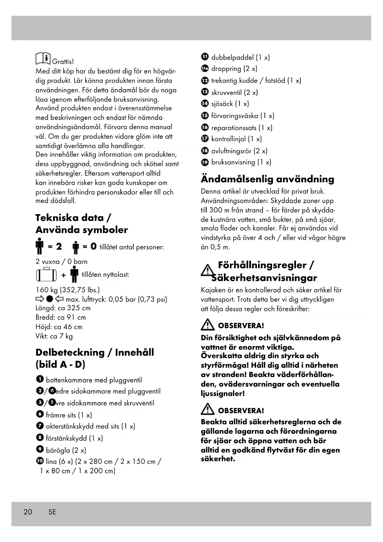 - 3 års garanti Motsvarar ISO 6185-1, Kategori III, Typ B SE20 Grattis! Med ditt köp har du bestämt dig för en högvär- dig produkt. Lär känna produkten innan första användningen. För detta ändamål bör du noga läsa igenom efterföljande bruksanvisning. Använd produkten endast i överensstämmelse med beskrivningen och endast för nämnda användningsändamål. Förvara denna manual väl. Om du ger produkten vidare glöm inte att samtidigt överlämna alla handlingar. Den innehåller viktig information om produkten, dess uppbyggnad, användning och skötsel samt säkerhetsregler. Eftersom vattensport alltid kan innebära risker kan goda kunskaper om produkten förhindra personskador eller till och med dödsfall. Tekniska data / Använda symboler tillåtet antal personer: 2 vuxna / 0 barn tillåten nyttolast: 160 kg (352,75 lbs.) max. lufttryck: 0,05 bar (0,73 psi) Längd: ca 325 cm Bredd: ca 91 cm Höjd: ca 46 cm Vikt: ca 7 kg Delbeteckning / Innehåll (bild A - D) bottenkammare med pluggventil / nedre sidokammare med pluggventil / övre sidokammare med skruvventil främre sits (1 x) akterstänkskydd med sits (1 x) förstänkskydd (1 x) bärögla (2 x) lina (6 x) (2 x 280 cm / 2 x 150 cm / 1 x 80 cm / 1 x 200 cm) dubbelpaddel (1 x) droppring (2 x) trekantig kudde / fotstöd (1 x) skruvventil (2 x) sjösäck (1 x) förvaringsväska (1 x) reparationssats (1 x) kontrollinjal (1 x) avluftningsrör (2 x) bruksanvisning (1 x) Ändamålsenlig användning Denna artikel är utvecklad för privat bruk. Användningsområden: Skyddade zoner upp till 300 m från strand – för färder på skydda- de kustnära vatten, små bukter, på små sjöar, smala floder och kanaler. Får ej användas vid vindstyrka på över 4 och / eller vid vågor högre än 0,5 m. Förhållningsregler / Säkerhetsanvisningar Kajaken är en kontrollerad och säker artikel för vattensport. Trots detta ber vi dig uttryckligen att följa dessa regler och föreskrifter: OBSERVERA! Din försiktighet och självkännedom på vattnet är enormt viktiga. Överskatta aldrig din styrka och styrförmåga! Håll dig alltid i närheten av stranden! Beakta väderförhållan- den, ovädersvarningar och eventuella ljussignaler! OBSERVERA! Beakta alltid säkerhetsreglerna och de gällande lagarna och förordningarna för sjöar och öppna vatten och bär alltid en godkänd flytväst för din egen säkerhet. SE21 VARNING! Kvävningsrisk för barn! Låt aldrig barn leka med förpackningsmaterialet eller artikeln utan uppsikt. VARNING! Skulle en person falla överbord måste kajaken alltid äntras igen via fören eller aktern. Vid äntring från sidan är risken mycket stor att kajaken kantrar. Risk för personskador! Varning för frånlandsvind! Varning för strömmar ut från land! p. 25