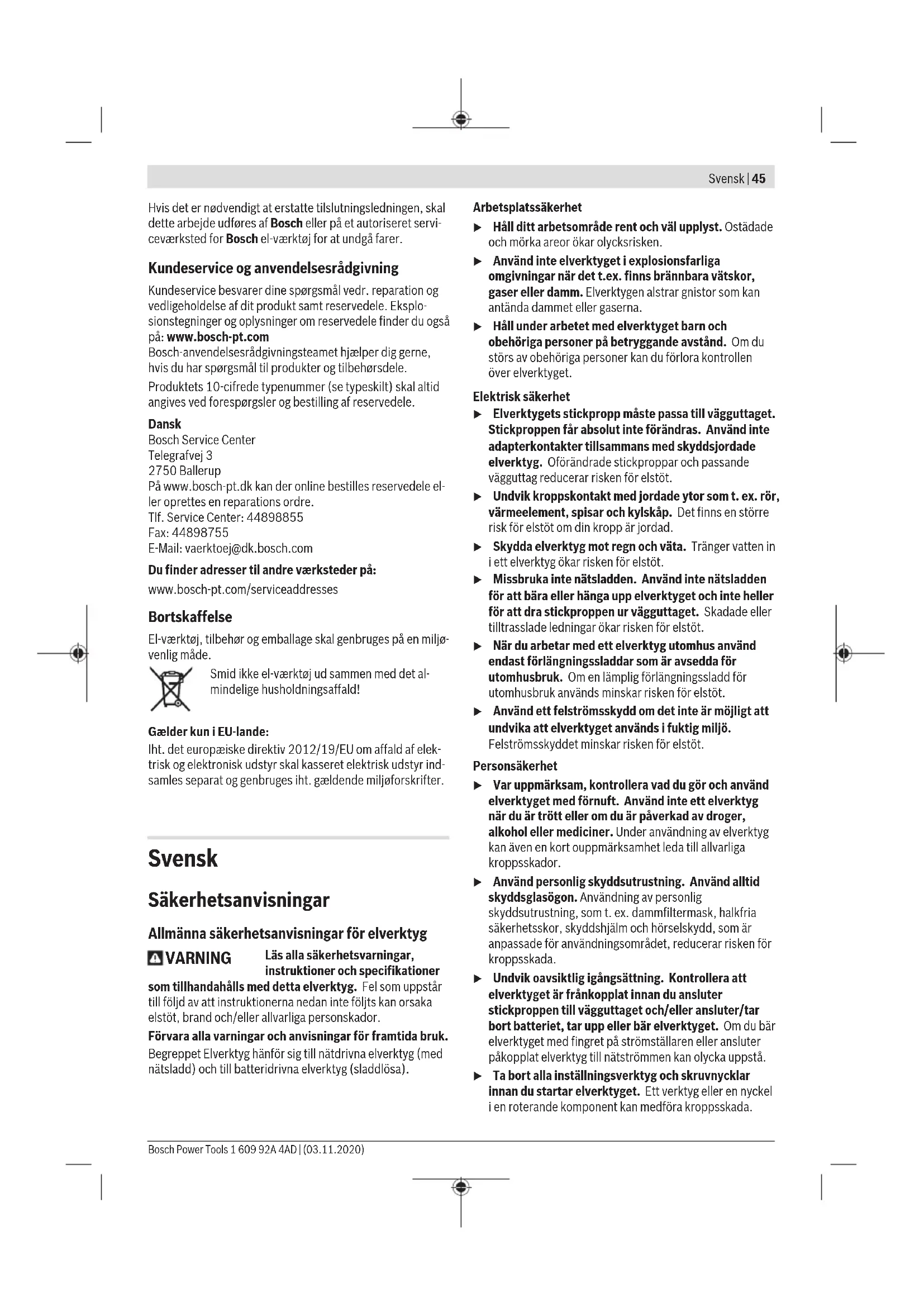 Lägg slippappret spänt över slipplattan (6). Kläm fast den främre delen av slipbladet under den främre klämlisten (12). Se till att slipbladet (9) inte är för kort och kläms fast korrekt. Sväng tillbaka plintbygeln (11) till utgångsläget och lås den där. Ohålade slipblad från t.ex. rull- och metervara kan du håla med hålverktyget (13) för dammsugningen. För att göra det trycker du på elverktyget med monterat slipblad på hålverktyget (se bild F). För att ta av slipbladet (9) lossar du båda plintbyglar (11) och drar ut slipbladet ur sin hållare. Val av slipblad Olika slipblad finns tillgängliga beroende på vilket material som används och önskad avverkning: Kornstorlek För bearbetning av samtliga trämaterial 40 – 240 För förslipning, t.ex. av obearbetade, ohyvlade balkar och brädor grov 40, 60 För planslipning och utjämning av mindre ojämnheter medel 80, 120 För slut- och finslipning av hårt trä fin 180, 240 För bearbetning av färg- och lackskikt resp. grundning som fyllning och spackel 40 – 240 För avslipning av färg grov 40, 60 För slipning av grundfärg medel 80, 120 Kornstorlek För slutslipning av grundfärg innan lackering fin 180, 240 Damm-/spånutsugning Dammet från material som t.ex. blyhaltig målning, vissa träslag, mineraler och metall kan vara hälsovådligt. Beröring eller inandning av dammet kan orsaka allergiska reaktioner och/eller andningsbesvär hos användaren eller personer som uppehåller sig i närheten. Vissa damm från ek eller bok anses vara cancerogena, speciellt då i förbindelse med tillsatsämnen för träbehandling (kromat, träkonserveringsmedel). Endast yrkesmän får bearbeta asbesthaltigt material. – Använd om möjligt en för materialet lämplig dammutsugning. – Se till att arbetsplatsen är väl ventilerad. – Vi rekommenderar ett andningsskydd i filterklass P2. Beakta de föreskrifter som i aktuellt land gäller för bearbetat material. u Undvik dammanhopning på arbetsplatsen. Damm kan lätt självantändas. Eget utsug med dammbox (se bild G–J) Skjut på dammboxen (2) på utblåsstutsen (14). Påfyllningsnivån för dammboxen (2) kan lätt kontrolleras genom den genomskinliga behållaren. För att tömma dammboxen (2), dra den lätt bakåt. Skruva av filterelementet (15) från dammboxen (2). Töm dammboxen. Knacka ut filterelementet (15) lätt på ett fast underlag för att lossa dammet. Rengör lamellerna på filterelementet (15) med en mjuk borste. Observera: För att garantera en optimal dammutsugning, töm dammboxen (2) och rengör filterelementet (15) regelbundet. Håll elverktyget så att dammboxen (2) visar neråt under arbetet. Extern bortsugning (se bild K) Sätt på bortsugningsslangen (16) (tillbehör) utblåsningsstutsen (14). Anslut sugslangen (16)t till en sug (tillbehör). Sugen måste vara lämplig för det material som ska bearbetas. Använd en specialsug för att suga hälsovådligt och cancerframkallande eller torrt damm. Vid arbeten på lodräta ytor håller du elverktyget så att utsugsslangen pekar nedåt. Drift Driftstart u Beakta nätspänningen! Kontrollera att strömkällans spänning överensstämmer med uppgifterna på 1 609 92A 4AD | (03.11.2020) Bosch Power ToolsNorsk | 49 elverktygets typskylt. Elverktyg märkta med 230V kan även anslutas till 220V. In- och urkoppling u Se till att du kan manövrera på-/av-strömbrytaren utan att släppa handtaget. För att slå på elverktyget, skjut på-/av-knappen (1) åt höger till position ”I”. För att stänga av elverktyget, skjut på-/av-knappen (1) åt vänster till position ”O”. Arbetsanvisningar u Dra stickproppen ur nätuttaget innan arbeten utförs på elverktyget. u Vänta tills elverktyget stannat helt innan du lägger bort det. Avverkning vid slipning beror i huvudsak på val av slipblad. Endast felfria slipblad ger en god slipeffekt och skonar samtidigt elverktyget. Ett jämnt anliggningstryck förlänger slipbladens livslängd. Ett kraftigt ökat anliggningstryck ger inte en högre slipeffekt utan ett ökat slitage på elverktyget och slipbladet. Ett slipblad, som använts för slipning av metall får inte längre användas för andra material. Använd endast originaltillbehör från Bosch. Underhåll och service Underhåll och rengöring u Dra stickproppen ur nätuttaget innan arbeten utförs på elverktyget. u Håll elverktyget och dess ventilationsöppningar rena för bra och säkert arbete. Om nätsladden för bibehållande av verktygets säkerhet måste bytas ut, ska byte ske hos Bosch eller en auktoriserad serviceverkstad för Bosch elverktyg. Kundtjänst och applikationsrådgivning Kundservicen ger svar på frågor beträffande reparation och underhåll av produkter och reservdelar. Explosionsritningar och informationer om reservdelar hittar du också under: www.bosch-pt.com Boschs applikationsrådgivnings-team hjälper dig gärna med frågor om våra produkter och tillbehören till dem. Ange alltid vid förfrågningar och reservdelsbeställningar det 10‑siffriga produktnumret som finns på produktens typskylt. Svenska Bosch Service Center Telegrafvej 3 2750 Ballerup Danmark Tel.: (08) 7501820 (inom Sverige) Fax: (011) 187691 Du hittar fler kontaktuppgifter till service här: www.bosch-pt.com/serviceaddresses Avfallshantering Elverktyg, tillbehör och förpackning ska omhändertas på miljövänligt sätt för återvinning. Släng inte elverktyg bland hushållsavfallet! Endast för EU‑länder: Enligt det europeiska direktivet 2012/19/EU om förbrukade elektriska och elektroniska apparater och dess omsättning i nationell rätt måste obrukbara elverktyg omhändertas separat och på ett miljövänligt sätt lämnas in för återvinning. Norsk Sikkerhetsanvisninger Generelle sikkerhetsanvisninger for elektroverktøy ADVARSEL Les alle sikkerhetsanvisningene, instruksjonene, illustrasjonene og spesifikasjonene som følger med dette elektroverktøyet. Manglende overholdelse av anvisningene n