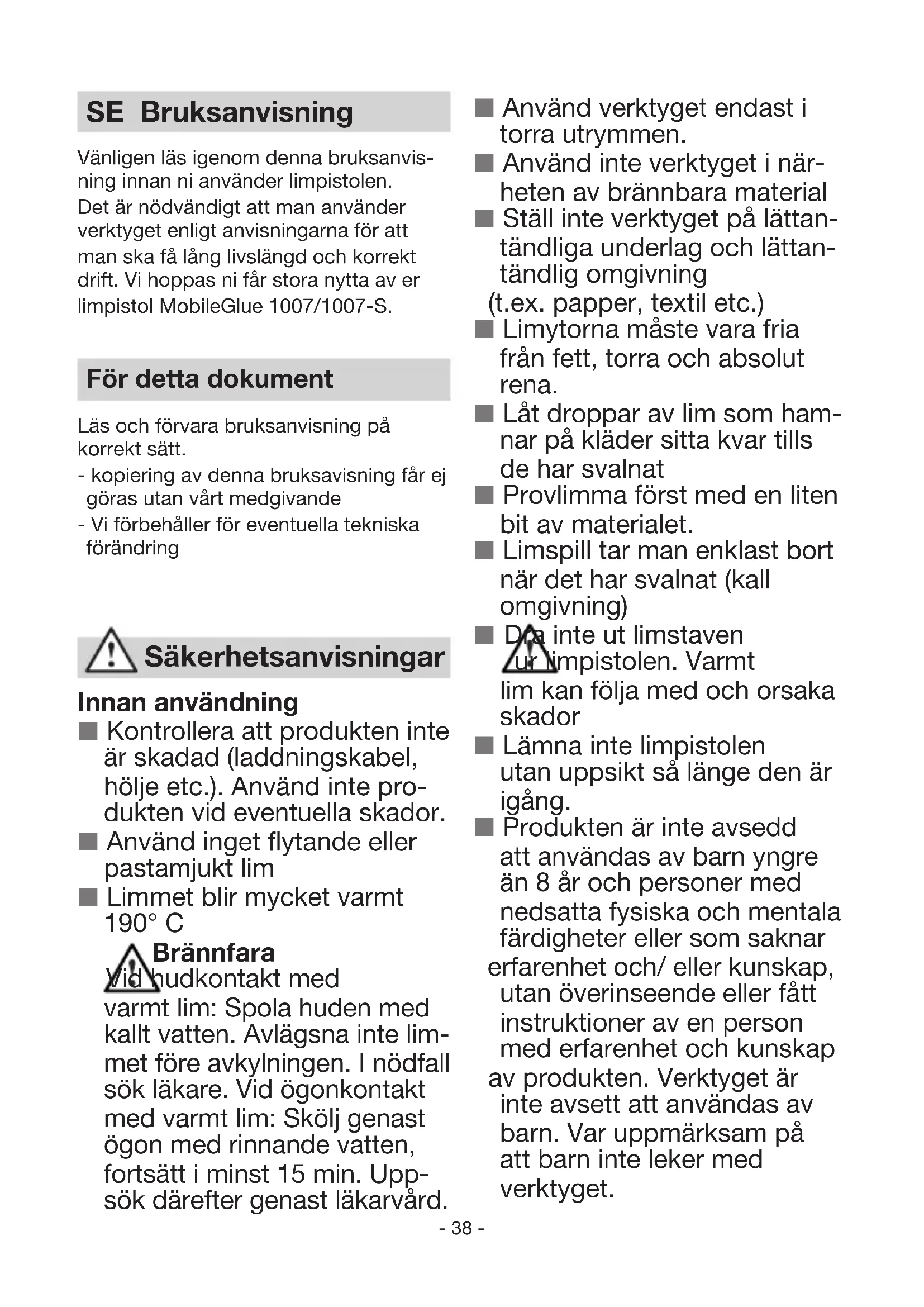 DO FABRICANTE GARANTIA ANOS DO FABRICANTE GARANTIA ANOS DO FABRICANTE PT- 38 - SE Bruksanvisning Vänligen läs igenom denna bruksanvis- ning innan ni använder limpistolen. Det är nödvändigt att man använder verktyget enligt anvisningarna för att man ska få lång livslängd och korrekt drift. Vi hoppas ni får stora nytta av er limpistol MobileGlue 1007/1007-S. För detta dokument Läs och förvara bruksanvisning på korrekt sätt. - kopiering av denna bruksavisning får ej göras utan vårt medgivande - Vi förbehåller för eventuella tekniska förändring Innan användning Kontrollera att produkten inte är skadad (laddningskabel, hölje etc.). Använd inte pro- dukten vid eventuella skador. Använd inget flytande eller pastamjukt lim Limmet blir mycket varmt 190° C Brännfara Vid hudkontakt med varmt lim: Spola huden med kallt vatten. Avlägsna inte lim- met före avkylningen. I nödfall sök läkare. Vid ögonkontakt med varmt lim: Skölj genast ögon med rinnande vatten, fortsätt i minst 15 min. Upp- sök därefter genast läkarvård. Säkerhetsanvisningar Använd verktyget endast i torra utrymmen. Använd inte verktyget i när- heten av brännbara material Ställ inte verktyget på lättan- tändliga underlag och lättan- tändlig omgivning (t.ex. papper, textil etc.) Limytorna måste vara fria från fett, torra och absolut rena. Låt droppar av lim som ham- nar på kläder sitta kvar tills de har svalnat Provlimma först med en liten bit av materialet. Limspill tar man enklast bort när det har svalnat (kall omgivning) Dra inte ut limstaven ur limpistolen. Varmt lim kan följa med och orsaka skador Lämna inte limpistolen utan uppsikt så länge den är igång. Produkten är inte avsedd att användas av barn yngre än 8 år och personer med nedsatta fysiska och mentala färdigheter eller som saknar erfarenhet och/ eller kunskap, utan överinseende eller fått instruktioner av en person med erfarenhet och kunskap av produkten. Verktyget är inte avsett att användas av barn. Var uppmärksam på att barn inte leker med verktyget.- 39 - Bäst limresultat och lång livslängd på limpistolen får man med STEINEL limstavar. USB-laddkabel Håll laddningskabeln ren. Det finns risk för elektriska stötar på grund av smuts. Förvara verktyget i tempera- tur mellan 0 – 35° C Ladda bara apparaten med den medföljande USB-laddningskabeln ( typ 15.3841). Ladda inte batterier från tredje part. I an- nat fall finns risk för brand och explosion. Batteri Öppna inte limpistolen och batteriet. Då är det stor risk för kortslutning. Batteriet får inte tas bort eller bytas. Vänd er i så fall till närmaste åter- försäljare. Ett Li-Ion batteri kan laddas ur många gånger utan att livslängden förkortas. Ett avbrott av laddningen skadar inte batteriet. Om man inte ska använda limpistolen på ett tag, bör man förvara den med full- laddat batteri. Det förlänger batteriets livslängd. Vid skada eller felaktig Användningsområde Det här verktyget är avsett för lim som är fritt från lösningsmedel och används för reparation, dekoration och hobbyar- beten. användning av batteriet kan fukt (ånga) komma ut från batteriet. I så fall vädra och uppsök frisk luft, vid besvär med luftvägar uppsök läkarna. Materialanvändning Allroundlim för reparation, dekoration och hobby-arbeten, avsedd för papper, kartong, kork, trä, läder, textil, plast, keramik, kakel m.m. SESE- 40 - Produktbeskrivning USB-laddningskabel LED visning Uttag för laddningskabel Knapp PÅ/AV Matning Limstav Funktion och användning ■ Vid första användningstillfället bör man ladda batteriet i 5 timmar för att förlänga livslängden för batterier (se laddning/drift). ■ Stick in limstaven baktill på värmeka- nalen. ■ Vid första användningstillfället måste trycka några gånger på frammatning- en för att fylla värmekammaren med lim. Man kan också behöva trycka lätt på limstaven för att få igång frammat- ningen. ■ För att man inte av misstag ska kunna starta limpistolen måste startknap- pen vara intryckt ca 2 sekunder. En grön Led blinkar i 15 sekunder. ■ Tryck in frammatning för limmet och applicera limmet i lagom dos. ■ Pressa kraftigt ihop det limmade ma- terialet. Laddning - användning Batteriet till MobileGlue 1007/1007-S levereras med delvis laddat batteri. Vid en första laddning tar det ca 2-3 tim- mar innan batteriet är fulladdat. Under laddning av batteriet kan MobileGlue 1007/1007-S inte användas. Batteri kan laddas ur många gånger utan att livslängden förkortas. Ett avbrott av laddningen skadar inte batteriet. Tack vare Elektronisk Cell Skydd (ECP) är bat- teriet skyddat mot djupurladdning. När batteriet är urladdat stängs MobileGlue 1007/1007-S av. ■ Redan efter ca. 2 minuter är limfogen fullt belastningsbar. ■ Applicera limmet som punkter vid stora och långa limytor. ■ Formskum ( t. ex styropor) kan enkelt limmas. Viktigt är att limmet inte appliceras på styroporplasten utan på det andra materialet. ■ Vid limning av textil och läder bör lim- fogen läggas som en ringlande linje. ■ Se till att verktyget kyls efter användning. Laddnings faser USB-laddstation Knapp LED röd LED grön PÅ/AV Batteriet laddas. Limpistolen kan användas under en begränsad tid Klar att använda, batteriet laddat- 41 - Användning/limning Knapp LED röd LED grön PÅ Laddad. Tryck på startknappen i ca 2 sek. Grön LED-lampa blinkar i 15 sek. Limpistolen är i drift Efter 5 minuter stängs limpistolen av automatiskt, varje användningstillfälle återställer tiden. Limpistolen är i drift Efter 5 minuter stängs limpistolen av automatiskt, varje användningstillfälle återställer tiden. Röd LED-lampa blinkar efter 20 minuters använd- ning. Limpistolen kan dock användas i ytterligare 10 min. Röd LED-lampa blinkar 1×. Batteriet är urladdat, ladda batteriet i laddstationen. Mått (H × B × D): MobileGlue 1007 MobileGlue 1007-S 157×47