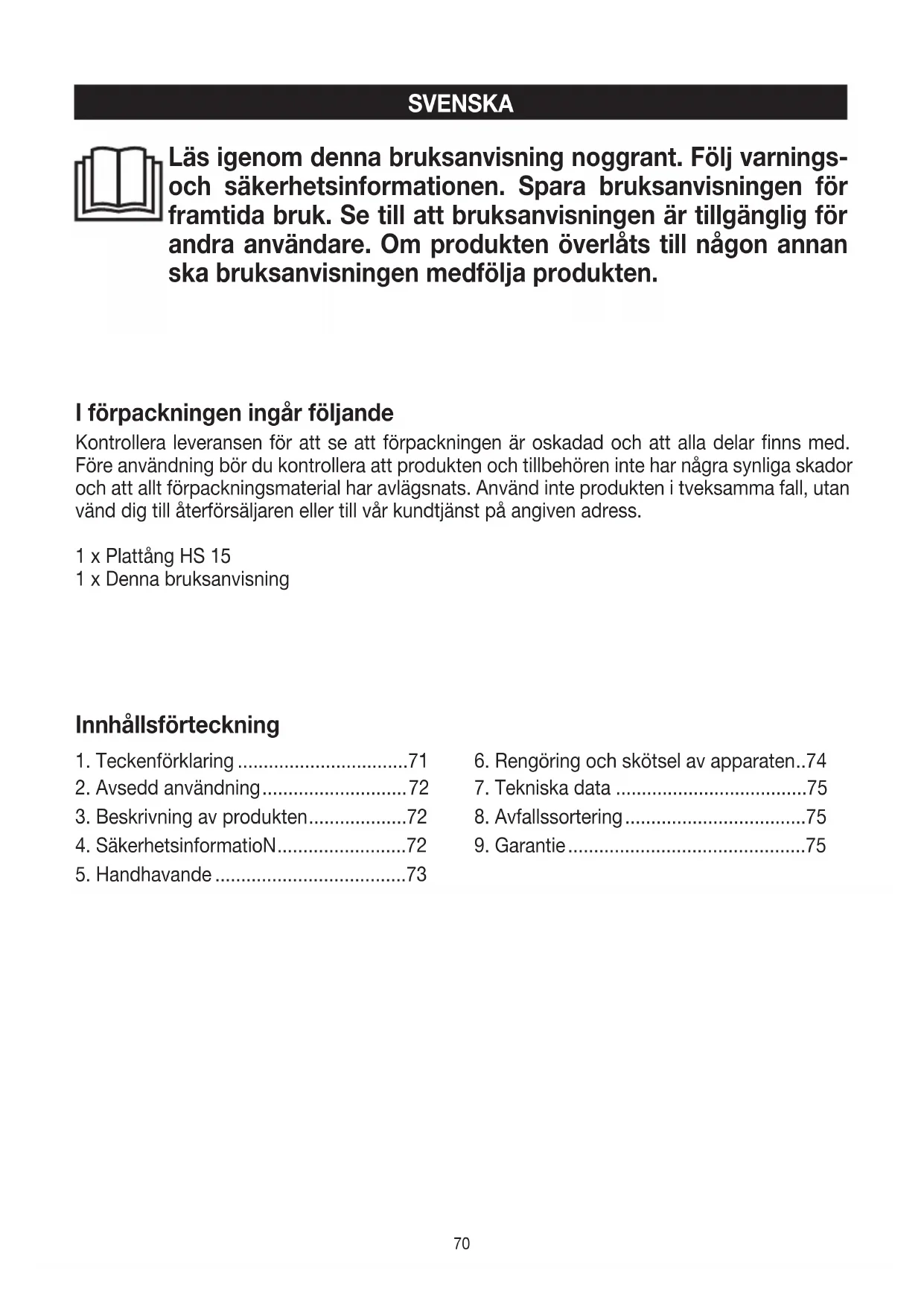 Nærmere oplysninger om garantien og garantibetingelserne findes i det medfølgende garan- tihæfte. Med forbehold for fejl og ændringer70 SVENSKA Läs igenom denna bruksanvisning noggrant. Följ varnings- och säkerhetsinformationen. Spara bruksanvisningen för framtida bruk. Se till att bruksanvisningen är tillgänglig för andra användare. Om produkten överlåts till någon annan ska bruksanvisningen medfölja produkten. I förpackningen ingår följande Kontrollera leveransen för att se att förpackningen är oskadad och att alla delar finns med. Före användning bör du kontrollera att produkten och tillbehören inte har några synliga skador och att allt förpackningsmaterial har avlägsnats. Använd inte produkten i tveksamma fall, utan vänd dig till återförsäljaren eller till vår kundtjänst på angiven adress. 1 x Plattång HS 15 1 x Denna bruksanvisning