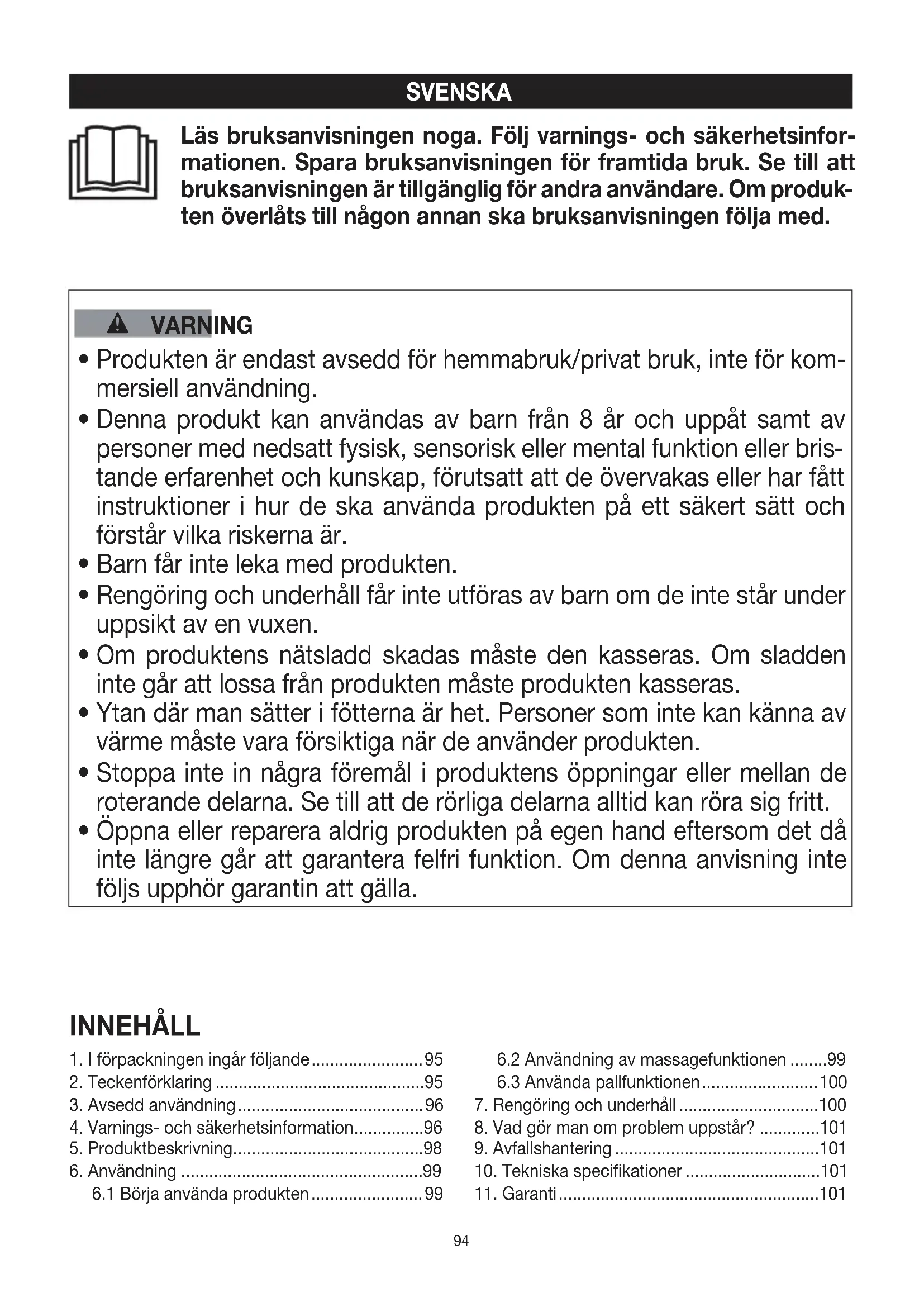 - Ytan där man sätter i fötterna är het. Personer som inte kan känna av värme måste vara försiktiga när de använder produkten.