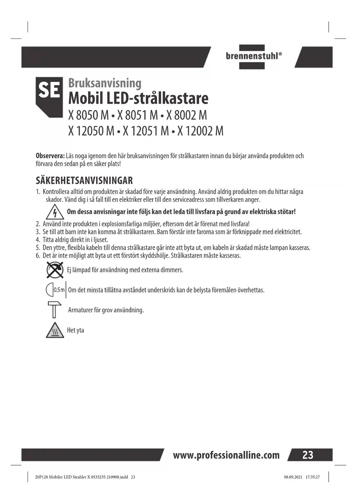 Bruksanvisning Mobil LED-strålkastare X 8050 M • X 8051 M • X 8002 M X 12050 M • X 12051 M • X 12002 M Observera: Läs noga igenom den här bruksanvisningen för strålkastaren innan du börjar använda produkten och förvara den sedan på en säker plats!SÄKERHETSANVISNINGAR1. Kontrollera alltid om produkten är skadad före varje användning. Använd aldrig produkten om du hittar några skador. Vänd dig i så fall till en elektriker eller till den serviceadress som tillverkaren anger. Om dessa anvisningar inte följs kan det leda till livsfara på grund av elektriska stötar!2. Använd inte produkten i explosionsfarliga miljöer, eftersom det är förenat med livsfara!3. Se till att barn inte kan komma åt strålkastaren. Barn förstår inte farorna som är förknippade med elektricitet.4. Titta aldrig direkt in i ljuset.5. Den yttre, exibla kabeln till denna strålkastare går inte att byta ut, om kabeln är skadad måste lampan kasseras.6. Det är inte möjligt att byta ut ett förstört skyddshölje. Strålkastaren måste kasseras. Ej lämpad för användning med externa dimmers. Om det minsta tillåtna avståndet underskrids kan de belysta föremålen överhettas. Armaturer för grov användning. Het yta 20P128 Mobiler LED Strahler X 0533235 210908.indd 2320P128 Mobiler LED Strahler X 0533235 210908.indd 23 08.09.2021 17:35:2708.09.2021 17:35:27www.brennenstuhl.com