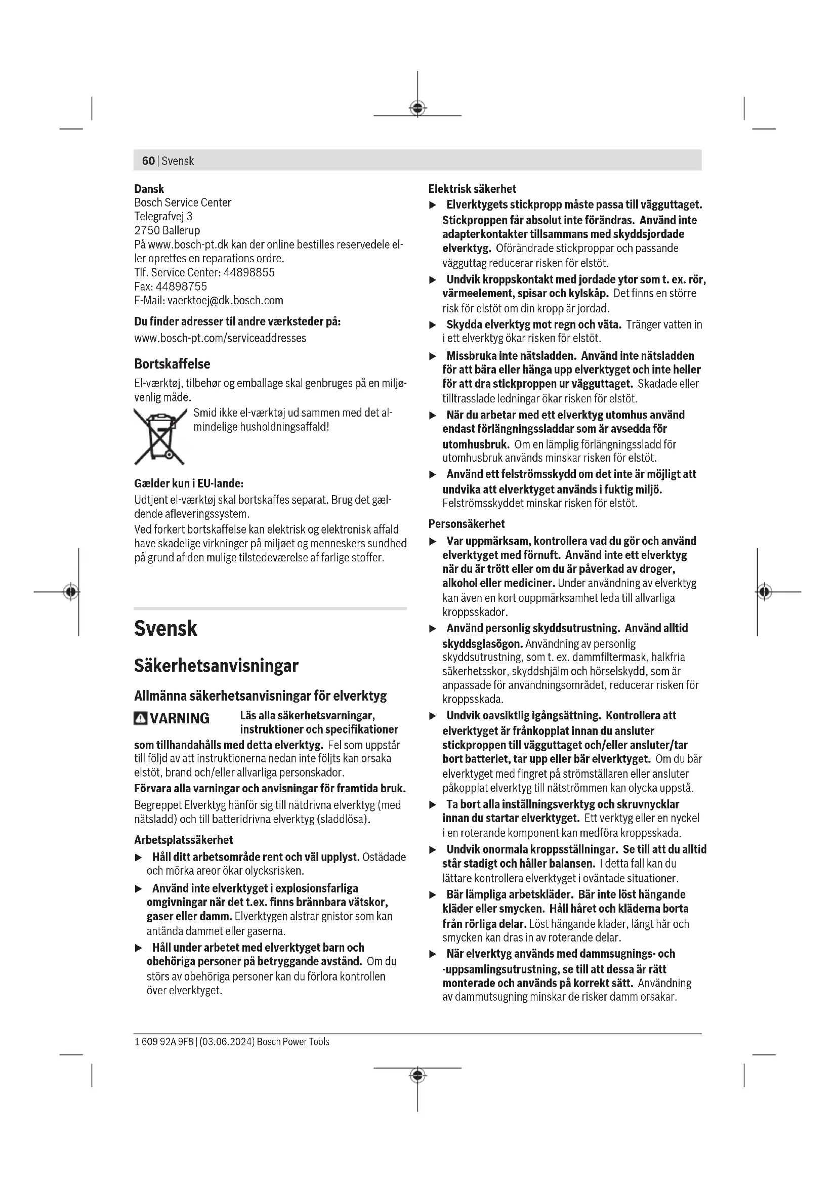 Snitmarkeringen 0° (9) viser savklingens position ved retvinklede snit. Snitmarkeringen 45° (8) viser savklingens position ved 45°-snit. For at opnå et nøjagtigt snit skal du sætte rundsaven an mod emnet som vist på billedet. Det anbefales at lave et prøve- snit. Ibrugtagning u Kontroller netspændingen! Strømkildens spænding skal stemme overens med angivelserne på el-værktøjets type- skilt. Tænd/sluk For ibrugtagning af el-værktøjet skal du først aktivere kon- taktspærren (2) og derefter trykke på tænd/sluk-kontakten (1) og holde den inde. El‑værktøjet slukkes ved at slippe tænd/sluk-kontakten (1) igen. Bemærk: Af sikkerhedsgrunde kan tænd/sluk-kontakten (1) ikke fastlåses, men skal trykkes ned og holdes nede, så læn- ge saven er i drift. Arbejdsvejledning u Træk stikket ud af stikkontakten, før der udføres ar- bejde på el‑værktøjet. Snitbredden varierer afhængigt af den anvendte savklinge. Beskyt savklinger mod stød og slag. Før el-værktøjet jævnt og med et let skub i skæreretningen for at opnå en god skærekvalitet. For kraftig fremføring redu- cerer levetiden indsatsværktøjernes levetid betydeligt og kan beskadige el-værktøjet. Arbejd altid med en konstant fremføringshastighed, og sørg for, at savklingens hastighed forbliver konstant. Undgå at øge fremføringshastigheden (f.eks.ved bearbejdning af fug- tigt træ, trykimprægneret træ eller knaster) og den dermed forbundne reduktion af hastigheden for at forhindre overop- hedning af savklingens tænder. Saveydelsen og snitkvaliteten afhænger i væsentlig grad af savklingens tilstand og tandform. Brug derfor kun skarpe savklinger, som er egnede til det materiale, der skal bear- bejdes. Når du starter eller fortsætter en saveproces, skal du centre- re savklingen i savsporet og sikre, at savtænderne ikke sid- der fast i arbejdsemnet. På den måde undgår du, at el-værk- tøjet springer tilbage, og savklingen bevæger sig op af ar- bejdsemnet. Savning af træ Valget af korrekt savklinge afhænger af trætype, trækvalitet og af, om der skal udføres længde- eller tværsnit. Ved længdesnit af grantræ opstår der lange, spiralformede spåner. Bøgetræs- og egetræsstøv er særlig sundhedsskadeligt, og arbejdet bør derfor kun udføres med støvudsugning. Savning med parallelanslag (se billede D) Med parallelanslaget (10) kan du udføre præcise snit langs med en emnekant eller skære tynde, aflange stykker med samme størrelse. Løsn vingeskruen (7), og skub parallelanslagets skala (10) gennem føringen i bundpladen (12). Indstil den ønskede snitbredde som skalaværdi på den pågældende snitmarke- ring (9) eller (8), se afsnit "Snitmarkeringer". Skru vinge- skruen (7) fast igen. Savning med hjælpeanslag (se billede E) Til bearbejdning af store emner eller til skæring af lige kanter kan du fastgøre et bræt eller en liste som hjælpeanslag på emnet og føre rundsaven hele vejen med grundpladen på hjælpeanslaget. Vedligeholdelse og service Vedligeholdelse og rengøring u Træk stikket ud af stikkontakten, før der udføres ar- bejde på el‑værktøjet. u El‑værktøj og el‑værktøjets ventilationsåbninger skal altid holdes rene for at sikre et godt og sikkert ar- bejde. Hvis det er nødvendigt at erstatte tilslutningsledningen, skal dette arbejde udføres af Bosch eller på et autoriseret servi- ceværksted for Bosch el‑værktøj for at undgå farer. Pendulbeskyttelsesskærmen skal altid kunne bevæge sig frit og lukke automatisk. Derfor skal området omkring beskyt- telsesskærmen altid være rent. Fjern støv og spåner med en pensel. Ikke-coatede savklinger kan bestryges med et lag tyndt syre- fri olie, så de beskyttes mod korrosion. Fjern olien igen før savning, da træet ellers bliver plettet. Harpiks- eller limrester på savklingen forringer snitkvalite- ten. Rengør derfor savklinger straks efter brug. Kundeservice og anvendelsesrådgivning Kundeservice besvarer dine spørgsmål vedr. reparation og vedligeholdelse af dit produkt samt reservedele. Eksplo- sionstegninger og oplysninger om reservedele finder du også på: www.bosch-pt.com Bosch-anvendelsesrådgivningsteamet hjælper dig gerne, hvis du har spørgsmål til produkter og tilbehørsdele. Produktets 10‑cifrede typenummer (se typeskilt) skal altid angives ved forespørgsler og bestilling af reservedele. Bosch Power Tools 1 609 92A 9F8 | (03.06.2024)60 | Svensk Dansk Bosch Service Center Telegrafvej 3 2750 Ballerup På www.bosch-pt.dk kan der online bestilles reservedele el- ler oprettes en reparations ordre. Tlf. Service Center: 44898855 Fax: 44898755 E-Mail: vaerktoej@dk.bosch.com Du finder adresser til andre værksteder på: www.bosch-pt.com/serviceaddresses Bortskaffelse El‑værktøj, tilbehør og emballage skal genbruges på en miljø- venlig måde. Smid ikke el-værktøj ud sammen med det al- mindelige husholdningsaffald! Gælder kun i EU‑lande: Udtjent el-værktøj skal bortskaffes separat. Brug det gæl- dende afleveringssystem. Ved forkert bortskaffelse kan elektrisk og elektronisk affald have skadelige virkninger på miljøet og menneskers sundhed på grund af den mulige tilstedeværelse af farlige stoffer. Svensk Säkerhetsanvisningar Allmänna säkerhetsanvisningar för elverktyg VARNING Läs alla säkerhetsvarningar, instruktioner och specifikationer som tillhandahålls med detta elverktyg. Fel som uppstår till följd av att instruktionerna nedan inte följts kan orsaka elstöt, brand och/eller allvarliga personskador. Förvara alla varningar och anvisningar för framtida bruk. Begreppet Elverktyg hänför sig till nätdrivna elverktyg (med nätsladd) och till batteridrivna elverktyg (sladdlösa). Arbetsplatssäkerhet u Håll ditt arbetsområde rent och väl upplyst. Ostädade och mörka areor ökar olycksrisken. u Använd inte elverktyget i explosionsfarliga omgivningar när det t.ex. finns brännbara vätskor, gaser eller damm. Elverktygen alstrar gnistor som kan antända