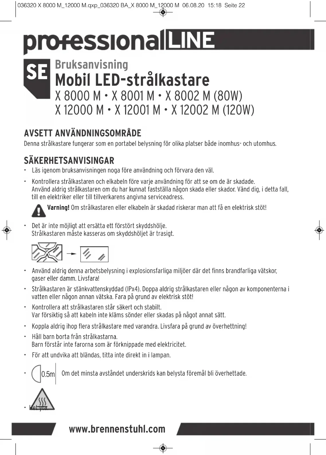 Lampan innehåller inga komponenter som behöver underhållas. Det är inte möjligt att byta ut den här lampans ljuskälla. När ljuskällan har uppnått slutet av sitt serviceliv måste man byta ut hela lampan. Ljusarmaturen får inte öppnas. Stäng av strålkastaren före rengöringen och dra ur kontakten. Rengör strålkastaren regelbundet med en torr och luddfri trasa. Använd eventuellt en lätt fuktad trasa för att få bort envis smuts. Använd inte lösningsmedel, frätande rengöringsmedel eller liknande. C C www.brennenstuhl.com24 036320 X 8000 M_12000 M.qxp_036320 BA_X 8000 M_12000 M 06.08.20 15:18 Seite 24KONFORMITET Konformiteten förvaras hos tillverkaren. AVFALLSHANTERING Kassera elektriska apparater på ett miljövänligt sätt! Elektriska apparater hör inte till hushållsavfall! Enligt EU-direktiv 2012/19 / EU om avfall av elektrisk och elektronisk utrustning, måste elektriska apparater samlas separat och återvinnas på ett miljövänligt sätt. Möjligheter att avfallshantera den uttjänta apparaten kan kommunalförvaltningen informera om. ADRESSEN Hugo Brennenstuhl GmbH & Co. KG Seestraße 1 – 3 · D-72074 Tübingen För mer information rekommenderar vi området Service/FAQ:s på vår webbplats www.brennenstuhl.com. H. Brennenstuhl S.A.S. 4 rue de Bruxelles · F-67170 Bernolsheim lectra technik ag Blegistrasse 13 · CH-6340 Baar www.professionalline.com 25 036320 X 8000 M_12000 M.qxp_036320 BA_X 8000 M_12000 M 06.08.20 15:18 Seite 25UŻYTKOWANIE ZGODNE Z PRZEZNACZENIEM Ten naświetlacz jest przeznaczony do oświetlania stref wewnątrz i na zewnątrz budynku z możliwością swobodnej zmiany miejsca ustawienia.