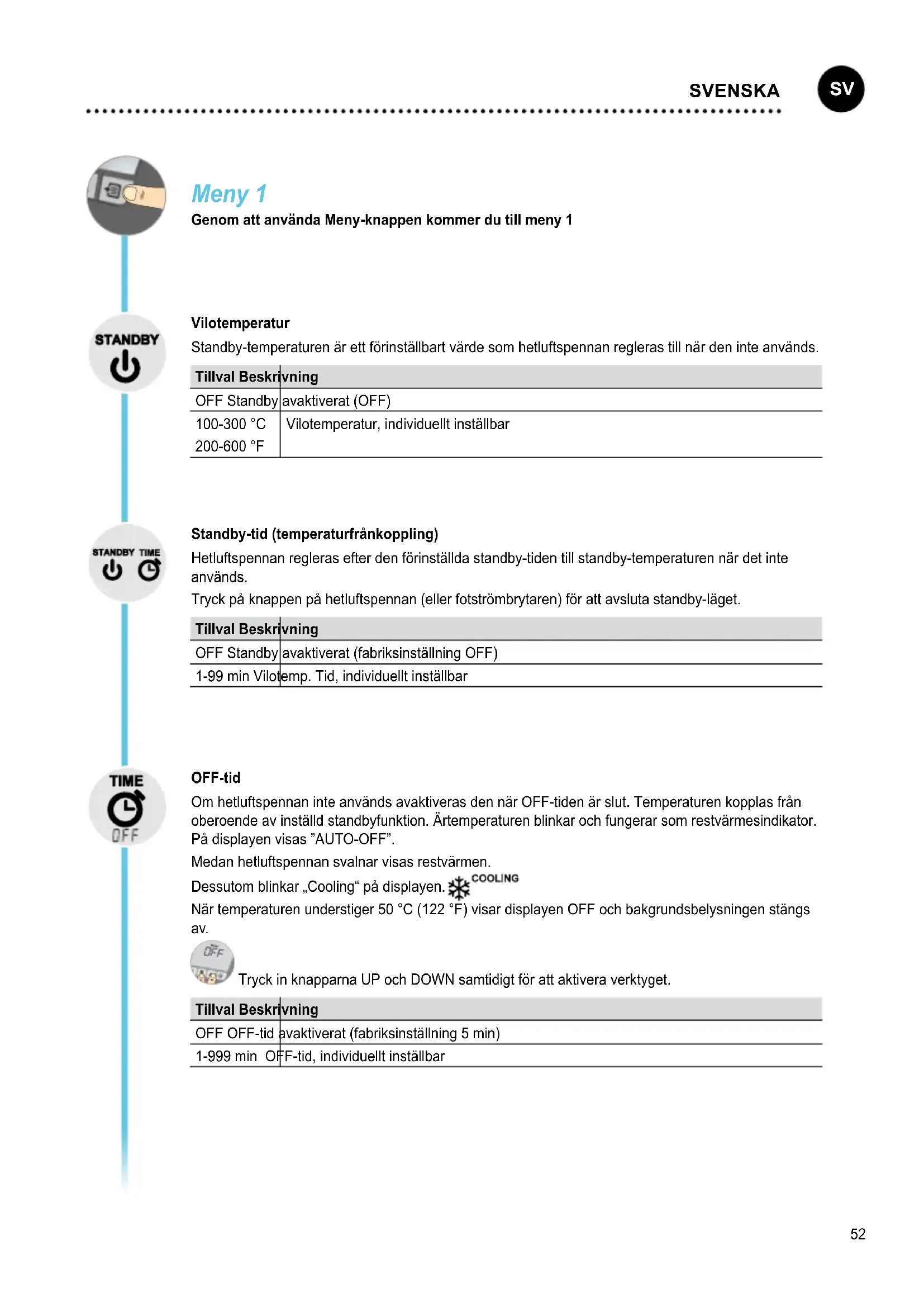 NEDERLANDS52 Meny 1 Genom att använda Meny-knappen kommer du till meny 1 Vilotemperatur Standby-temperaturen är ett förinställbart värde som hetluftspennan regleras till när den inte används. Tillval Beskrivning OFF Standby avaktiverat (OFF) 100-300 °C 200-600 °F Vilotemperatur, individuellt inställbar Standby-tid (temperaturfrånkoppling) Hetluftspennan regleras efter den förinställda standby-tiden till standby-temperaturen när det inte används. Tryck på knappen på hetluftspennan (eller fotströmbrytaren) för att avsluta standby-läget. Tillval Beskrivning OFF Standby avaktiverat (fabriksinställning OFF) 1-99 min Vilotemp. Tid, individuellt inställbar OFF-tid Om hetluftspennan inte används avaktiveras den när OFF-tiden är slut. Temperaturen kopplas från oberoende av inställd standbyfunktion. Ärtemperaturen blinkar och fungerar som restvärmesindikator. På displayen visas ”AUTO-OFF”. Medan hetluftspennan svalnar visas restvärmen. Dessutom blinkar „Cooling“ på displayen. När temperaturen understiger 50 °C (122 °F) visar displayen OFF och bakgrundsbelysningen stängs av. Tryck in knapparna UP och DOWN samtidigt för att aktivera verktyget. Tillval Beskrivning OFF OFF-tid avaktiverat (fabriksinställning 5 min) 1-999 min OFF-tid, individuellt inställbar