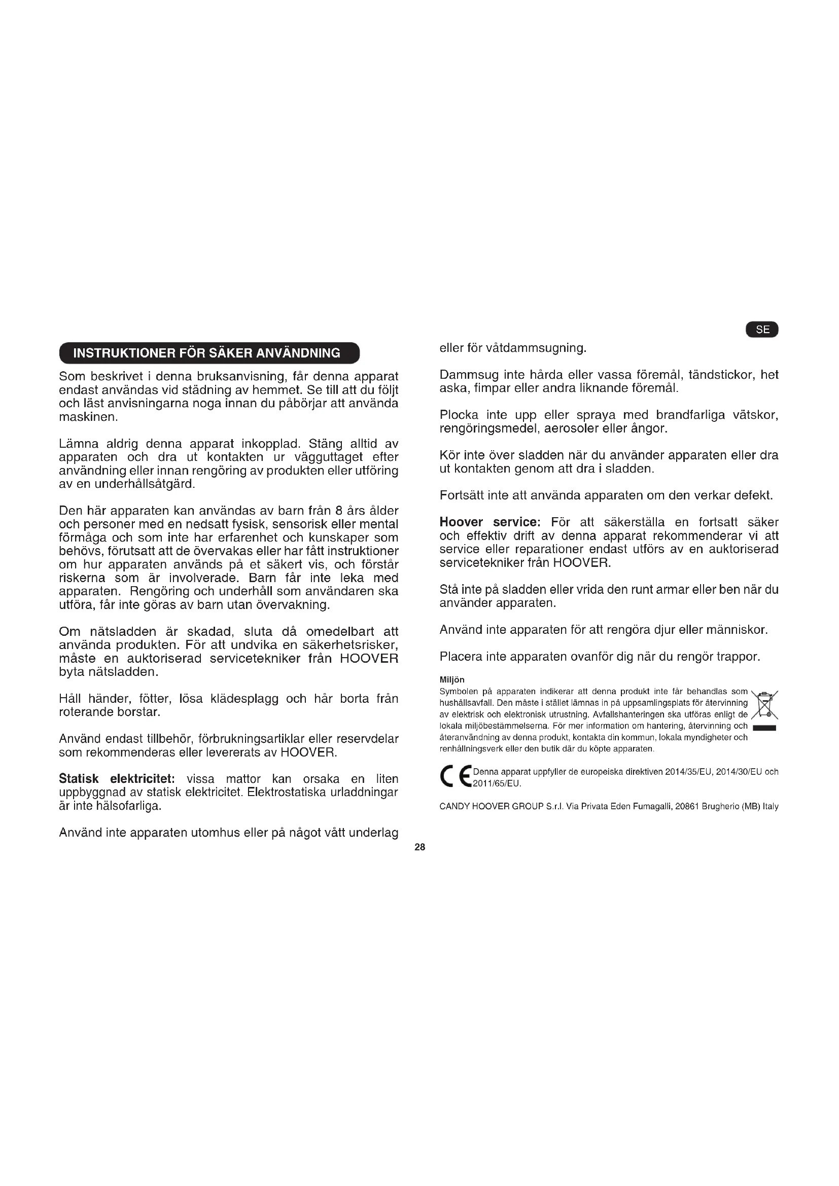 - Munnstykke for parkett* [Z] – for parkettgulv og andre ømtålige gulv. VIKTIG: Ikke bruk turbo- og miniturbomunnstykkene på tepper med lange frynser, dyreskinn eller på tepper med en tråddybde på mer enn 15 mm. Munnstykket må holdes i stadig bevegelse mens børsten roterer.28 INSTRUKTIONER FÖR SÄKER ANVÄNDNING Som beskrivet i denna bruksanvisning, får denna apparat endast användas vid städning av hemmet. Se till att du följt och läst anvisningarna noga innan du påbörjar att använda maskinen. Lämna aldrig denna apparat inkopplad. Stäng alltid av apparaten och dra ut kontakten ur vägguttaget efter användning eller innan rengöring av produkten eller utföring av en underhållsåtgärd. Den här apparaten kan användas av barn från 8 års ålder och personer med en nedsatt fysisk, sensorisk eller mental förmåga och som inte har erfarenhet och kunskaper som behövs, förutsatt att de övervakas eller har fått instruktioner om hur apparaten används på et säkert vis, och förstår riskerna som är involverade. Barn får inte leka med apparaten. Rengöring och underhåll som användaren ska utföra, får inte göras av barn utan övervakning. Om nätsladden är skadad, sluta då omedelbart att använda produkten. För att undvika en säkerhetsrisker, måste en auktoriserad servicetekniker från HOOVER byta nätsladden. Håll händer, fötter, lösa klädesplagg och hår borta från roterande borstar. Använd endast tillbehör, förbrukningsartiklar eller reservdelar som rekommenderas eller levererats av HOOVER. Statisk elektricitet: vissa mattor kan orsaka en liten uppbyggnad av statisk elektricitet. Elektrostatiska urladdningar är inte hälsofarliga. Använd inte apparaten utomhus eller på något vått underlag eller för våtdammsugning. Dammsug inte hårda eller vassa föremål, tändstickor, het aska, mpar eller andra liknande föremål. Plocka inte upp eller spraya med brandfarliga vätskor, rengöringsmedel, aerosoler eller ångor. Kör inte över sladden när du använder apparaten eller dra ut kontakten genom att dra i sladden. Fortsätt inte att använda apparaten om den verkar defekt. Hoover service: För att säkerställa en fortsatt säker och effektiv drift av denna apparat rekommenderar vi att service eller reparationer endast utförs av en auktoriserad servicetekniker från HOOVER. Stå inte på sladden eller vrida den runt armar eller ben när du använder apparaten. Använd inte apparaten för att rengöra djur eller människor. Placera inte apparaten ovanför dig när du rengör trappor. Miljön Symbolen på apparaten indikerar att denna produkt inte får behandlas som hushållsavfall. Den måste i stället lämnas in på uppsamlingsplats för återvinning av elektrisk och elektronisk utrustning. Avfallshanteringen ska utföras enligt de lokala miljöbestämmelserna. För mer information om hantering, återvinning och återanvändning av denna produkt, kontakta din kommun, lokala myndigheter och renhållningsverk eller den butik där du köpte apparaten. Denna apparat uppfyller de europeiska direktiven 2014/35/EU, 2014/30/EU och 2011/65/EU. CANDY HOOVER GROUP S.r.l. Via Privata Eden Fumagalli, 20861 Brugherio (MB) Italy SE29 *Endast vissa modeller **Munstycksdesign kan variera beroende på modell.