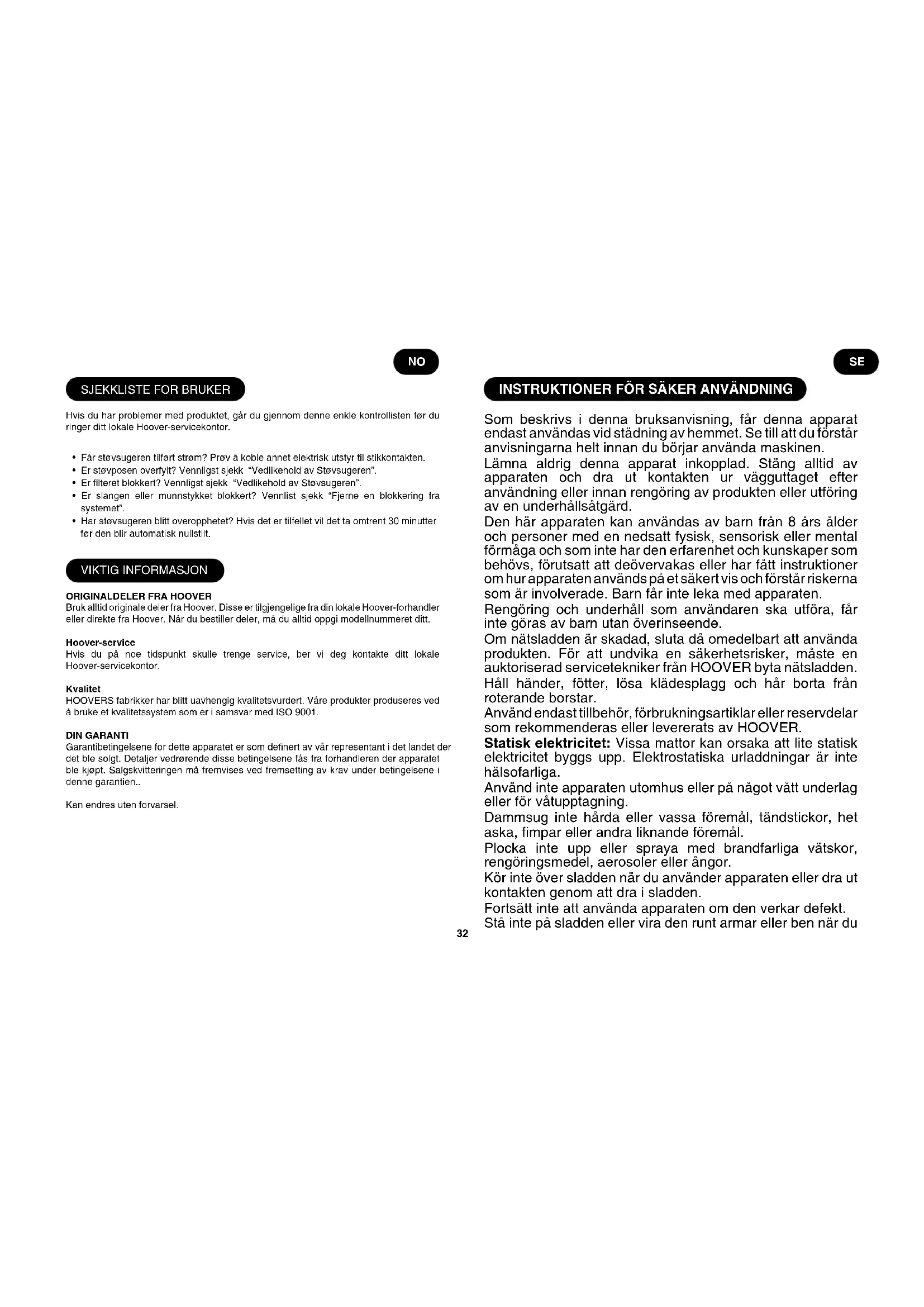 Använd alltid originaldelar från Hoover vid byte. Du kan beställa delar från närmaste Hoover-återförsäljare eller direkt från Hoover. Uppge alltid modellnummer när du beställer delar. Hoover-service Kontakta ditt närmaste Hoover-servicekontor om du behöver service. Kvalitet HOOVERS fabriker har kvalitetsbedömts av oberoende organisationer. Våra produkter tillverkas enligt ett kvalitetssystem som uppfyller kraven för ISO 9001. DIN GARANTI Garantivillkoren för produkten denieras av vår representant i det land där produkten säljs. Du kan få uppgifter om aktuella villkor från återförsäljaren. Kvittot måste visas upp när man kräver ersättning enligt garantin. Specikationerna kan ändras utan föregående meddelande.36