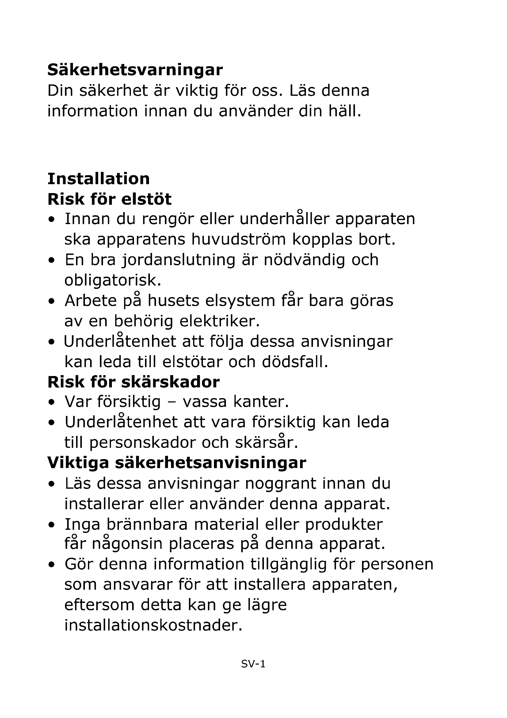 - Underlåtenhet att vara försiktig kan leda till personskador och skärsår.SV-4 Viktiga säkerhetsanvisningar