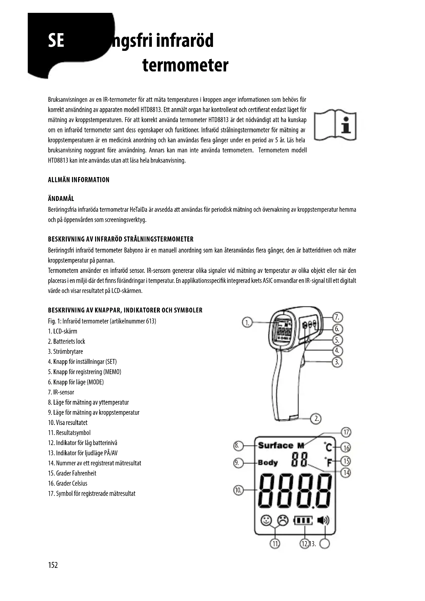 C. Соответствие изделия требованиям стандарта гарантирует Hetaida Technology Co., Ltd Adds: Room 801 ,802, 803, 804, 901, 2# Building Scientic Research Center; Songhu Intelligent Valley, No.6 Minfu Road, Liaobu Town, Dongguan City, Guangdong Province, Китай.152 Bruksanvisningen av en IR-termometer för att mäta temperaturen i kroppen anger informationen som behövs för korrekt användning av apparaten modell HTD8813. Ett anmält organ har kontrollerat och certierat endast läget för mätning av kroppstemperaturen. För att korrekt använda termometer HTD8813 är det nödvändigt att ha kunskap om en infraröd termometer samt dess egenskaper och funktioner. Infraröd strålningstermometer för mätning av kroppstemperaturen är en medicinsk anordning och kan användas era gånger under en period av 5 år. Läs hela bruksanvisning noggrant före användning. Annars kan man inte använda termometern. Termometern modell HTD8813 kan inte användas utan att läsa hela bruksanvisning.