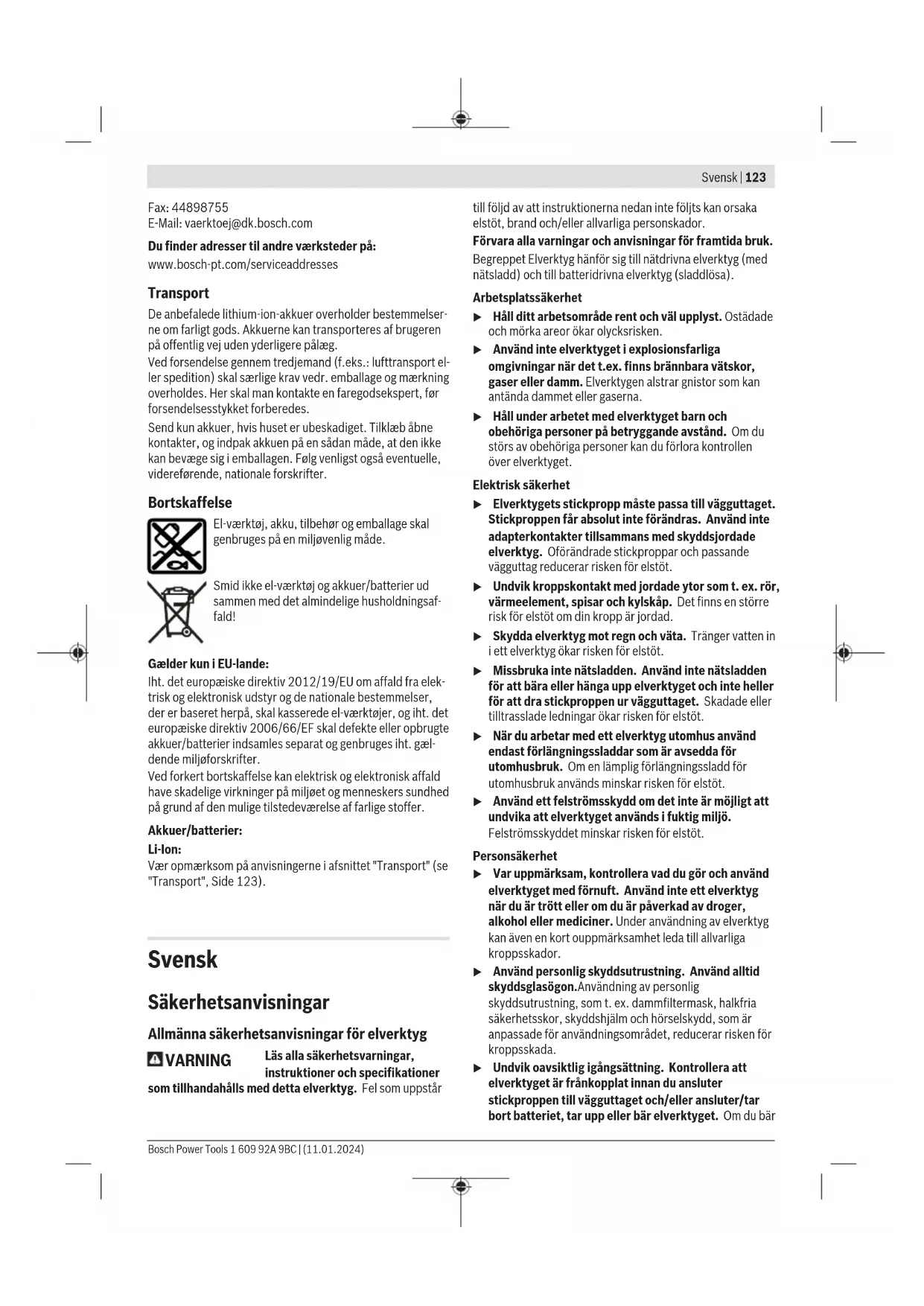 Uppmätt vid20−25°Cmed batteri ProCORE18V 8.0Ah. B) Beroende på använt batteri C) Begränsad effekt vid temperaturer <0°C Värdena kan variera beroende på produkt och är beroende av användnings- och omgivningsvillkor. Mer information finns på www.bosch-professional.com/wac. Tillåtna mått på arbetsstycket (maximal/minimal): (se „Tillåtna mått på arbetsstycket“, Sidan133) Bullerinformation Bullervärden beräknade enligt ENIEC62841-3-9. Den A-klassade bullernivån hos elverktyg ligger typiskt på: bullertrycknivå 97dB(A); bullernivå 106dB(A). Osäkerhet K=3dB. Bär hörselskydd! Mätningen av den bullernivå som anges i denna anvisning har utförts enligt en mätmetod som är standardiserad och kan användas vid jämförelse av olika elverktyg. Mätmetoden är även lämplig för preliminär bedömning av bullernivån. Den angivna bullernivån representerar den huvudsakliga användningen av elverktyget. Om däremot elverktyget används för andra ändamål, med andra insatsverktyg eller inte underhållits ordentligt kan bullernivån avvika. Härvid kan bullernivån under arbetsperioden öka betydligt. För en exakt bedömning av bullernivån bör även de tider beaktas när elverktyget är frånkopplat eller är igång, men inte används. Detta reducerar bullerbelastningen för den totala arbetsperioden betydligt. Batteri Bosch säljer batteridrivna elverktyg även utan batteri. Om det ingår ett batteri i leveransen av ditt elverktyg kan du se på förpackningen. Ladda batteriet u Använd endast de laddare som anges i tekniska data. Endast denna typ av laddare är anpassad till det litium- jonbatteri som används i elverktyget. Observera: litiumjonbatterier levereras delvis laddade enligt internationella transportföreskrifter. För full effekt ska batteriet laddas helt innan första användningen. Sätta in batteriet Skjut in det laddade batteriet i batterihållaren tills det sitter fast. Borttagning av batteri För att ta ut batteriet, tryck på upplåsningsknappen och dra ut batteriet. Bruka inte våld. Batteriet är försedd med två låssteg som hindrar ackumulatorn från att falla ut om dess upplåsningsknappfaller ut. När batteriet är insatt i elverktyget hålls det med en fjäder i rätt läge. Indikering batteristatus Observera: Inte varje batterityp har en laddningsindikation. De tre gröna LED-lamporna på indikeringen för batteristatus visar batteriets laddningsnivå. Av säkerhetsskäl kan man endast kontrollera batteristatus när elverktyget är stilla. Tryck på knappen för indikering av batteristatus eller , för att visa batteriets laddningsnivå. Detta är möjligt även då batteriet är uttaget. 1 609 92A 9BC | (11.01.2024) Bosch Power ToolsSvensk | 129 Om ingen LED-lampa lyser efter ett tryck på knappen för batteristatus är batteriet defekt och måste bytas ut. Batterityp GBA 18V... LED Kapacitet Fast ljus 3× grönt 60–100% Fast ljus 2× grönt 30–60% Fast ljus 1× grönt 5–30% Blinkande ljus 1× grönt 0–5% Batterityp ProCORE18V... LED Kapacitet Fast ljus 5× grönt 80–100% Fast ljus 4× grönt 60–80% Fast ljus 3× grönt 40–60% Fast ljus 2× grönt 20–40% Fast ljus 1× grönt 5–20% Blinkande ljus 1× grönt 0–5% Anvisningar för korrekt hantering av batterimodulen Skydda batterimodulen mot fukt och vatten. Batteriet får endast lagras inom ett temperaturområde mellan –20 °C till 50 °C. Låt därför inte batterimodulen t. ex. på sommaren ligga kvar i bilen. Rengör vid tillfälle batterimodulens ventilationsöppningar med en mjuk, ren och torr pensel. Är brukstiden efter uppladdning onormalt kort tyder det på att batterierna är förbrukade och måste bytas mot nya. Beakta anvisningarna för avfallshantering. Montage u Ta bort batteriet ur elverktyget innan åtgärder utförs på elverktyget (t.ex. underhåll, verktygsbyte) samt före transport och lagring. Om strömställaren Till/Från oavsiktligt påverkas finns risk för personskada. Leveransen omfattar Observera illustrationen av leveransomfattningen i början av bruksanvisningen. Kontrollera innan elverktyget startas för första gången att alla nedan angivna delar levererats: – Panelsåg med monterad sågklinga – Reglage(45) – Justerbar anslagsskena(26) – Skruvtving(41) – Insexnyckel/spårmejsel(43) – Dammpåse(37) – Arbetsstyckessupport(24) (2 st.) Anmärkning: Kontrollera elverktyget avseende skador. För fortsatt användning av elverktyget måste skyddsanordningarna eller lätt skadade delar noggrant undersökas så att de är felfria och att deras funktion är ändamålsenlig. Kontrollera att de rörliga delarna fungerar felfritt, inte kärvar och att de är oskadade. Alla komponenter ska vara korrekt monterade och uppfylla alla villkor för att kunna garantera en felfri drift. Skadade skyddsanordningar och delar ska repareras eller bytas ut hos en auktoriserad fackverkstad. Montering av enskilda delar – Ta försiktigt ut alla medlevererade delar ur förpackningen. – Avlägsna allt förpackningsmaterial från elverktyget och medlevererat tillbehör. – För att underlätta arbetet vid montering av medföljande delar, se till att elverktyget befinner sig i transportställning. Montera arbetsstyckessupport (se bildA1) Arbetsstyckessupporten(24) kan positioneras till vänster, höger eller framtill på elverktyget. Det flexibla insättningssystemet möjliggör en lång rad förlängnings- eller breddningsvarianter (se bildG). – Sätt in arbetsstyckessupporten(24) i hållarna(47) på elverktyget eller i hållarna(48) på den andra arbetsstyckessupporten. u Bär aldrig elverktyget i arbetsstyckessupporten. Vid transport av elverktyget använd endast transportanordningarna. Montera reglaget (se bildA2) Reglaget(45) fixerar den inställda vertikala geringsvinkeln och krävs för säker drift. – Skruva av sexkantsmuttern från gängbulten(49). – Skruva reglaget(45) medsols på gängbulten(49) och dra åt. Montera de justerbara ans