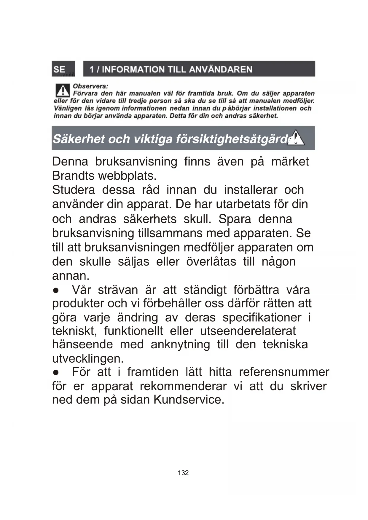 T ................................................................. 149 131Säkerhet och viktiga försiktighetsåtgärder Denna bruksanvisning finns även på märket Brandts webbplats. Studera dessa råd innan du installerar och använder din apparat. De har utarbetats för din och andras säkerhets skull. Spara denna bruksanvisning tillsammans med apparaten. Se till att bruksanvisningen medföljer apparaten om den skulle säljas eller överlåtas till någon annan. ● Vår strävan är att ständigt förbättra våra produkter och vi förbehåller oss därför rätten att göra varje ändring av deras specifikationer i tekniskt, funktionellt eller utseenderelaterat hänseende med anknytning till den tekniska utvecklingen. ● För att i framtiden lätt hitta referensnummer för er apparat rekommenderar vi att du skriver ned dem på sidan Kundservice. 132Viktiga föreskrifter ● Denna apparat har konstruerats för att användas av privatpersoner på deras bostadsort.Använd den inte i kommersiellt eller industriellt syfte eller för annat ändamål än för det den har konstruerats. ● Packa upp eller låt packa upp apparaten omedelbart vid mottagandet. Kontrollera dess allmänna skick. Notera eventuella förbehåll skriftligen på leveransnotan och spara ett exemplar av denna. ● Denna apparat kan användas av barn som är minst åtta år gamla och av personer med nedsatt fysisk, sensorisk eller mental förmåga eller person som saknar erfarenhet eller kunskaper, då sådan person står under vederbörlig tillsyn eller har erhållit anvisningar om hur apparaten används på ett säkert sätt och om de risker som föreligger har uppfattats. Barn får inte leka med apparaten. Rengöring och underhåll av användare får inte utföras av barn utan tillsyn. ● Observera: De delar som är åtkomliga på denna apparat kan bli varma när den används med apparater avsedda för matlagning. 133Elrisker ● Samtliga strömförsörjningskretsar måste f r å n k o p p l a s i n n a n m a n n ä r m a r s i g anslutningsplintarna. För att undvika fara måste nätsladden, om den är skadad, bytas av tillverkaren, dennes servicepersonal eller någon med motsvarande behörighet. ● Frånkoppling kan uppnås genom att se till att nätkontakten är åtkomlig eller genom att integrera en brytare i de fasta ledningarna enligt installationsbestämmelserna. ● Ändra inte eller försök ändra denna apparats egenskaper. Det skulle medföra fara för dig. ● Reparation ska endast utföras av auktoriserad specialist. ● Koppla alltid från fläkten före rengöring och service. ● Använd aldrig apparat som använder ånga eller högtryck för att rengöra apparaten (krav som rör elsäkerheten). ● Frånkoppling kan uppnås genom att se till att nätkontakten är åtkomlig eller genom att integrera en brytare i de fasta ledningarna enligt installationsbestämmelserna. ● Ändra inte eller försök ändra denna apparats egenskaper. Det skulle medföra fara för dig. 134● Reparation ska endast utföras av auktoriserad specialist. ● Koppla alltid från fläkten före rengöring och service. ● Använd aldrig apparat som använder ånga eller högtryck för att rengöra apparaten (krav som rör elsäkerheten). Kvävningsrisk ● Bestämmelser rörande uttag av frånluft måste respekteras. Luften får inte föras ut i ledning som används för utluftning av ångor från apparater som använder gas eller annat bränsle (gäller inte för apparater som endast för ut luft i rummet). ● Vederbörlig luftväxling i rummet måste säkerställas då köksfläkten används samtidigt med apparater som använder gas eller annat bränsle (gäller inte för apparater som endast för ut luft i rummet). Brandrisk ● Det är förbjudet att flambera mat eller att använda gasbrännare utan kokkärl under fläkten (lågor som sugs in skulle riskera att skada apparaten). 135● Fritering under apparaten måste göras under ständig tillsyn. Olja och fett som blir mycket varma kan antändas. ● Respektera intervall för rengöring och filterbyte. Ansamling av fett riskerar att orsaka eldsvåda. ● Användning över en eldhärd (ved, kol m.m.) är inte tillåten. ● Om köksfläkten placeras över en apparat som fungerar med gas ska avståndet mellan hällens övre del och fläktens undre del vara minst 70 cm. Om anvisningarna till den häll som finns installerad under fläkten anger ett längre avstånd än 70 cm ska detta beaktas.