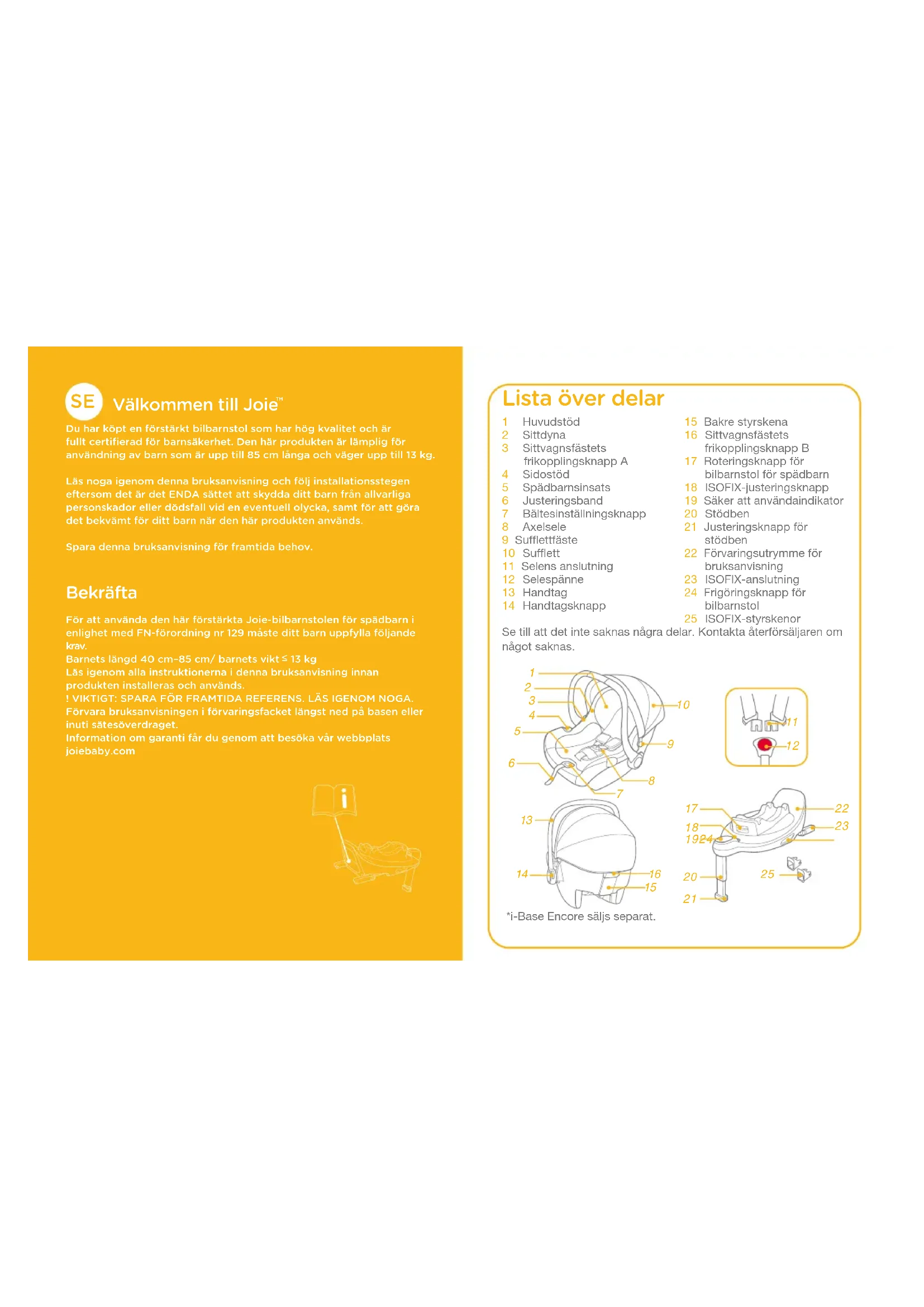 Du har köpt en förstärkt bilbarnstol som har hög kvalitet och är fullt certifierad för barnsäkerhet. Den här produkten är lämplig för användning av barn som är upp till 85cm långa och väger upp till 13kg.Läs noga igenom denna bruksanvisning och följ installationsstegen eftersom det är det ENDA sättet att skydda ditt barn från allvarliga personskador eller dödsfall vid en eventuell olycka﹐ samt för att göra det bekvämt för ditt barn när den här produkten används.Spara denna bruksanvisning för framtida behov. Bekräfta För att använda den här förstärkta Joie-bilbarnstolen för spädbarn i enlighet med FN-förordning nr 129 måste ditt barn uppfylla följande krav.Barnets längd 40 cm–85 cm/ barnets vikt 13 kgLäs igenom alla instruktionerna i denna bruksanvisning innan produkten installeras och används.! VIKTIGT: SPARA FÖR FRAMTIDA REFERENS. LÄS IGENOM NOGA.Förvara bruksanvisningen i förvaringsfacket längst ned på basen eller inuti sätesöverdraget.Information om garanti får du genom att besöka vår webbplats joiebaby.com *i-Base Encore säljs separat.