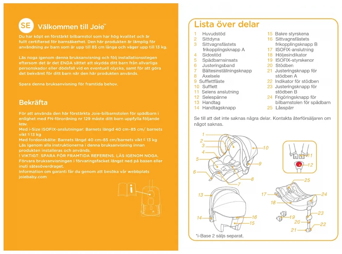 Du har köpt en förstärkt bilbarnstol som har hög kvalitet och är fullt certifierad för barnsäkerhet. Den här produkten är lämplig för användning av barn som är upp till 85cm långa och väger upp till 13kg.Läs noga igenom denna bruksanvisning och följ installationsstegen eftersom det är det ENDA sättet att skydda ditt barn från allvarliga personskador eller dödsfall vid en eventuell olycka﹐ samt för att göra det bekvämt för ditt barn när den här produkten används.Spara denna bruksanvisning för framtida behov. Bekräfta För att använda den här förstärkta Joie-bilbarnstolen för spädbarn i enlighet med FN-förordning nr 129 måste ditt barn uppfylla följande krav.Med i-Size ISOFIX-anslutningar: Barnets längd 40 cm–85 cm/ barnets vikt 13 kgMed fordonsbälte: Barnets längd 40 cm–85 cm/barnets vikt 13 kgLäs igenom alla instruktionerna i denna bruksanvisning innan produkten installeras och används.! VIKTIGT: SPARA FÖR FRAMTIDA REFERENS. LÄS IGENOM NOGA.Förvara bruksanvisningen i förvaringsfacket längst ned på basen eller inuti sätesöverdraget.Information om garanti får du genom att besöka vår webbplats joiebaby.com *i-Base 2 säljs separat.