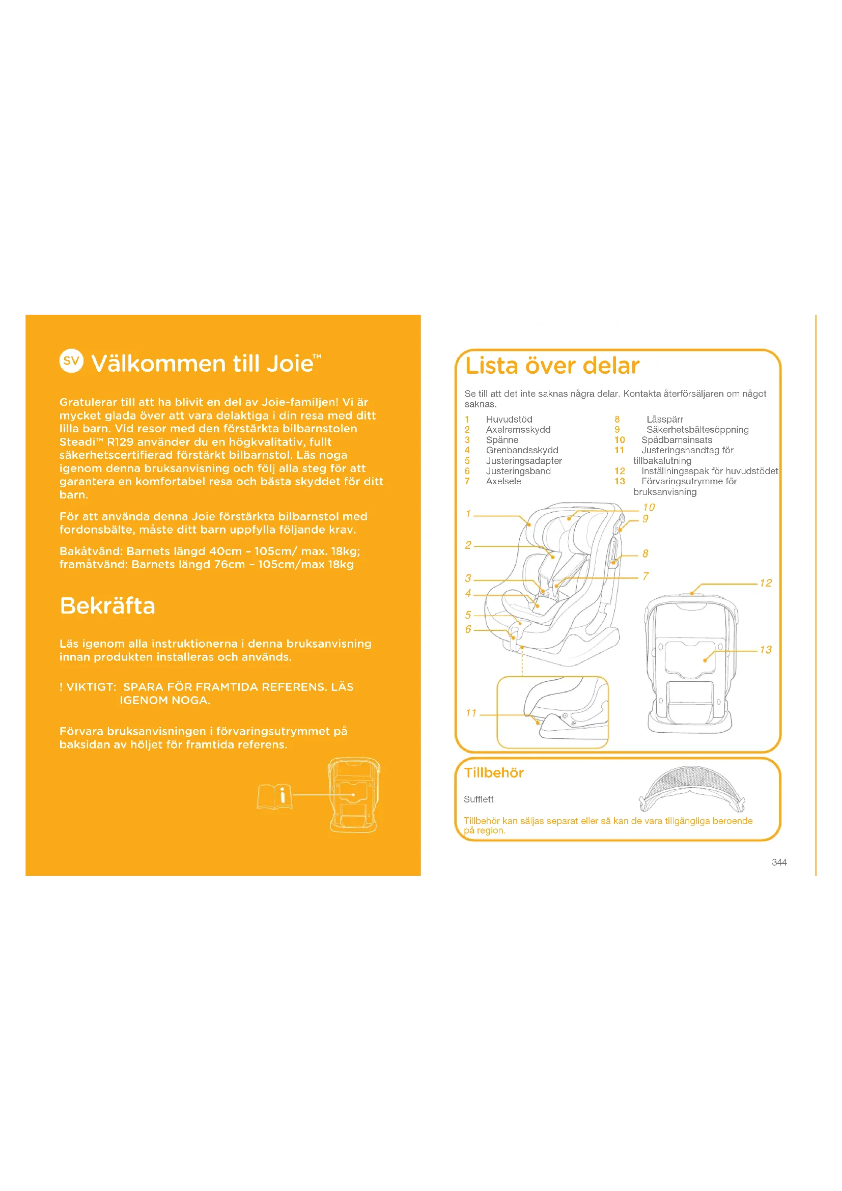 Gratulerar till att ha blivit en del av Joie-familjen! Vi är mycket glada över att vara delaktiga i din resa med ditt lilla barn. Vid resor med den förstärkta bilbarnstolen Steadi™ R129 använder du en högkvalitativ, fullt säkerhetscertifierad förstärkt bilbarnstol. Läs noga igenom denna bruksanvisning och följ alla steg för att garantera en komfortabel resa och bästa skyddet för ditt barn.För att använda denna Joie förstärkta bilbarnstol med fordonsbälte, måste ditt barn uppfylla följande krav.Bakåtvänd: Barnets längd 40cm – 105cm/ max. 18kg; framåtvänd: Barnets längd 76cm – 105cm/max 18kg Bekräfta Läs igenom alla instruktionerna i denna bruksanvisning innan produkten installeras och används.! VIKTIGT: SPARA FÖR FRAMTIDA REFERENS. LÄS IGENOM NOGA.Förvara bruksanvisningen i förvaringsutrymmet på baksidan av höljet för framtida referens.
