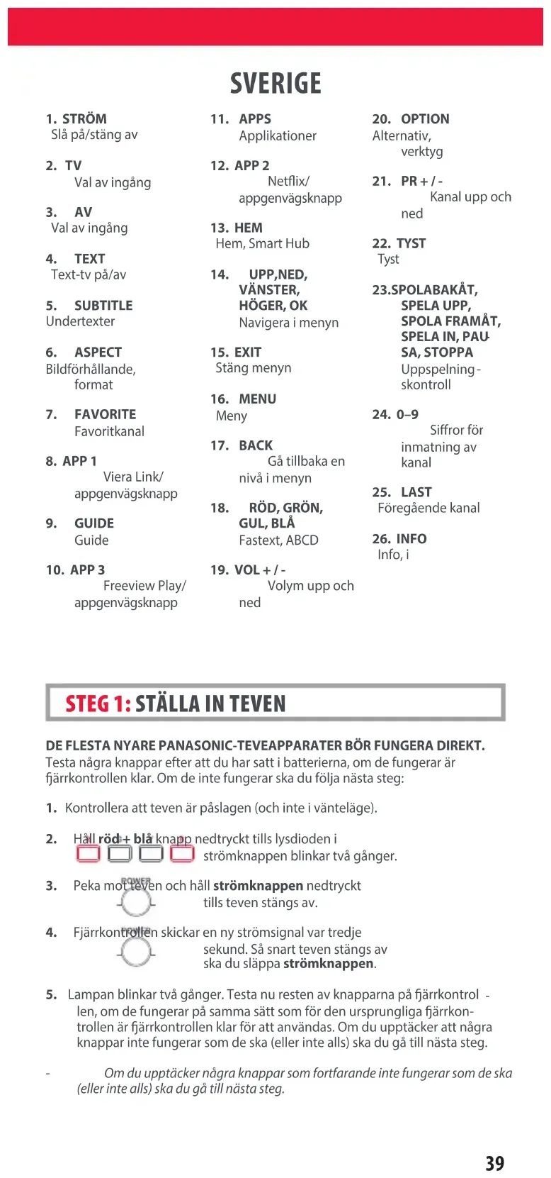 NORSK 712188_Panasonic_manual URC4914_RDN1091120.indd 38712188_Panasonic_manual URC4914_RDN1091120.indd 38 09-11-2020 13:1509-11-2020 13:1539 SVERIGE DE FLESTA NYARE PANASONIC-TEVEAPPARATER BÖR FUNGERA DIREKT. Testa några knappar efter att du har satt i batterierna, om de fungerar är ärrkontrollen klar. Om de inte fungerar ska du följa nästa steg: