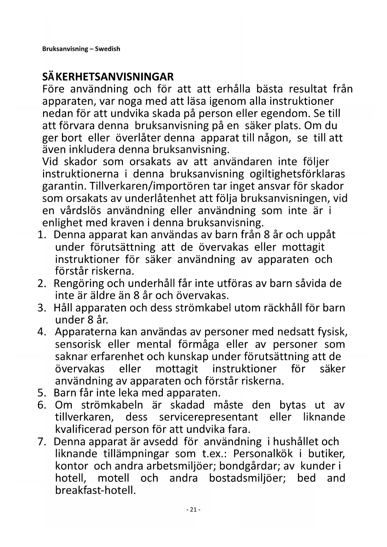 Recyclage – Directive européenne 2012/19/EU Ce symbole indique que le produit ne doit pas être jeté avec les ordures ménagères. Pour limiter les risques pour l’environnement et la santé entraînés par le rejet non contrôlé des déchets, recyclez ce dernier pour promouvoir une réutilisation responsable de ses matériaux. Pour recycler votre produit, utilisez les réseaux de collecte de votre région ou prenez contact avec le revendeur du produit. Ce dernier pourra vous aider à le recycler. Emerio B.V. Customer service: Kundeninformation: Klantenservice: Oudeweg 115 T: +31 (0) 23 3034369 T: +49 (0) 3222 1097 600 T: +31 (0) 23 3034369 2031 CC Haarlem www.emerio.eu/service www.emerio.eu/service www.emerio.eu/service The Netherlands Looking for spare parts? Have a look at www.spareparts.emerio.eu Sie brauchen Ersatzteile? Besuchen Sie www.ersatzteile.emerio.eu Onderdelen nodig? Kijk op www.onderdelen.emerio.eu- 21 - Bruksanvisning – Swedish SÄKERHETSANVISNINGAR Före användning och för att att erhålla bästa resultat från apparaten, var noga med att läsa igenom alla instruktioner nedan för att undvika skada på person eller egendom. Se till att förvara denna bruksanvisning på en säker plats. Om du ger bort eller överlåter denna apparat till någon, se till att även inkludera denna bruksanvisning. Vid skador som orsakats av att användaren inte följer instruktionerna i denna bruksanvisning ogiltighetsförklaras garantin. Tillverkaren/importören tar inget ansvar för skador som orsakats av underlåtenhet att följa bruksanvisningen, vid en vårdslös användning eller användning som inte är i enlighet med kraven i denna bruksanvisning.