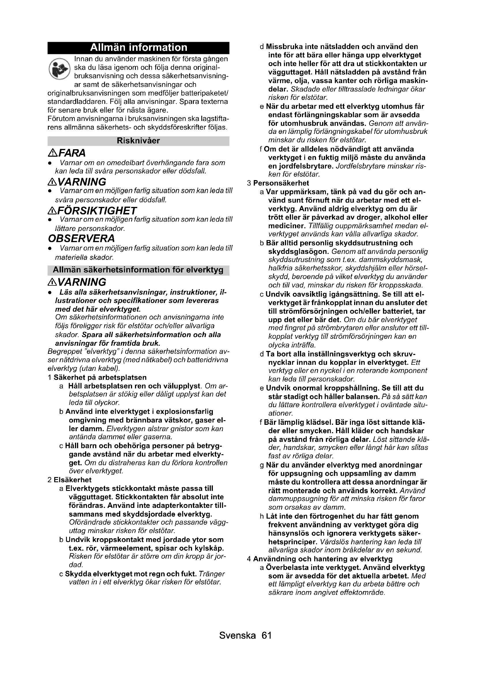 • EU-försäkran om överensstämmelse Svenska 61 Allmän information Innan du använder maskinen för första gången ska du läsa igenom och följa denna original- bruksanvisning och dessa säkerhetsanvisning- ar samt de säkerhetsanvisningar och originalbruksanvisningen som medföljer batteripaketet/ standardladdaren. Följ alla anvisningar. Spara texterna för senare bruk eller för nästa ägare. Förutom anvisningarna i bruksanvisningen ska lagstifta- rens allmänna säkerhets- och skyddsföreskrifter följas. Risknivåer FARA ● Varnar om en omedelbart överhängande fara som kan leda till svåra personskador eller dödsfall. 몇 VARNING ● Varnar om en möjligen farlig situation som kan leda till svåra personskador eller dödsfall. 몇 FÖRSIKTIGHET ● Varnar om en möjligen farlig situation som kan leda till lättare personskador. OBSERVERA ● Varnar om en möjligen farlig situation som kan leda till materiella skador. Allmän säkerhetsinformation för elverktyg 몇 VARNING ● Läs alla säkerhetsanvisningar, instruktioner, il- lustrationer och specifikationer som levereras med det här elverktyget. Om säkerhetsinformationen och anvisningarna inte följs föreligger risk för elstötar och/eller allvarliga skador. Spara all säkerhetsinformation och alla anvisningar för framtida bruk. Begreppet ”elverktyg” i denna säkerhetsinformation av- ser nätdrivna elverktyg (med nätkabel) och batteridrivna elverktyg (utan kabel). 1 Säkerhet på arbetsplatsen a Håll arbetsplatsen ren och välupplyst. Om ar- betsplatsen är stökig eller dåligt upplyst kan det leda till olyckor. b Använd inte elverktyget i explosionsfarlig omgivning med brännbara vätskor, gaser el- ler damm. Elverktygen alstrar gnistor som kan antända dammet eller gaserna. c Håll barn och obehöriga personer på betryg- gande avstånd när du arbetar med elverkty- get. Om du distraheras kan du förlora kontrollen över elverktyget. 2 Elsäkerhet a Elverktygets stickkontakt måste passa till vägguttaget. Stickkontakten får absolut inte förändras. Använd inte adapterkontakter till- sammans med skyddsjordade elverktyg. Oförändrade stickkontakter och passande vägg- uttag minskar risken för elstötar. b Undvik kroppskontakt med jordade ytor som t.ex. rör, värmeelement, spisar och kylskåp. Risken för elstötar är större om din kropp är jor- dad. c Skydda elverktyget mot regn och fukt. Tränger vatten in i ett elverktyg ökar risken för elstötar. d Missbruka inte nätsladden och använd den inte för att bära eller hänga upp elverktyget och inte heller för att dra ut stickkontakten ur vägguttaget. Håll nätsladden på avstånd från värme, olja, vassa kanter och rörliga maskin- delar. Skadade eller tilltrasslade ledningar ökar risken för elstötar. e När du arbetar med ett elverktyg utomhus får endast förlängningskablar som är avsedda för utomhusbruk användas. Genom att använ- da en lämplig förlängningskabel för utomhusbruk minskar du risken för elstötar. f Om det är alldeles nödvändigt att använda verktyget i en fuktig miljö måste du använda en jordfelsbrytare. Jordfelsbrytare minskar ris- ken för elstötar. 3 Personsäkerhet a Var uppmärksam, tänk på vad du gör och an- vänd sunt förnuft när du arbetar med ett el- verktyg. Använd aldrig elverktyg om du är trött eller är påverkad av droger, alkohol eller mediciner. Tillfällig ouppmärksamhet medan el- verktyget används kan vålla allvarliga skador. b Bär alltid personlig skyddsutrustning och skyddsglasögon. Genom att använda personlig skyddsutrustning som t.ex. dammskyddsmask, halkfria säkerhetsskor, skyddshjälm eller hörsel- skydd, beroende på vilket elverktyg du använder och till vad, minskar du risken för kroppsskada. c Undvik oavsiktlig igångsättning. Se till att el- verktyget är frånkopplat innan du ansluter det till strömförsörjningen och/eller batteriet, tar upp det eller bär det. Om du bär elverktyget med fingret på strömbrytaren eller ansluter ett till- kopplat verktyg till strömförsörjningen kan en olycka inträffa. d Ta bort alla inställningsverktyg och skruv- nycklar innan du kopplar in elverktyget. Ett verktyg eller en nyckel i en roterande komponent kan leda till personskador. e Undvik onormal kroppshållning. Se till att du står stadigt och håller balansen. På så sätt kan du lättare kontrollera elverktyget i oväntade situ- ationer. f Bär lämplig klädsel. Bär inga löst sittande klä- der eller smycken. Håll kläder och handskar på avstånd från rörliga delar. Löst sittande klä- der, handskar, smycken eller långt hår kan slitas fast av rörliga delar. g När du använder elverktyg med anordningar för uppsugning och uppsamling av damm måste du kontrollera att dessa anordningar är rätt monterade och används korrekt. Använd dammuppsugning för att minska risken för faror som orsakas av damm. h Låt inte den förtrogenhet du har fått genom frekvent användning av verktyget göra dig hänsynslös och ignorera verktygets säker- hetsprinciper. Vårdslös hantering kan leda till allvarliga skador inom bråkdelar av en sekund. 4 Användning och hantering av elverktyg a Överbelasta inte verktyget. Använd elverktyg som är avsedda för det aktuella arbetet. Med ett lämpligt elverktyg kan du arbeta bättre och säkrare inom angivet effektområde.62 Svenska b Använd aldrig elverktyget om strömbrytaren är defekt. Ett elverktyg som inte kan kopplas in eller ur är farligt och måste repareras. c Dra ut stickkontakten ur uttaget och/eller ta ut batteriet innan du gör inställningar på verkty- get, byter tillbehör eller lägger ifrån dig verk- tyget. Denna skyddsåtgärd förhindrar att du eller någon annan råkar sätta igång elverktyget av misstag. d Förvara elverktyget oåtkomligt för barn. Verk- tyget får inte användas av personer som sak- nar vana eller som inte har läst dessa anvisningar. Elverktyget är farligt om det an- v