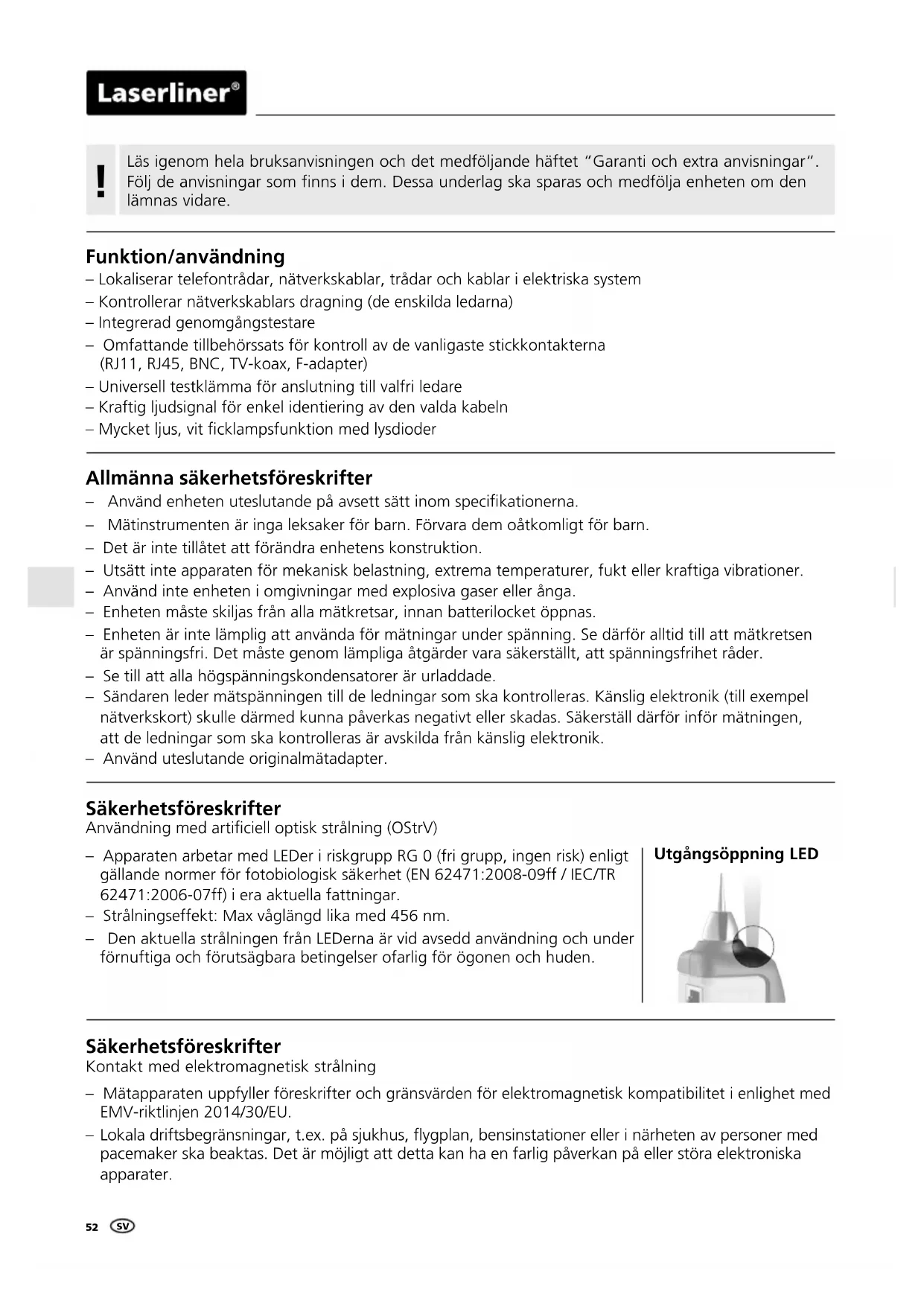 Funktion/användning – Lokaliserar telefontrådar, nätverkskablar, trådar och kablar i elektriska system – Kontrollerar nätverkskablars dragning (de enskilda ledarna) – Integrerad genomgångstestare – Omfattande tillbehörssats för kontroll av de vanligaste stickkontakterna (RJ11, RJ45, BNC, TV-koax, F-adapter) – Universell testklämma för anslutning till valfri ledare – Kraftig ljudsignal för enkel identiering av den valda kabeln – Mycket ljus, vit cklampsfunktion med lysdioder Allmänna säkerhetsföreskrifter – Använd enheten uteslutande på avsett sätt inom specikationerna. – Mätinstrumenten är inga leksaker för barn. Förvara dem oåtkomligt för barn. – Det är inte tillåtet att förändra enhetens konstruktion. – Utsätt inte apparaten för mekanisk belastning, extrema temperaturer, fukt eller kraftiga vibrationer. – Använd inte enheten i omgivningar med explosiva gaser eller ånga. – Enheten måste skiljas från alla mätkretsar, innan batterilocket öppnas. – Enheten är inte lämplig att använda för mätningar under spänning. Se därför alltid till att mätkretsen är spänningsfri. Det måste genom lämpliga åtgärder vara säkerställt, att spänningsfrihet råder. – Se till att alla högspänningskondensatorer är urladdade. – Sändaren leder mätspänningen till de ledningar som ska kontrolleras. Känslig elektronik (till exempel nätverkskort) skulle därmed kunna påverkas negativt eller skadas. Säkerställ därför inför mätningen, att de ledningar som ska kontrolleras är avskilda från känslig elektronik. – Använd uteslutande originalmätadapter. Säkerhetsföreskrifter Användning med articiell optisk strålning (OStrV) Säkerhetsföreskrifter Kontakt med elektromagnetisk strålning – Apparaten arbetar med LEDer i riskgrupp RG 0 (fri grupp, ingen risk) enligt gällande normer för fotobiologisk säkerhet (EN 62471:2008-09ff / IEC/TR 62471:2006-07ff) i era aktuella fattningar. – Strålningseffekt: Max våglängd lika med 456 nm. – Den aktuella strålningen från LEDerna är vid avsedd användning och under förnuftiga och förutsägbara betingelser ofarlig för ögonen och huden. – Mätapparaten uppfyller föreskrifter och gränsvärden för elektromagnetisk kompatibilitet i enlighet med EMV-riktlinjen 2014/30/EU.