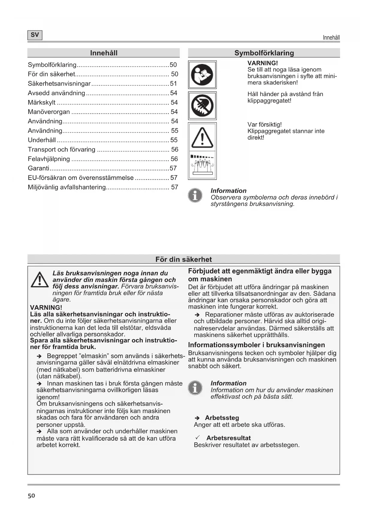 - Miljövänlig avfallshantering Symbolförklaring VARNING! Se till att noga läsa igenom bruksanvisningen i syfte att mini- mera skaderisken! Håll händer på avstånd från klippaggregatet! Var försiktig! Klippaggregatet stannar inte direkt! Information Observera symbolerna och deras innebörd i styrstångens bruksanvisning. För din säkerhet Läs bruksanvisningen noga innan du använder din maskin första gången och följ dess anvisningar. Förvara bruksanvis- ningen för framtida bruk eller för nästa ägare. VARNING! Läs alla säkerhetsanvisningar och instruktio- ner. Om du inte följer säkerhetsanvisningarna eller instruktionerna kan det leda till elstötar, eldsvåda och/eller allvarliga personskador. Spara alla säkerhetsanvisningar och instruktio- ner för framtida bruk. Î Begreppet ”elmaskin” som används i säkerhets- anvisningarna gäller såväl elnätdrivna elmaskiner (med nätkabel) som batteridrivna elmaskiner (utan nätkabel). Î Innan maskinen tas i bruk första gången måste säkerhetsanvisningarna ovillkorligen läsas igenom! Om bruksanvisningens och säkerhetsanvis- ningarnas instruktioner inte följs kan maskinen skadas och fara för användaren och andra personer uppstå. Î Alla som använder och underhåller maskinen måste vara rätt kvalicerade så att de kan utföra arbetet korrekt. Förbjudet att egenmäktigt ändra eller bygga om maskinen Det är förbjudet att utföra ändringar på maskinen eller att tillverka tillsatsanordningar av den. Sådana ändringar kan orsaka personskador och göra att maskinen inte fungerar korrekt. Î Reparationer måste utföras av auktoriserade och utbildade personer. Härvid ska alltid origi- nalreservdelar användas. Därmed säkerställs att maskinens säkerhet upprätthålls. Informationssymboler i bruksanvisningen Bruksanvisningens tecken och symboler hjälper dig att kunna använda bruksanvisningen och maskinen snabbt och säkert. Information Information om hur du använder maskinen effektivast och på bästa sätt. Î Arbetssteg Anger att ett arbete ska utföras. 3 Arbetsresultat Beskriver resultatet av arbetsstegen.För din säkerhet p. 57