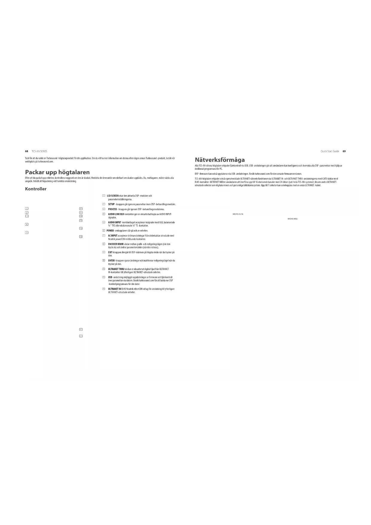 BEFORE AFTER Fig. 1 Fig. 4 Fig. 5 Fig. 6 Fig. 2 Fig. 368 TCS-AN SERIES Quick Start Guide 69 Tack för att du valde en Turbosound -högtalarprodukt för din applikation. Om du vill ha mer information om denna eller någon annan Turbosound -produkt, besök vår webbplats på turbosound.com. Packar upp högtalaren Efter att du packat upp enheten, kontrollera noggrant om den är skadad. Meddela din leverantör omedelbart om skadan upptäcks. Du, mottagaren, måste väcka alla anspråk. Behåll all förpackning vid framtida omskickning. Kontroller (1) LCD SCREEN visar den aktuella DSP -modulen och parameterinställningarna. (2) SETUP - knappen går igenom parametrar inom DSP -behandlingsmoduler. (3) PROCESS - knappen går igenom DSP -behandlingsmodulerna. (4) AUDIO LINK XLR-kontakten ger en obearbetad kopia av AUDIO INPUT- signalen. (5) AUDIO INPUT -kombiuttaget accepterar insignaler med XLR, balanserade ¼ " TRS eller obalanserade ¼" TS -kontakter. (6) POWER -omkopplaren slår på och av enheten. (7) AC INPUT accepterar strömanslutningar från strömkablar utrustade med Neutrik powerCON vridlåsande kontakter. (8) ENCODER KNOB växlar mellan grak- och redigeringslägen (när den trycks in) och ändrar parametervärden (när den roteras). (9) EXIT-knappen återgår till DSP-skärmen på högsta nivån när du trycker på den. (10) ENTER -knappen sparar ändringar och inaktiverar redigeringsläget när du trycker på den. (11) ULTRANET THRU skickar ut obearbetat digitalt ljud från ULTRANET IN-kontakten till ytterligare ULTRANET-utrustade enheter. (12) USB -anslutning möjliggör uppdateringar av rmware och ärrkontroll över parametrar via datorn. Besök turbosound.com för att ladda ner DSP -kontrollprogramvara för din dator. (13) ULTRANET IN RJ45/Neutrik etherCON-uttag för anslutning till ytterligare ULTRANET-utrustade enheter. (6) (7) (9) (10) (11) (13) (8) (1) (2) (3) (4) (5) (12) Nätverksförmåga Alla TCS-AN-drivna högtalare erbjuder ärrkontroll via USB. USB -anslutningen gör att användaren kan kongurera och övervaka alla DSP -parametrar med hjälp av dedikerad programvara för PC. DSP -rmware kan också uppdateras via USB -anslutningen. Besök turbosound.com för den senaste rmwareversionen. TCS-AN-högtalare erbjuder också egenutvecklade ULTRANET-nätverksfunktioner via ULTRANET IN- och ULTRANET THRU-anslutningarna med CAT5-kablar med RJ45-kontakter. ULTRANET tillåter användaren att överföra upp till 16 oberoende kanaler med 24-bitars ljud i hela TCS-AN-systemet, liksom andra ULTRANET- utrustade enheter som digitala mixers och personliga bildskärmssystem. Upp till 7 enheter kan seriekopplas med en enda ULTRANET -kabel. MIDAS M32MIDAS DL1670 TCS-AN SERIES Quick Start Guide 71 TCS-AN DSP-menystruktur Komplett utbud Subwoofer Fungera BEARBETA EQ Ingen Ingen Ställer in frekvenssvaret till standardinställningen. Array2 – Ställer in ett korrigerat frekvenssvar för 2 skåp som är sammanfogade. Array3 – Ställer in ett korrigerat frekvenssvar för tre eller era skåp som är hopfogade. Användare Användare Låter dig deniera din egen frekvensresponsinställning genom att gå in i motsvarande undermeny. Undermeny Låg/ hög hylla Låg/ hög hylla Låter dig deniera ett lågt och högt hylllter. Parametriska 1 och 2 Parametriska 1 och 2 Låter dig deniera en parametrisk EQ-typ (Frequency, Qual. And Gain). XOVER Ingen – Enheten är inställd för standardåtergivning i full- range. HP 100 Hz LP 100 Hz Förinställd med 100 Hz, 24 dB/oktavlter för delning mellan subwoofer och fullrangehögtalare. HP 120 Hz LP 120 Hz Förinställd med 120 Hz, 24 dB/oktavlter för delning mellan subwoofer och fullrangehögtalare. Användare Användare Undermeny för delning av användare för kombination med andra full-range eller subwoofer- högtalarsystem Sub Menu Frekvens Frekvens Välj önskad delningsfrekvens: