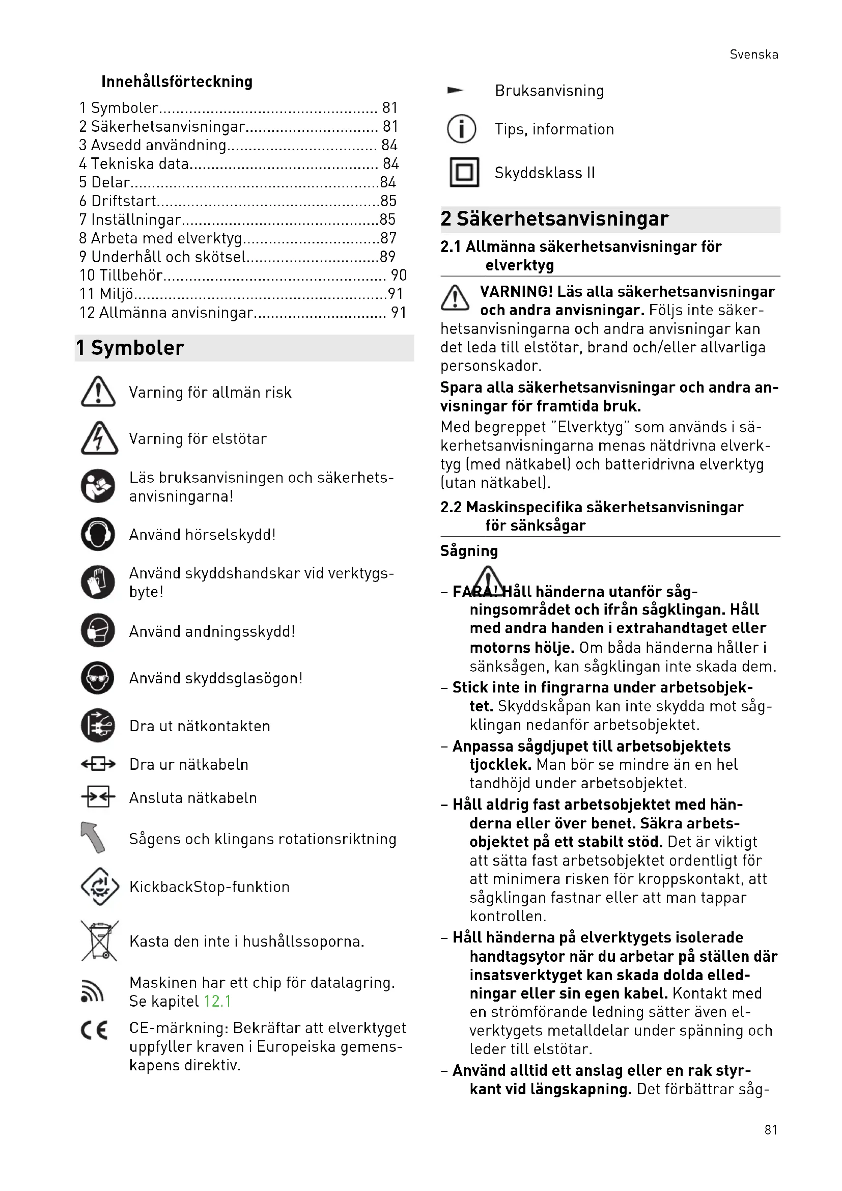 för sänksågar Sågning – FARA! Håll händerna utanför såg ningsområdet och ifrån sågklingan. Håll med andra handen i extrahandtaget eller motorns hölje. Om båda händerna håller i sänksågen, kan sågklingan inte skada dem. – Stick inte in fingrarna under arbetsobjek tet. Skyddskåpan kan inte skydda mot såg klingan nedanför arbetsobjektet. – Anpassa sågdjupet till arbetsobjektets tjocklek. Man bör se mindre än en hel tandhöjd under arbetsobjektet. – Håll aldrig fast arbetsobjektet med hän derna eller över benet. Säkra arbets objektet på ett stabilt stöd. Det är viktigt att sätta fast arbetsobjektet ordentligt för att minimera risken för kroppskontakt, att sågklingan fastnar eller att man tappar kontrollen. – Håll händerna på elverktygets isolerade handtagsytor när du arbetar på ställen där insatsverktyget kan skada dolda elled ningar eller sin egen kabel. Kontakt med en strömförande ledning sätter även el verktygets metalldelar under spänning och leder till elstötar. – Använd alltid ett anslag eller en rak styr kant vid längskapning. Det förbättrar såg Svenska 81precisionen och minskar risken för att såg klingan fastnar. – Använd alltid sågklingor i rätt storlek och med passande fästhål (t.ex. rombformat eller runt). Sågklingor som inte passar till sågens monteringsdelar går ojämnt och gör så att man förlorar kontrollen över ar betet. – Använd aldrig skadade eller felaktiga spännflänsar eller -skruvar till sågkling orna. Sågklingans spännflänsar och -skru var har specialkonstruerats för sågen för optimal effekt och driftssäkerhet. Rekyl – orsaker och säkerhetsanvisningar – En rekyl är den plötsliga reaktion som upp står när en sågklinga hakar i, kläms fast eller är felinställd så att sågen hoppar ur arbetsobjektet okontrollerat och slår upp mot användaren. – Om sågklingan fastnar i snittet blockeras den, och sågen slår tillbaka mot använda ren av motorkraften. – Om sågklingan förvrids eller justeras fel i snittet kan tänderna i bakre området av klingan haka fast i arbetsobjektets yta, vil ket gör att klingan hoppar ur och slår upp mot användaren. En rekyl beror alltså på att sågen har använts eller hanterats felaktigt. Rekyler kan förhindras genom att lämpliga försiktighetsåtgärder vidtas enligt beskrivningen nedan. – Håll fast sågen med båda händerna och håll armarna i en ställning som kan ta upp rekylens kraft. Stå alltid vid sidan av såg klingan, aldrig direkt framför den. Vid en rekyl kan sågen slå bakåt, men användaren kan parera rekylens kraft genom lämpliga åtgärder. – Om sågklingan fastnar eller när arbetet avbryts, släpp strömbrytaren och håll kvar sågen i materialet tills den har stan nat helt. Försök aldrig att ta bort sågen från arbetsobjektet eller dra den bakåt medan den fortfarande roterar – det kan leda till en rekyl. Ta reda på varför såg klingan fastnat och åtgärda problemet. – För att återstarta en såg som sitter fast i arbetsobjektet, centrera klingan i snittet och kontrollera att sågtänderna inte har hakat fast i arbetsobjektet. Om klingan har fastnat kan den hoppa ur arbetsobjektet el ler orsaka en rekyl när sågen startas igen. – Stötta stora skivor för att minska risken för rekyl om sågklingan fastnar. Stora ski vor kan böja sig av sin egen vikt. Skivorna måste stöttas på båda sidor, både vid sågs nittet och utmed kanten. – Använd inte slöa eller skadade sågklingor. Klingor med slöa eller felriktade tänder i ett för smalt snitt ökar risken för friktion, att klingan fastnar och att en rekyl uppstår. – Dra åt inställningarna för sågdjup och - vinkel före sågningen. Om inställningarna ändras under arbetet kan sågklingan fast na och orsaka en rekyl. – Var extra försiktig vid sågning i befintliga väggar eller andra områden med dold sikt. Klingan kan fastna i dolda objekt och orsaka en rekyl. Skyddskåpans funktion – Kontrollera att skyddskåpan stängs utan problem före all användning. Använd inte sågen om skyddskåpan inte kan röra sig fritt och stängas direkt. Bind eller kläm aldrig fast skyddskåpan eftersom det läm nar sågklingan oskyddad. Om sågen faller ner på golvet kan skyddskåpan bli böjd. Kontrollera att skyddskåpan kan röra sig fritt och inte kommer i kontakt med klingan eller andra delar oavsett sågvinkel eller - djup. – Kontrollera att skyddskåpans fjäder är i gott skick och fungerar. Serva sågen före användning om skyddskåpan och fjädern inte fungerar felfritt. Skadade delar, klib biga avlagringar och ansamling av spån gör att skyddskåpan fungerar med fördröjning. – Vid ”sänksnitt” som inte sågas rätvinkligt måste man säkra sågens grundplatta så att den inte förskjuts. Om den förskjuts i sidled kan sågklingan fastna och orsaka en rekyl. – Lägg inte sågen på arbetsbänken eller golvet utan att skyddskåpan täcker såg klingan. En oskyddad sågklinga som efter roterar får sågen att röra sig mot snittrikt ningen och såga i allt som kommer i vägen. Tänk därför på att sågen har en viss efter gångstid. Avkänningskilens [1-22] funktion (Kickback Stop) – Rengör avkänningskilen [5-9] före såg klingsbytet genom att blåsa ur den eller använda en pensel. Om avkänningsenheten är smutsig kan KickbackStop-funktionen försämras och förhindra att sågklingan bromsas. Svenska 82– Använd aldrig sågen med böjd avkän ningskil. Redan en liten skada kan göra att sågklingan bromsas långsammare.